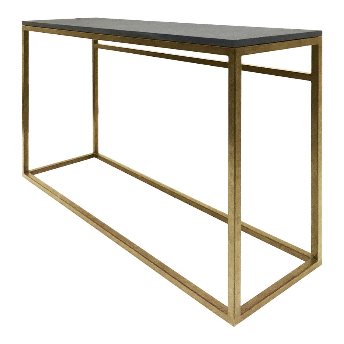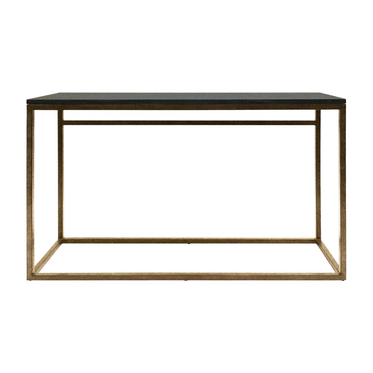 The Libra Kirkstone Iron Console Table combines contemporary clean lines with stability and robustness. The deep colour of the galaxy slate is the perfect foil for the subtle metallic of the frame of the table and is the perfect setting for any items you may want to place on top of its matt-finished top. Metal meets stone in this charming console table which has been finished in antique champagne tones. With its rustic allure, this large characterful piece is a fantastic addition to any contemporary living space. With a width of 139.6cm and height of 82cm, this may be suited to larger spaces. Dimensions: W: 139.6 x D: 82 x H: 40.6 cm Materials: Iron, Marble Assembly Required: No Care Instructions: Dust with a clean, lint free cloth