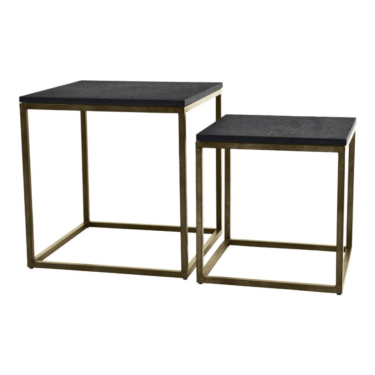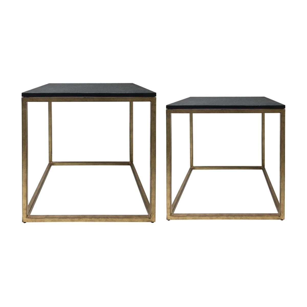 Sometimes good things come in pairs, and this is exactly the case with the Libra Kirkstone Iron Set of 2 Side Tables in Aged Champagne Finish with Galaxy Slate. The contemporary clean lines fit any scheme within the home. ##The soft sheen of the champagne metallic finish meets the rustic finish of the slate top, creating a gorgeous table which could have a variety of uses around the home. As well as being able to be used as separate tables, both also nest together should space be needed. The larger of the two sits at 56cm high by 56cm wide. Dimensions: W: 56 x D: 56.5 x H: 56 cm Materials: Iron, Marble Assembly Required: No Care Instructions: Dust with a clean, lint free cloth