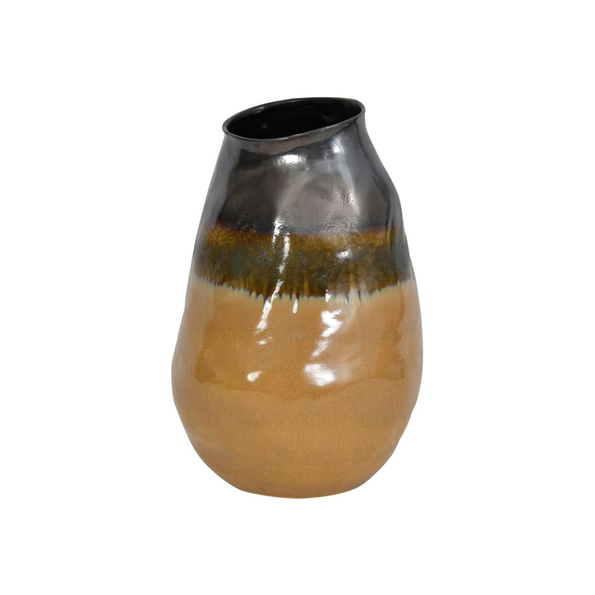 The craftsmanship in this Libra Selma vase makes it truly unique. Made from earthenware, it has an organic shape which matches its rustic colours; an array of earthy hues is seen throughout the vase, including ocres, tans, golds and graphite. It is the reactive glaze however that creates a different effect on each vase and makes your vase one-of-a-kind, along with its asymmetrical opening which adds to the organic feel.##Standing at 50cm tall with a width and depth of 30cm each, the vase will command attention for its form and patination. It will be a stunning addition to your home. Dimensions: W: 30 x D: 30 x H: 50 cm Materials: Fine Earthenware Assembly Required: No Care Instructions: Dust with a clean, lint free cloth