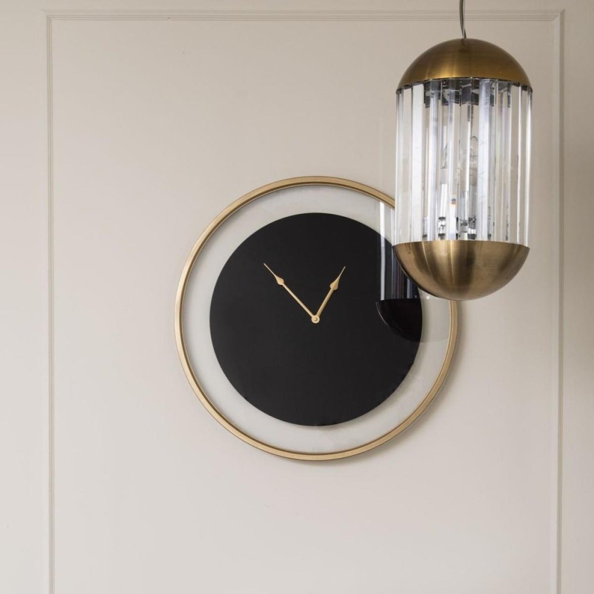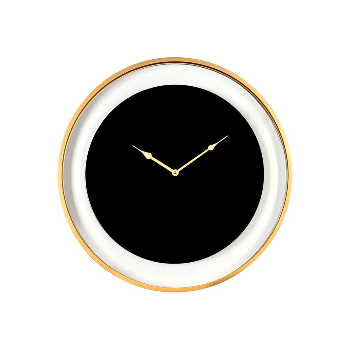 Stylish and practical, this sleek modern style wall clock from Libra will give a great look to your room. With its round face, a black centre with a white frame, matt gold border and elegant gold fingers, the clock has a minimal look with no digits on the clock face. Perfect for any home which takes style and elegance and a sophisticated modern look as its interior design. The clock measures 60cm wide and 60cm long and has a depth of 5cm. Put this clock in the lounge or dining room, and use other stylish accessories to complete the look. Dimensions: W: 60 x D: 5 x H: 60 cm Materials: 70% Mirror, 30% Iron Assembly Required: No Care Instructions:Dust with a clean, lint free cloth