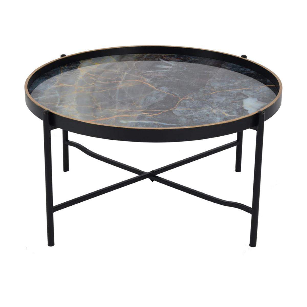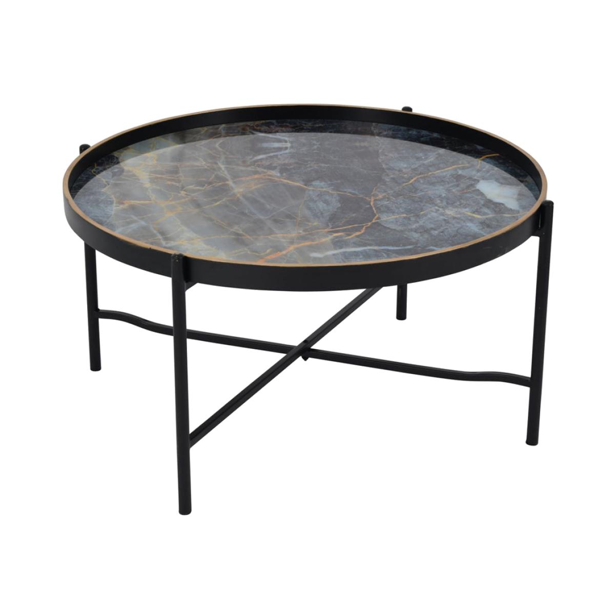 The newest addition to Vesuvius, this, statement coffee table is designed to compliment our best selling Set of 2 tray tables of the same collection. Measuring 90cm diameter, this large circular coffee table features a striking blue abstract pattern which will provide a splash of colour and talking point in your living space. The Vesuvius Coffee Table is finished in a beautiful black metal frame. The tray is removable and the base is foldable for storage. Completing the Vesuvius collection, this design is also available as a Set of 2 Nesting Side Tables and a Set of Coasters. Dimensions: H: 41 x W: 80 x D: 80 cm Materials: 40% MDF, 30% Glass, 30% Metal Assembly Required: No Care Instructions: Dust with a dry, soft cloth
