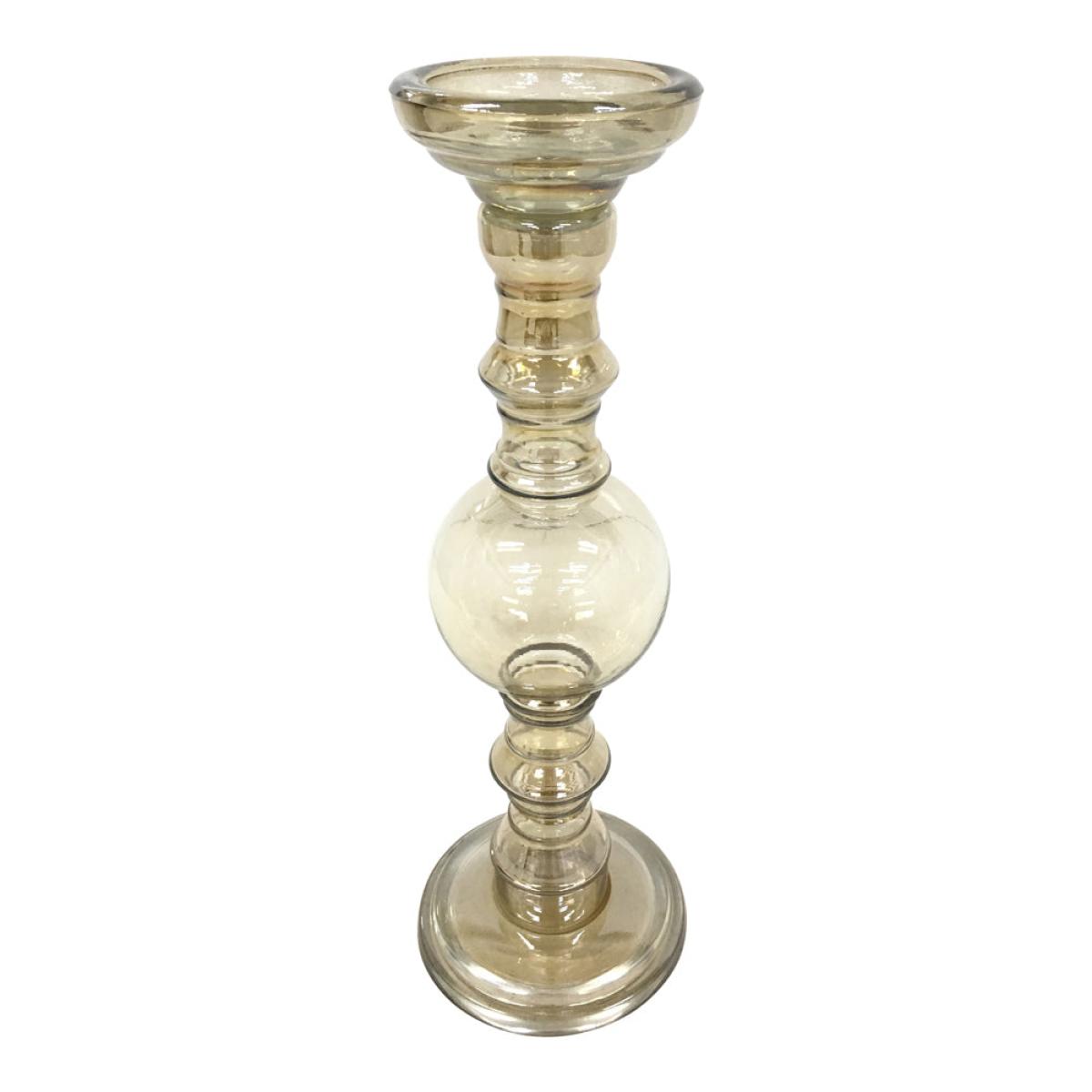 The intriguingly shaped Copper Lustre Candle Holder by Libra will add instant interest to any table or mantel in your home. Ornate and delicate, this stunning glass candle holder has a unique and w. View More. The intriguingly shaped Copper Lustre Candle Holder by Libra will add instant interest to any table or mantel in your home. Ornate and delicate, this stunning glass candle holder has a unique and warm smoky copper lustre finish. The elegant and intricate column shape is given extra interest thanks to a clear glass ball at its centre. The Copper Lustre Candle Holder - which measures 12. 5cm tall, 12. 5cm wide and 38cm deep - is versatile too, managing to be both classic and vintage at the same time. It can add a homely, romantic charm to your home décor, whether with or without a candle.