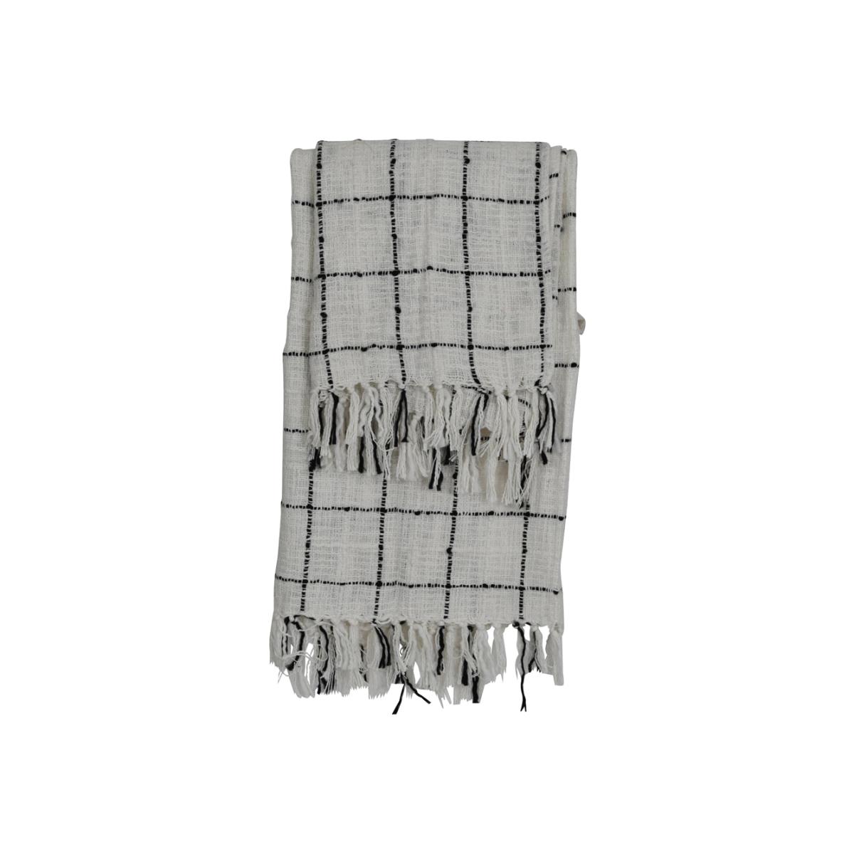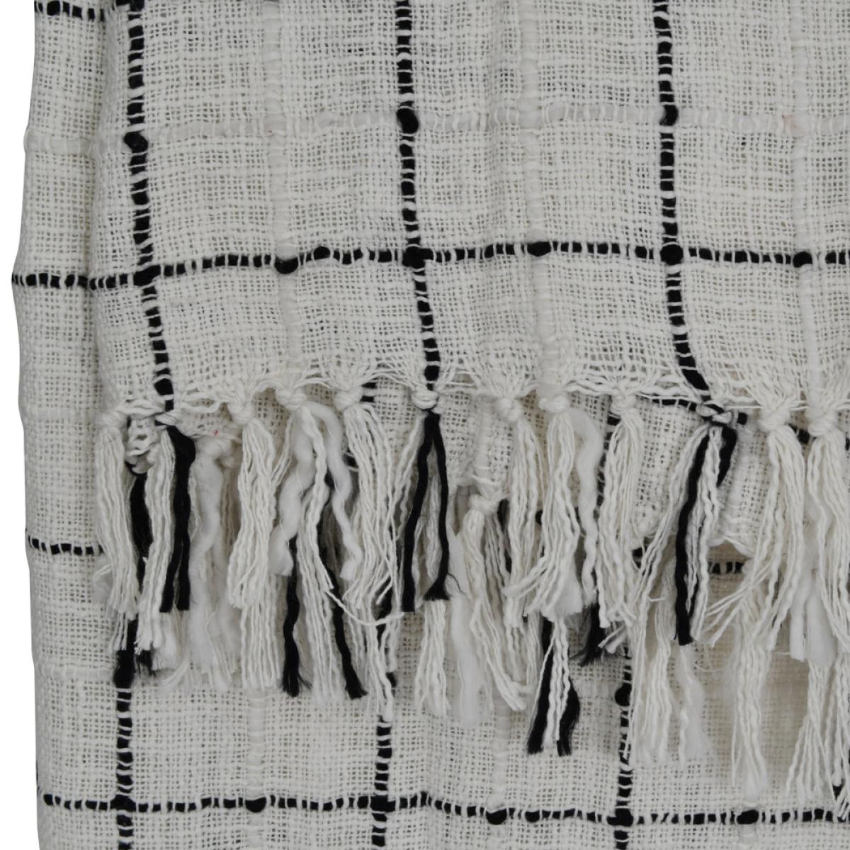 Made from 100% soft cotton this beautiful and timeless neutral throw is perfect all year round. With dimensions of W: 130 x D: 170 x H: 3 cm, this premium textile piece could be draped over a sofa. View More. Made from 100% soft cotton this beautiful and timeless neutral throw is perfect all year round. With dimensions of W: 130 x D: 170 x H: 3 cm, this premium textile piece could be draped over a sofa in the living room, or perhaps in a bedroom, on a chair or bed. Complementing all colour schemes, this breathable throw features a prominent black check design on an off-white background. Perfect for a relaxed neutral theme or to provide contrast amongst bolder colours. The tassel lined edge creates a sumptuous texture which is both soft to touch and pleasurable to behold.