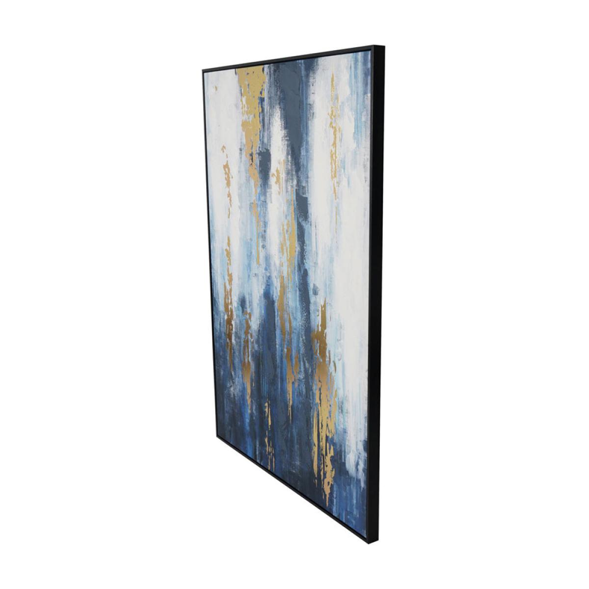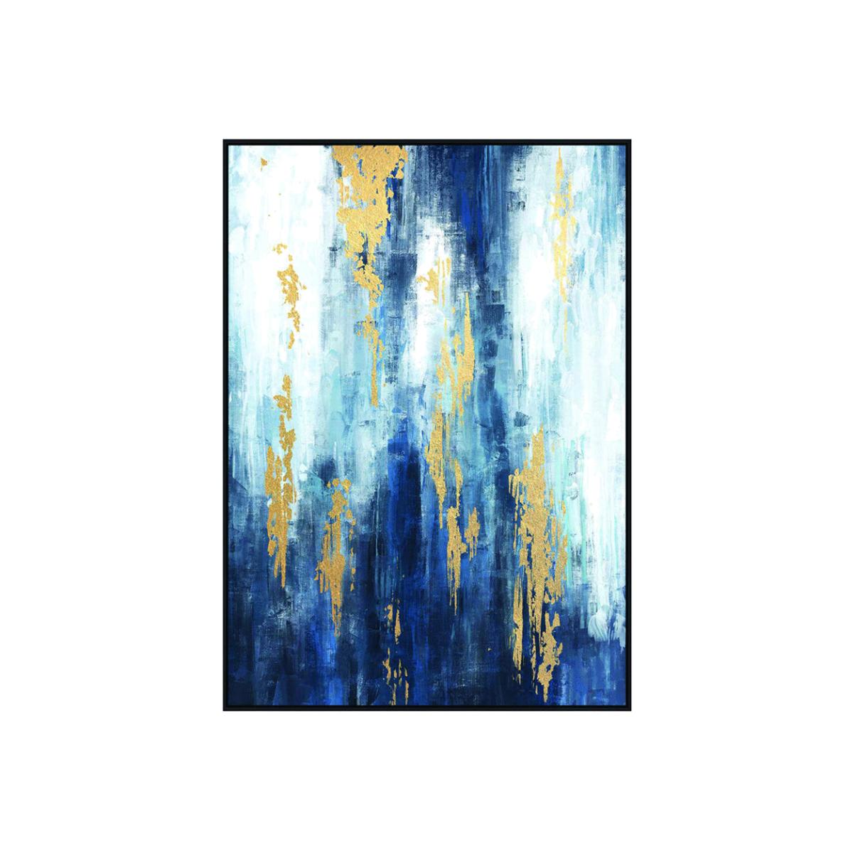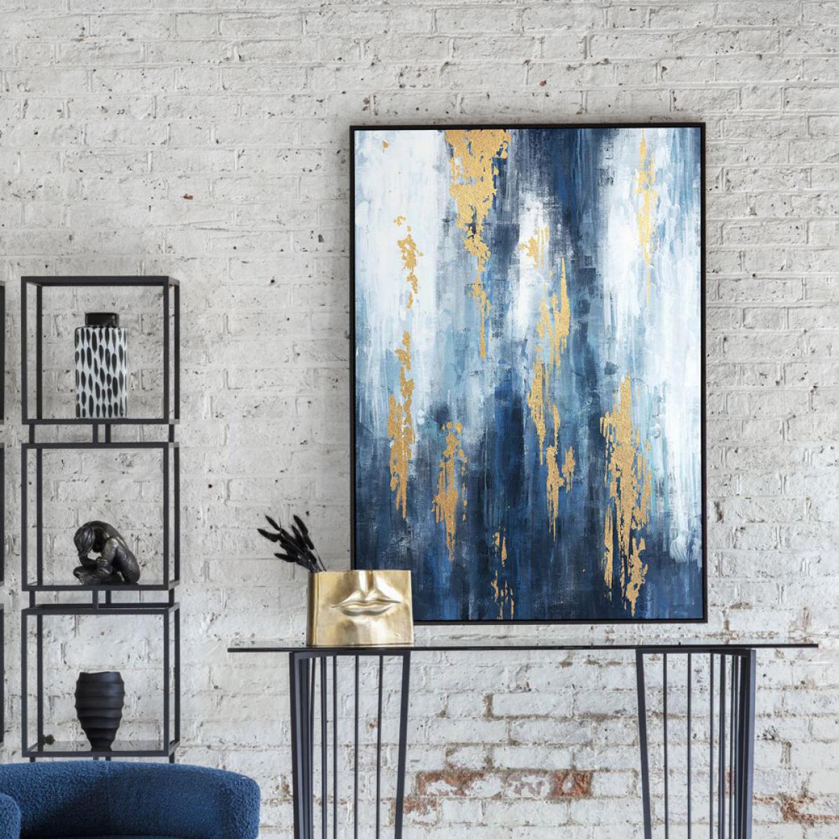 A Foiled Framed Canvas of abstract, painterly design with golden foiled finishing. Measuring 140cm x 100cm, the canvas is framed with a black wood effect frame. It hangs portrait only as shown on two integral hooks. Wall fixtures not included. Dimensions: H: 140 x W: 100 x D: 4 cm Materials: 40% Canvas, 20% PSFrame, 20% Wood. Frame, 10% Pi Assembly Required: No Care Instructions:Dust with a dry, soft cloth. Fixing Type: D-Ring. Orientation: Portrait