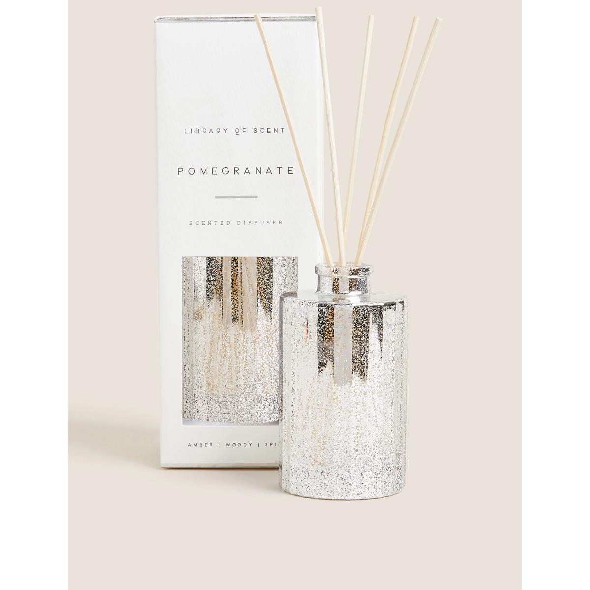Add our Library of Scent pomegranate diffuser to your home to release the irresistible scent of succulent berries. Layered with notes of warm amber and spice, this complex fragrance is the perfect way to refresh a room. It comes housed in a glass bottle with a stylish silver mercury finish that will blend subtly into any space. This fragrance is part of the Fruity family of fragrances. Fruity scents are refreshing and tropical and will often have notes of berries and non-citrus fruits such as pomegranate, apple and sweet pears.