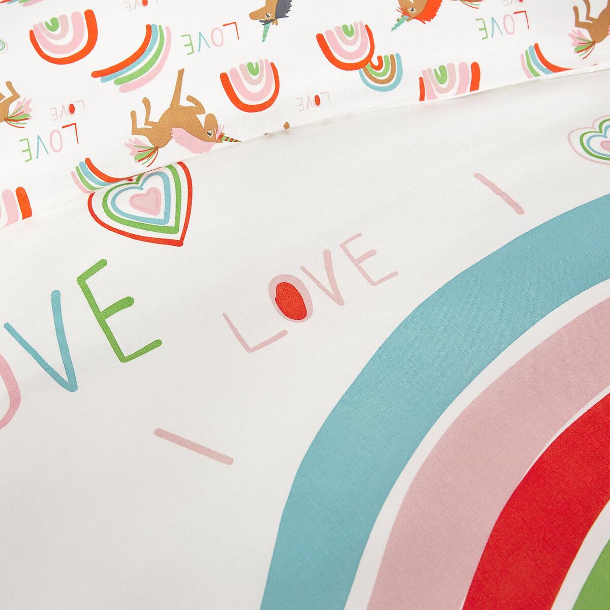 In the magical world of make-believe, little ones encounter all kinds of mythical animals in a myriad of rainbow colours, but the cutest by far has got to be the unicorn!!Made from organically-farmed cotton, this duvet cover is soft and kind to the skin. Product Details • 100% cotton • Organic cotton • 144 thread count • Unicorn and rainbow print on the front, mini unicorns printed on the reverse • Envelope-style opening. See the full Licorne range online. Care Advice • Machine washable at 60°C • By washing your laundry at 40°C instead of 60°C, you limit energy consumption. Dimensions • 140 x 150cm: Adjustable bed • 140 x 200cm: Single • Cotton from organic farming. Organic farming does not use any chemicals, pesticides, insecticides or GMOs. Produced with minimal impact on biodiversity. • OEKO-TEX® Standard 100. Standard 100 certification by OEKO-TEX® tests textile products for harmful substances via an independent, international label.