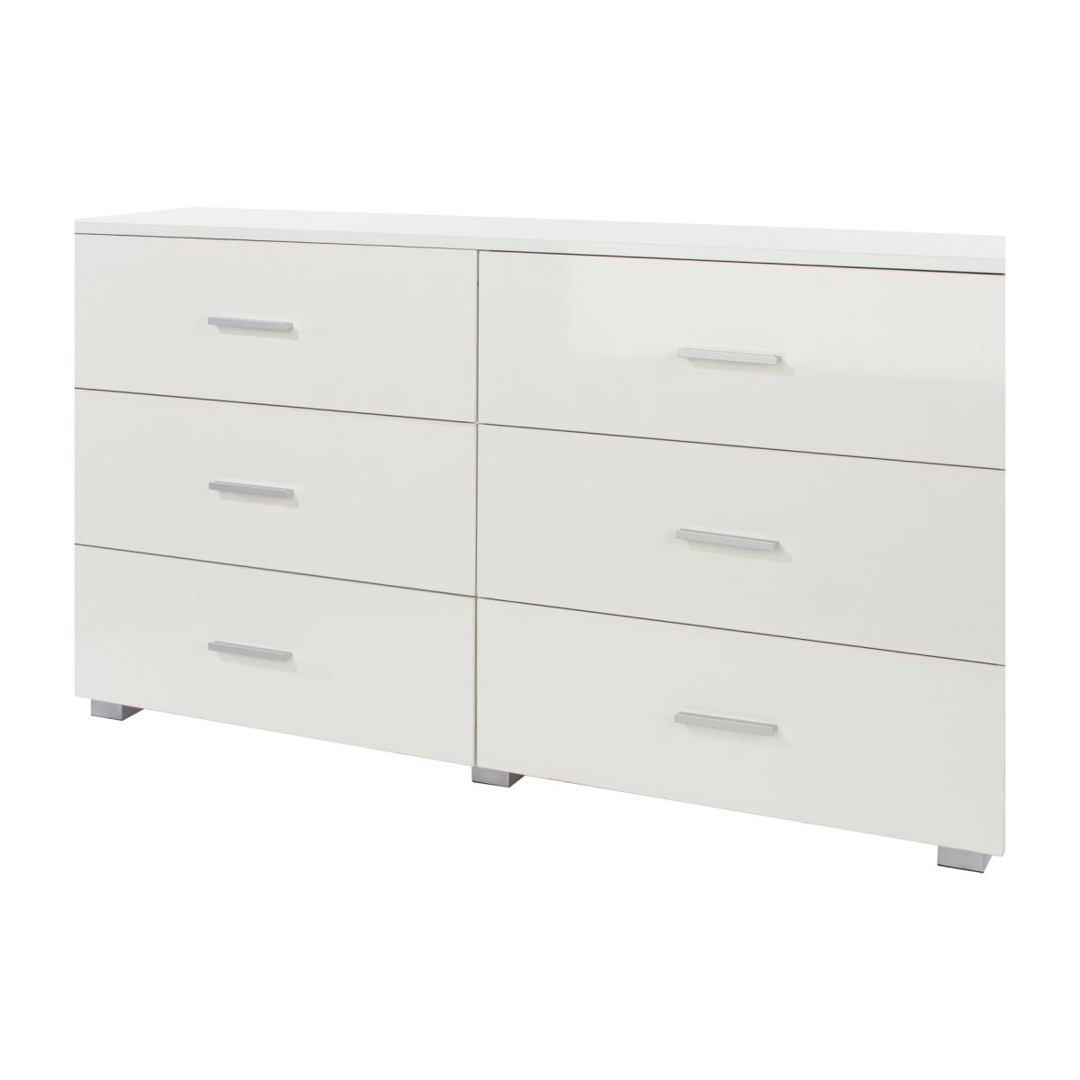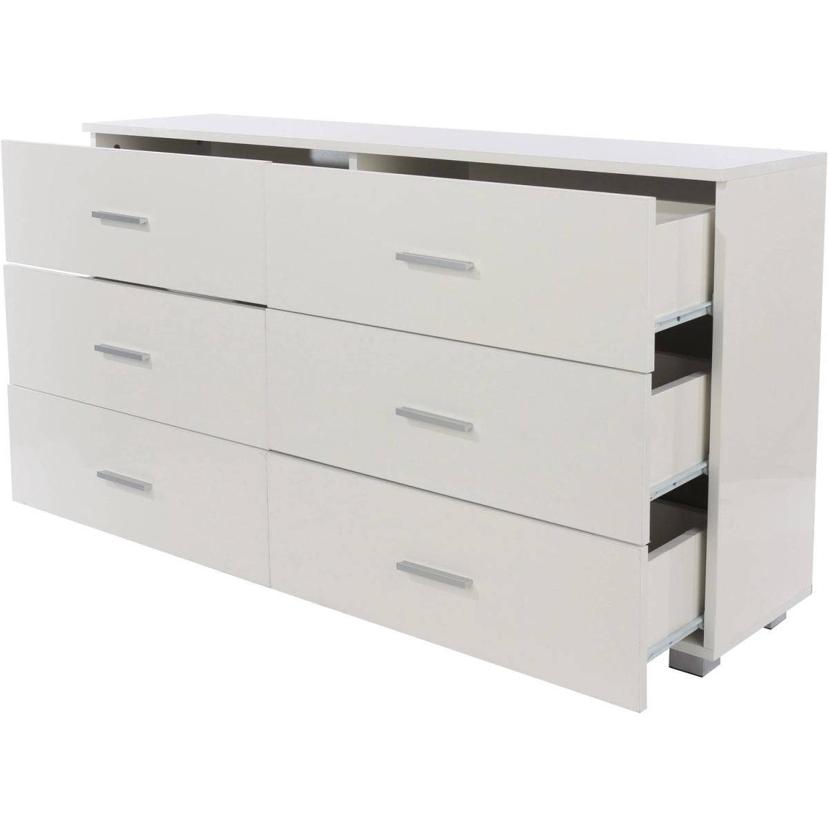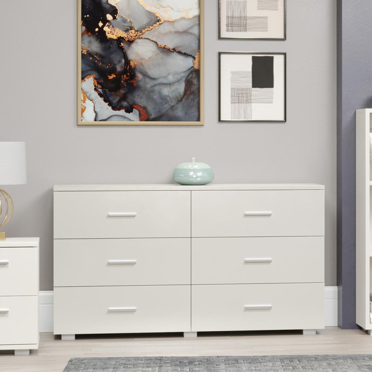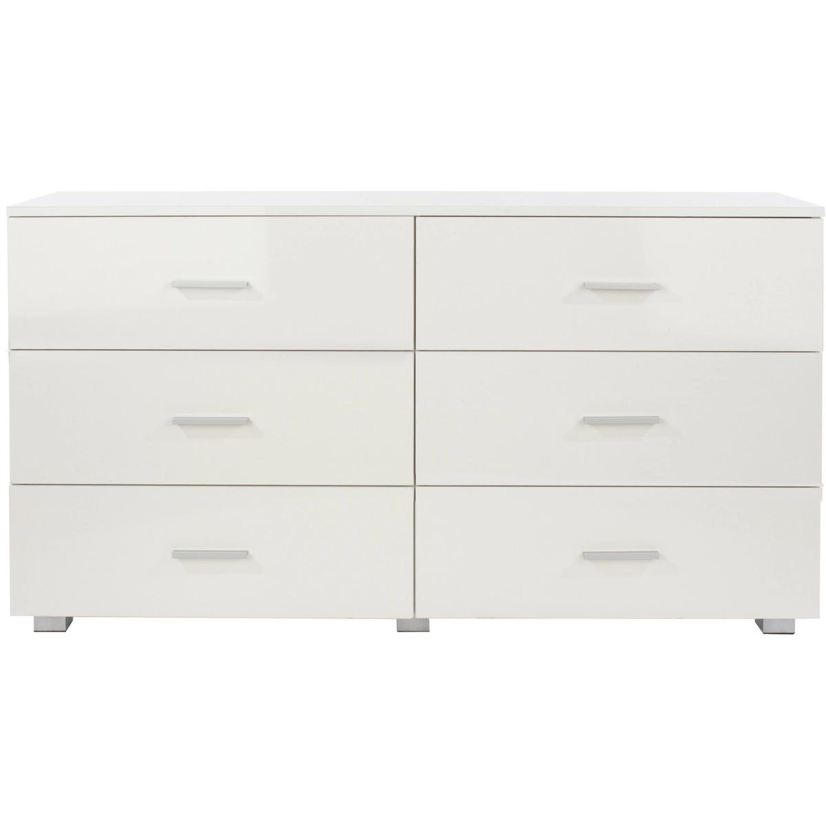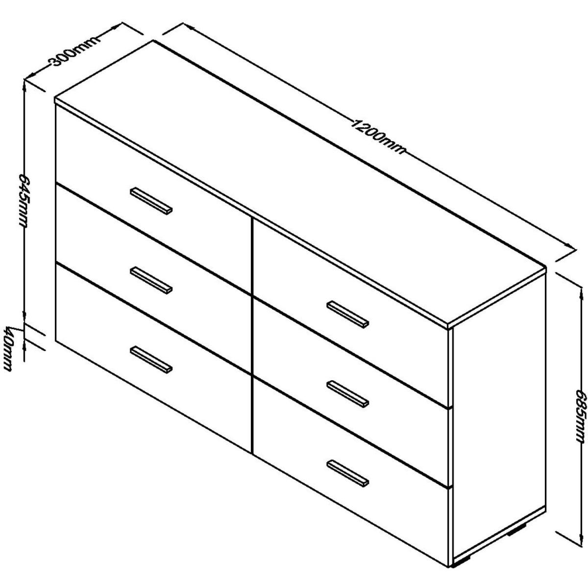 Our Lido range features a smooth high gloss white film finish which is stylish and on trend. The hardwearing finish is easy to clean and keep looking good. Matt silver effect handles and feet complete the look whilst the easy glide metal drawer runners make this ideal for everyday use. The 3 plus 3 wide chest of drawers gives you all the space you need to store your clothing and accessories in an organised fashion. The six drawers will house all your underwear, tshirts, jumpers or even towels and bedding, in fact anything you need to fold and tidy away.