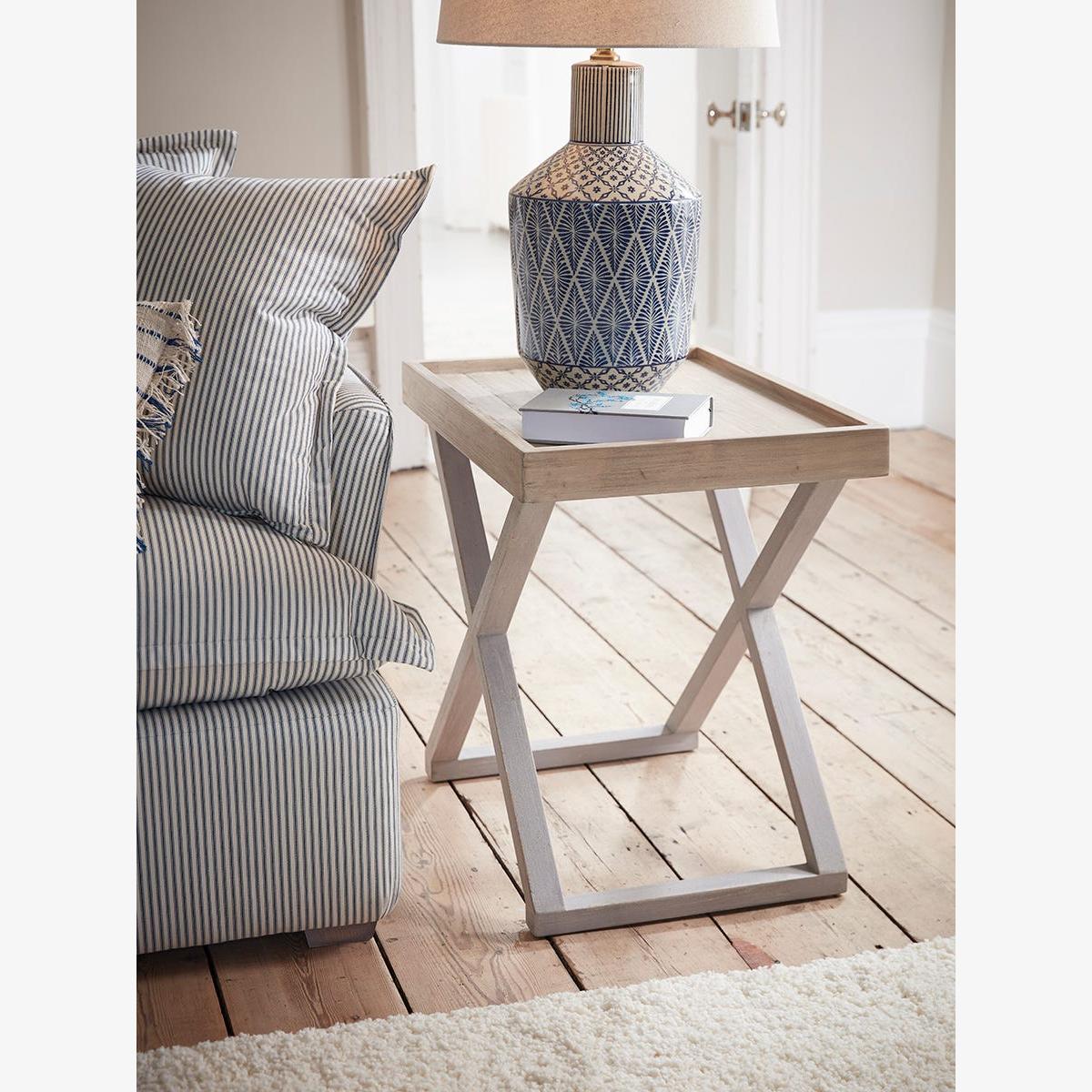 Designed to complement our Lien Coffee Table, but equally lovely placed on its own, our Lien side table mirrors the butlers tray lines. A cross-shaped frame in the softest grey wash is topped with a lipped table in natural pine. Position alongside your favourite armchair or beside a sofa as an essential resting place for drinks or a considered spot for a table lamp.