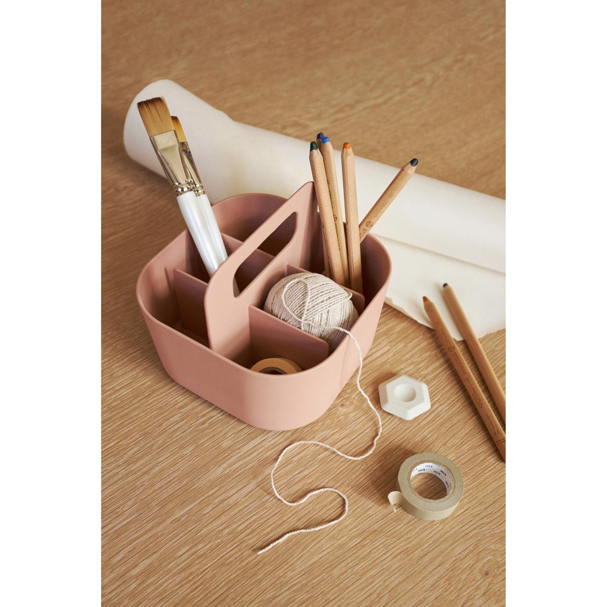 I love this little basket for its simple, clean design and versatile colour that works well in both modern and Scandinavian-inspired interiors. Its soft rose hue adds a gentle touch of colour without overpowering a space, making it ideal for organising toys, art supplies, or smaller household items. Practical styling tips include placing it on open shelves in a child's room or bathroom, or using it on a countertop for easy access. Its structured compartments provide organisation, while the handle offers portability. Overall, it's a functional yet stylish addition that balances form and function seamlessly.
