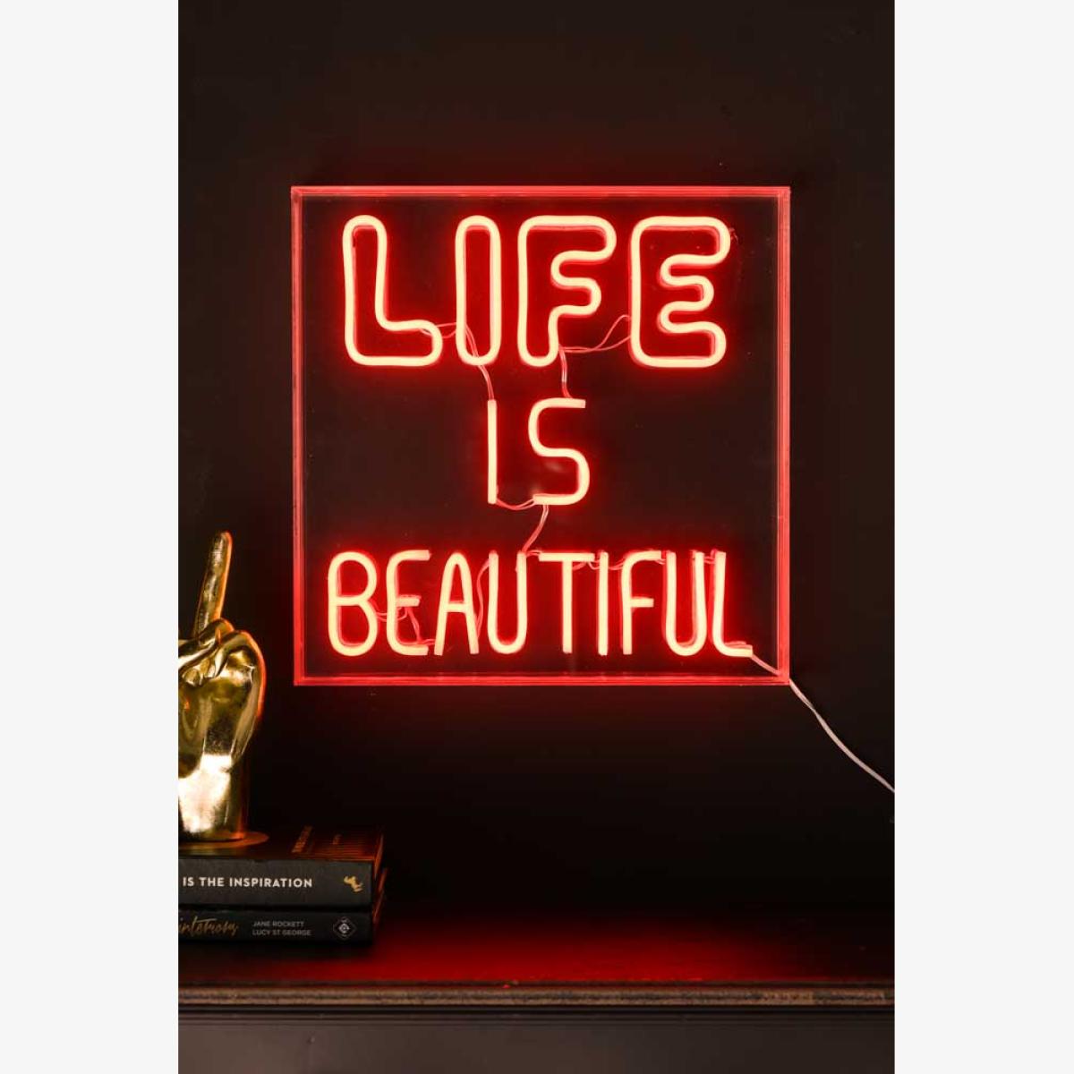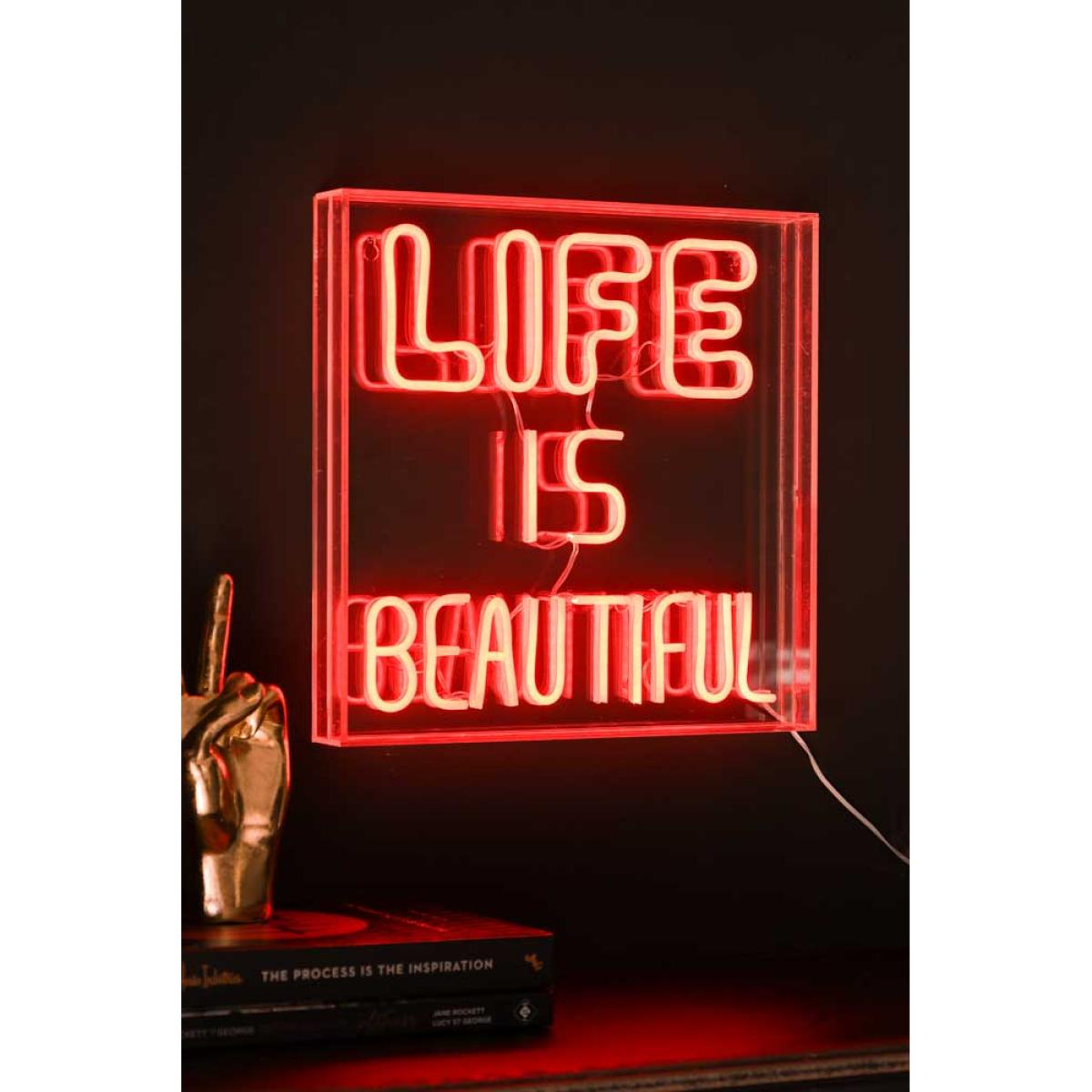 About The Life Is Beautiful LED Neon Acrylic Light Box The Life Is Beautiful LED Neon Acrylic Light Box introduces an important motto to live by to the walls of your home. Designed as a square acrylic box, the red LED lights inside reveal the words ‘Life Is Beautiful’ in fabulous bold fonts. Measuring 35cm x 35cm, the neon wall sign comes with a 1.75 USB cable, complete with a useful dimmer switch, so you can create the perfect ambience. Please note that this product is delivered with a USB lead only, and a plug will need to be sourced separately. Why We Think You’ll Love The Life Is Beautiful Neon Light Introducing a healthy dose of nostalgia and disco drama, neon lights are a must-have statement piece for the home. Ideal for showcasing your personality, our collection of neon wall signs ensures a quirky phrase or essential life slogan for everyone. Designed to be styled on a shelf or installed on the wall, the Life Is Beautiful Neon Light encourages you to live your best life every damn day! How To Style The Life Is Beautiful Neon Sign The Life Is Beautiful LED Neon Acrylic Light Box looks great in every room of the house from the kitchen to your hallway or living space. Style yours in darker north-facing spaces to create a glamorous night-club look after dark, or introduce the sign to a gallery wall as a unique take on neon art.