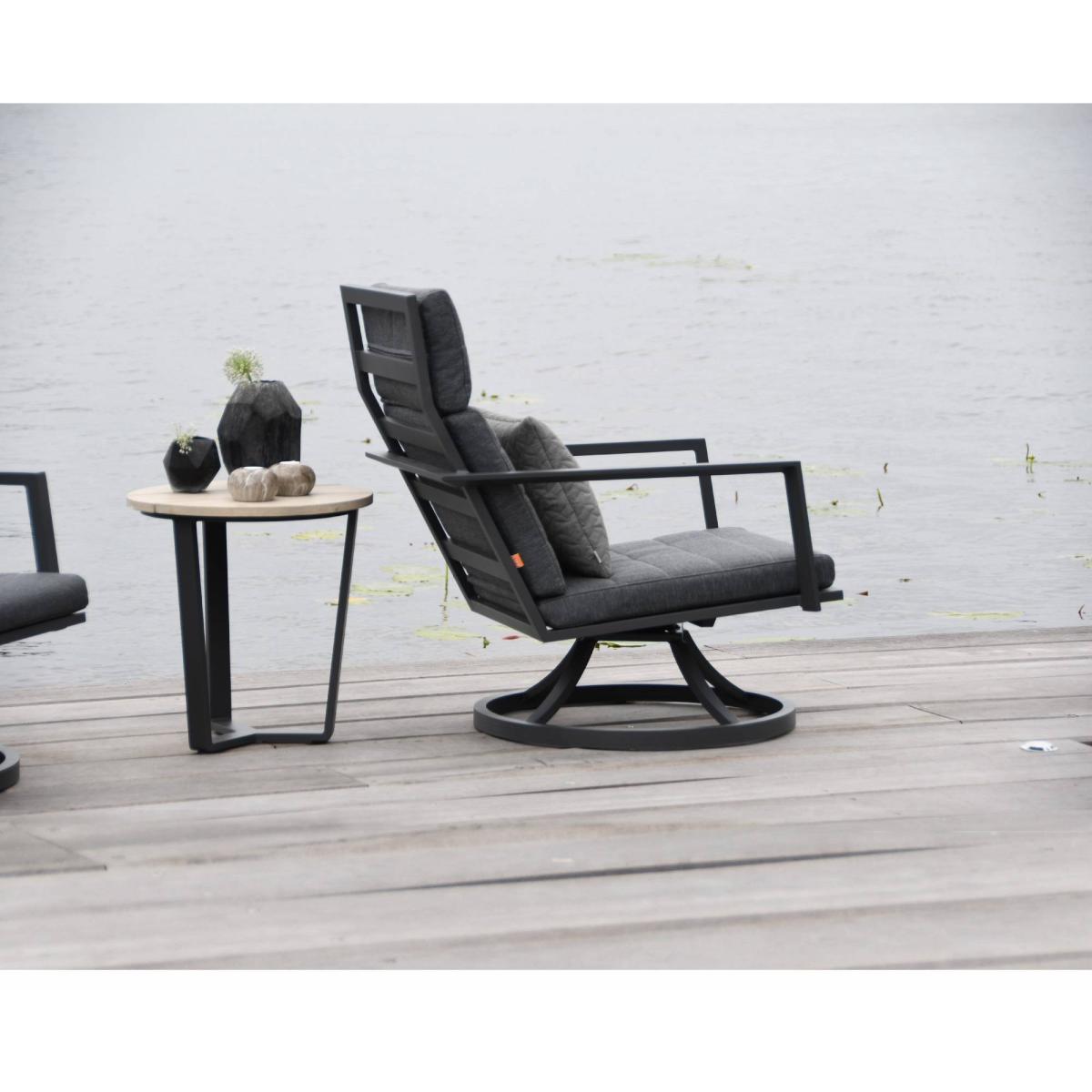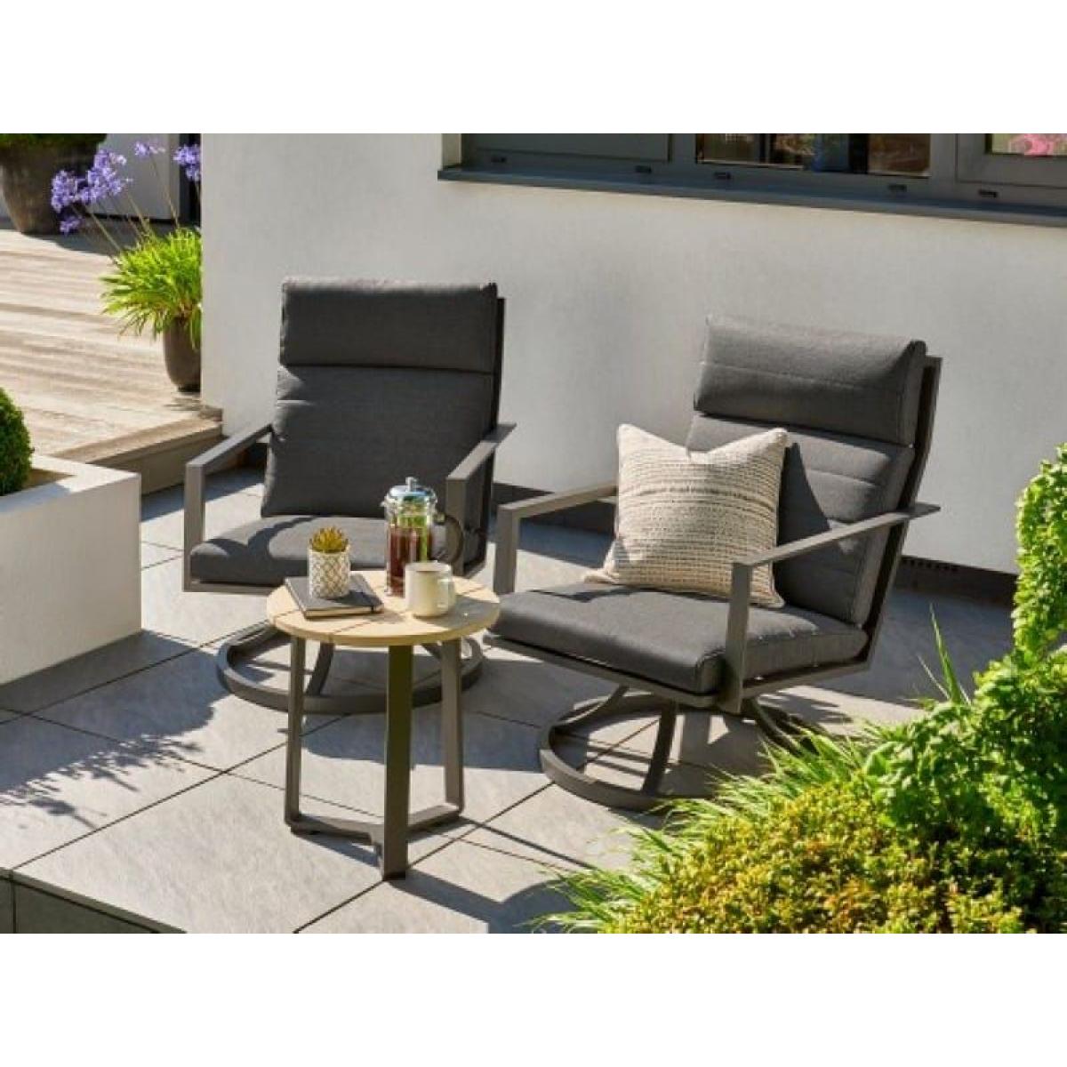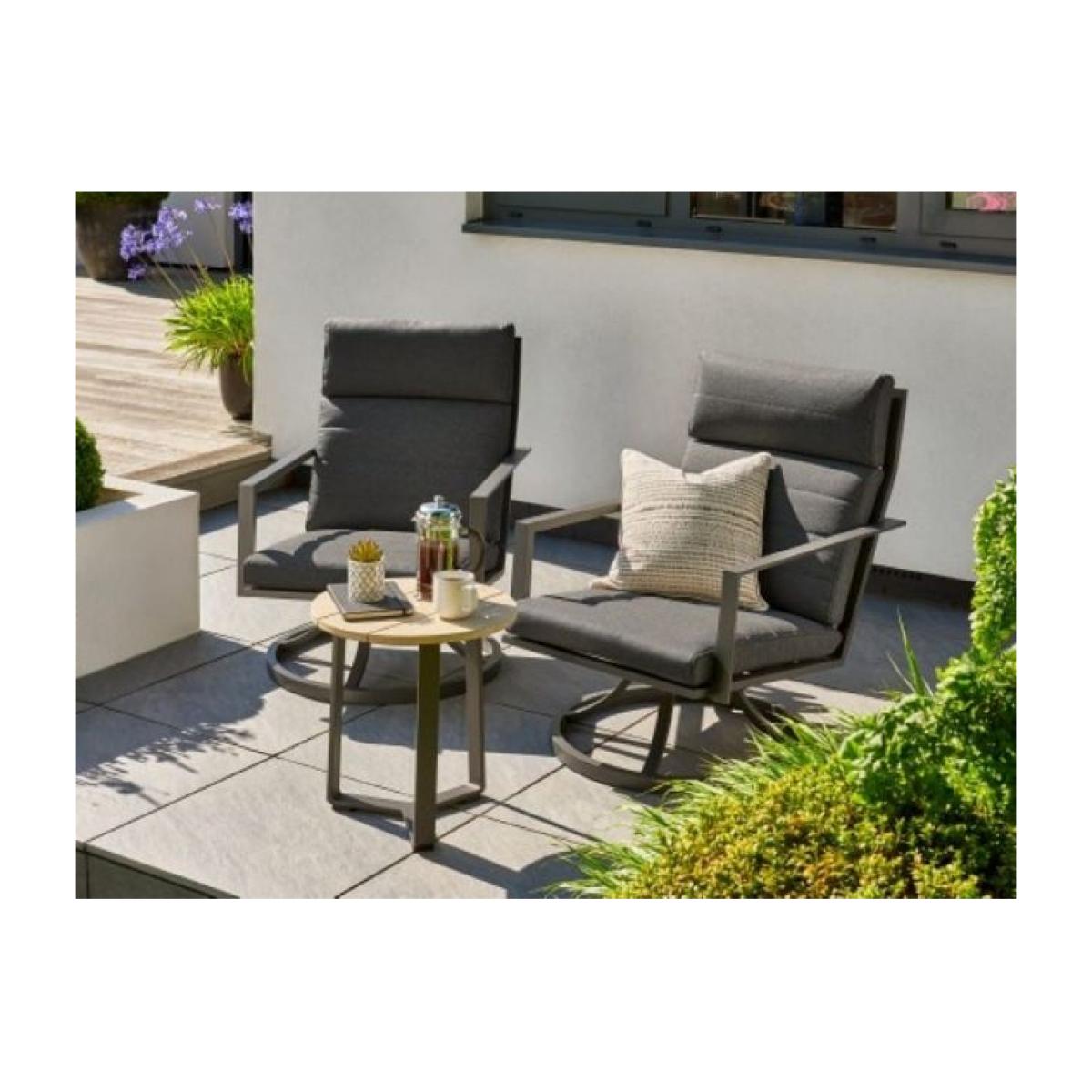 Made from robust materials, the LIFE Maroon Lounge Set, is a contemporary set that can be left out all year round, with soft durable cushions that can be kept in place all summer season.  The chair rotates 360 degrees so you can easily turn with the sun. So sit back and unwind with a book or drink this summer. Made from aluminium, this set is virtually maintenance free and only requires a small amount of attention to keep it looking its best. It does not need to be covered when not in use, as aluminium is weather resistant. Set Includes: 1 x Amazone Lounge Coffee Table 2 x Maroon Turning Chair Low Maintenance Modern Design 5 year manufacturer's limited warranty. Dimensions: Chair 88cm L x 66cm D x 86cm H Coffee Table 45cm W x 45cm D x 50cm H Please note scatter cushions and accessories are not included