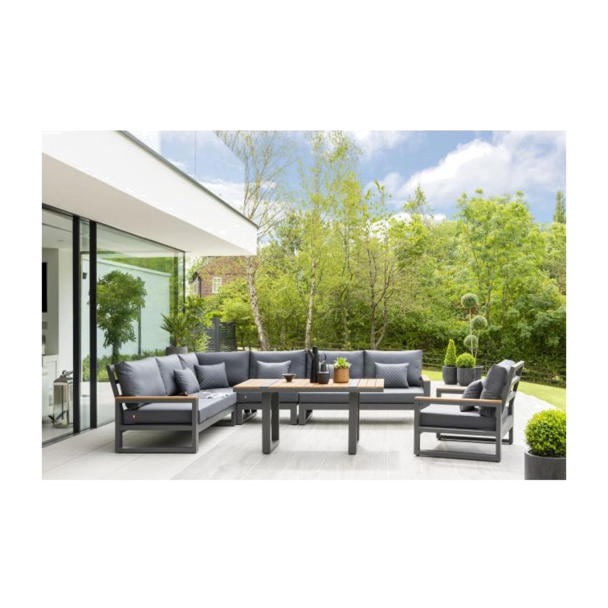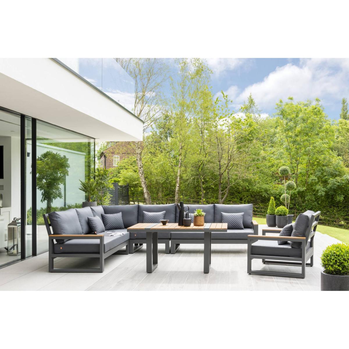 Brand new for Summer 2022 is the LIFE Soho High Back Corner Set with Dining Table. One of our absolute new favourites for the summer, this sleek and streamlined corner group would look fantastic in your outdoor space. The high table is perfect for al fresco dining or for holding your evening drinks and nibbles. The set consists of an open bench left, open bench right, corner section, extension section, one armchair and a high coffee table. The extension section could be used on either side of the corner or even on its own as an armless chair. This generous amount of seating ensures room for your friends and family to relax and enjoy the sunshine. The ultra-modern carbon-coloured cushions beautifully compliment the teak table top and teak decor on the arms of the seating. The aluminium frame is finished in a lava colour. The great thing about LIFE cushions is their All-Weather technology. This is a cushion that can be left outdoors throughout the entire season. The cushions are produced from high-quality synthetic products; when it rains the water goes through the cushion cover and into the inner cushion. By pressing down on the cushion or placing the cushions on their sides, the cushions will be dry in a relatively short period of time. The high back offers maximum comfort when sitting back and enjoying your open space. Weather influences will make the robust teak wood slowly turn grey. If you want to prevent this, you may use the LIFE Outdoor Living Teak Protector. By using this product you will get a warm brown colour. Other Recommended maintenance products: LIFE Outdoor Living Teak Cleaner, Teak Shield & Textilene Cleaner. As teak wood is a natural product, it must 'breathe' - to prevent moulding, it is not recommended that protection covers are used with teak products. For more information about Teak wood and to read more about caring for your Teak furniture please click here.