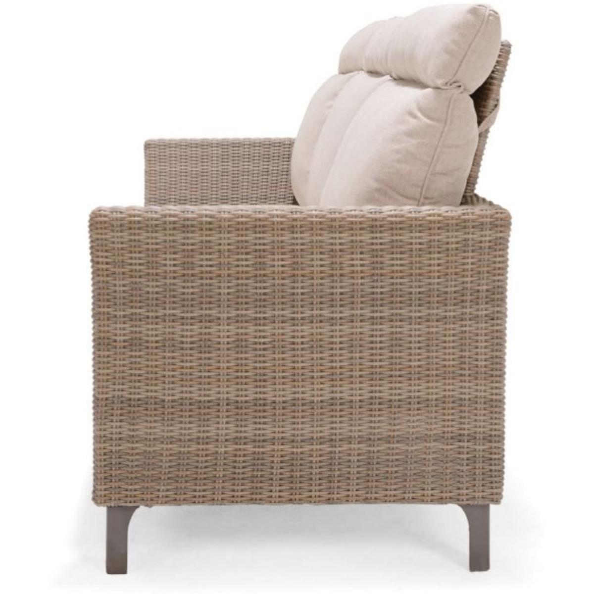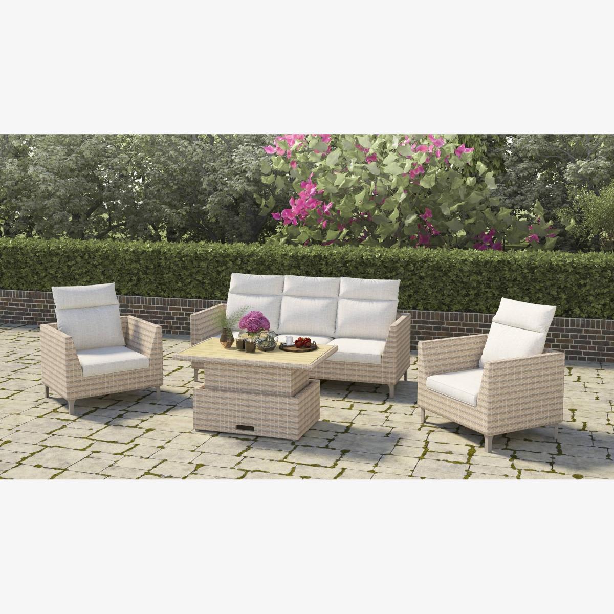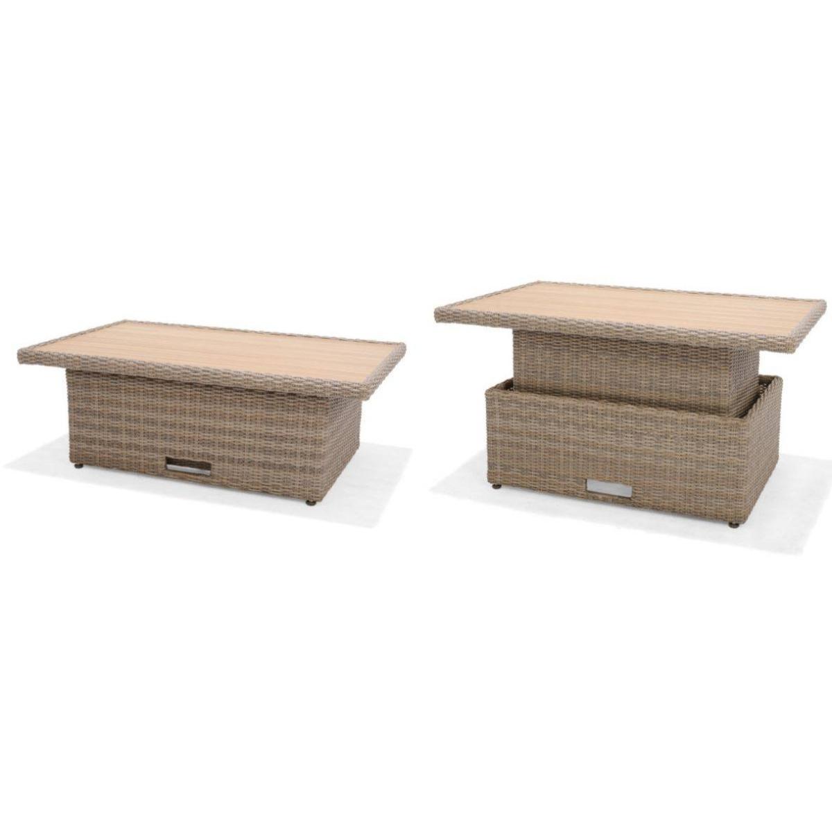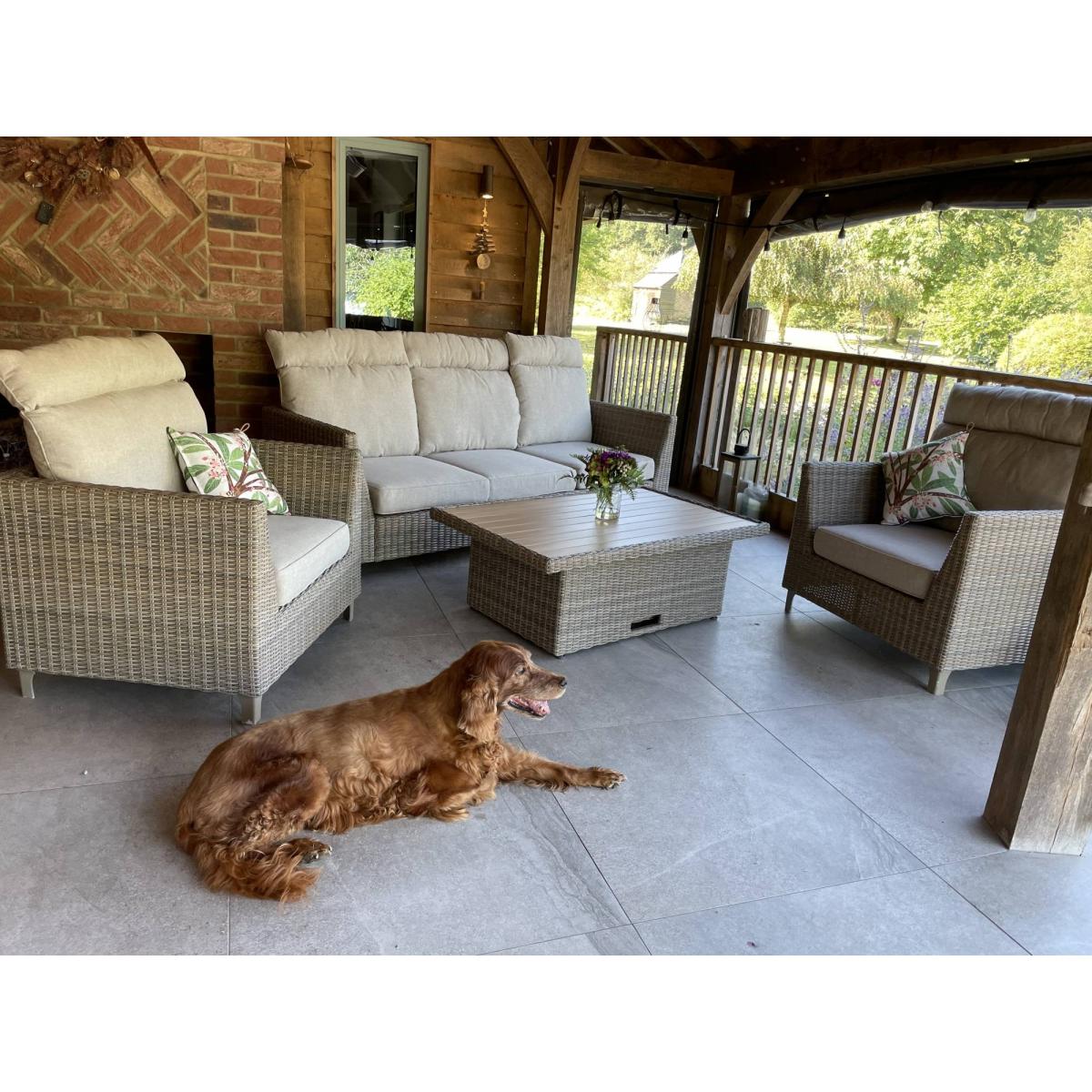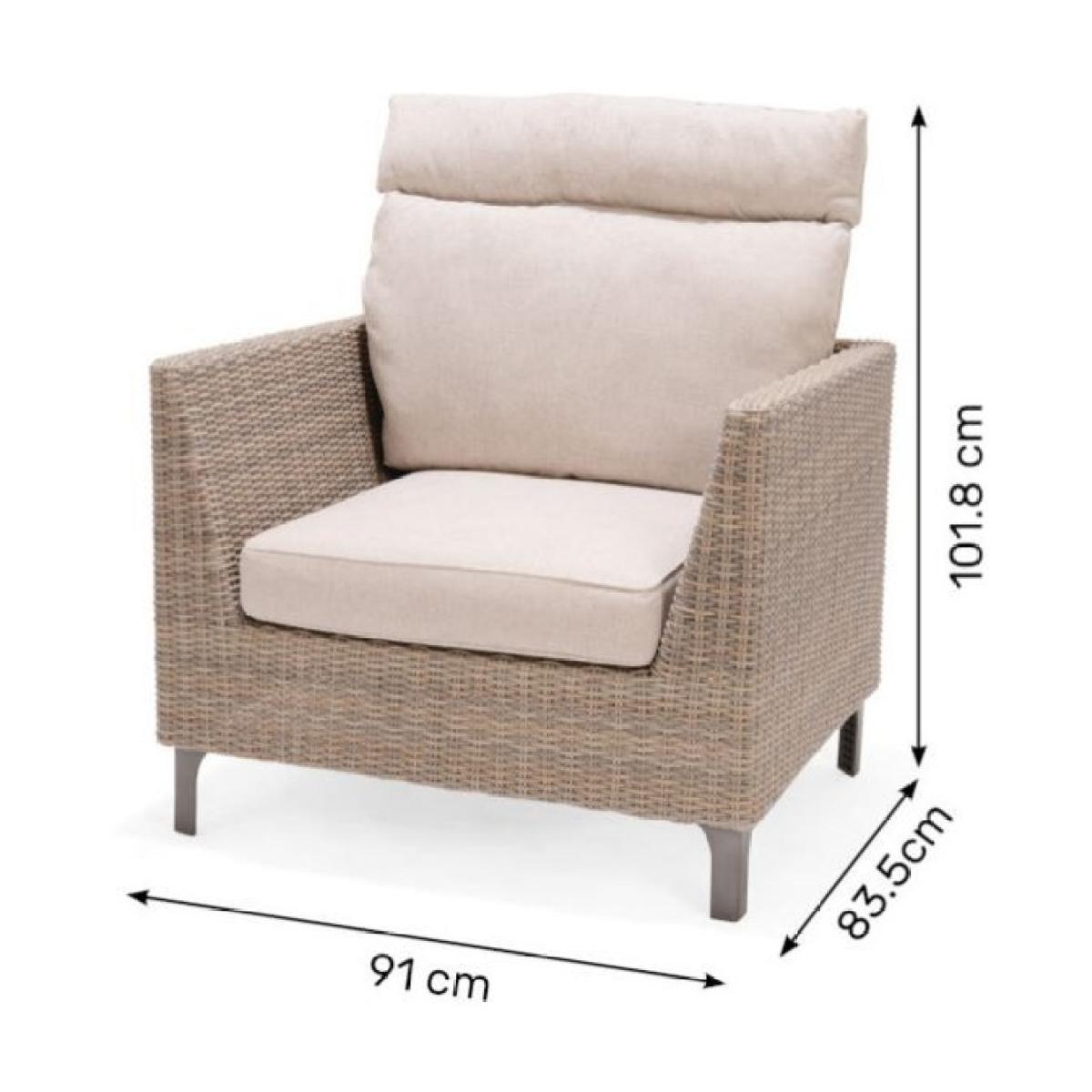 Bermuda Light high back coffee set just confidently boasts the splendour of the deep-rooted tradition with its simple yet elegant high back cushions mixed with the clean cuts of the modern times. The set not only enhances the character of your patio but also enhances the comfort you experience with high-density padding while the high back eases the tension of your shoulder and neck. Both seat and back cushion are supported with sturdy frames and high-quality synthetic wicker, which makes the set light in weight, weather resistant, insect resistant, and easy to clean. In the centre is a small height-adjustable coffee table with durable aluminium table top, ensuring your food and drinks are well presented and supported. Dimensions: Sofa chair: W 91cm x D 84cm x H 102cm 3 Seater Sofa:W 215cm x D 84cm x H 102cm Adjustable Table:W 120cm x D 77cm x H 43cm/66cm Additional Information: Cushion's should be stored indoors. Clean table and chairs with warm soapy water. This product is very low maintenance. 5 Year Manufacturers Warranty on the frame & wicker 3 Year Manufacturers Warranty on the table top 2 Year Manufacturers Warranty on the cushions Please note, all screens vary in colour reproduction and whilst every effort has been made to display the colour as accurately as possible it is for guidance only.