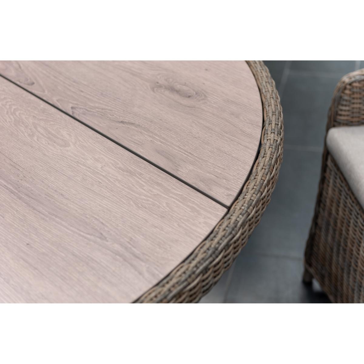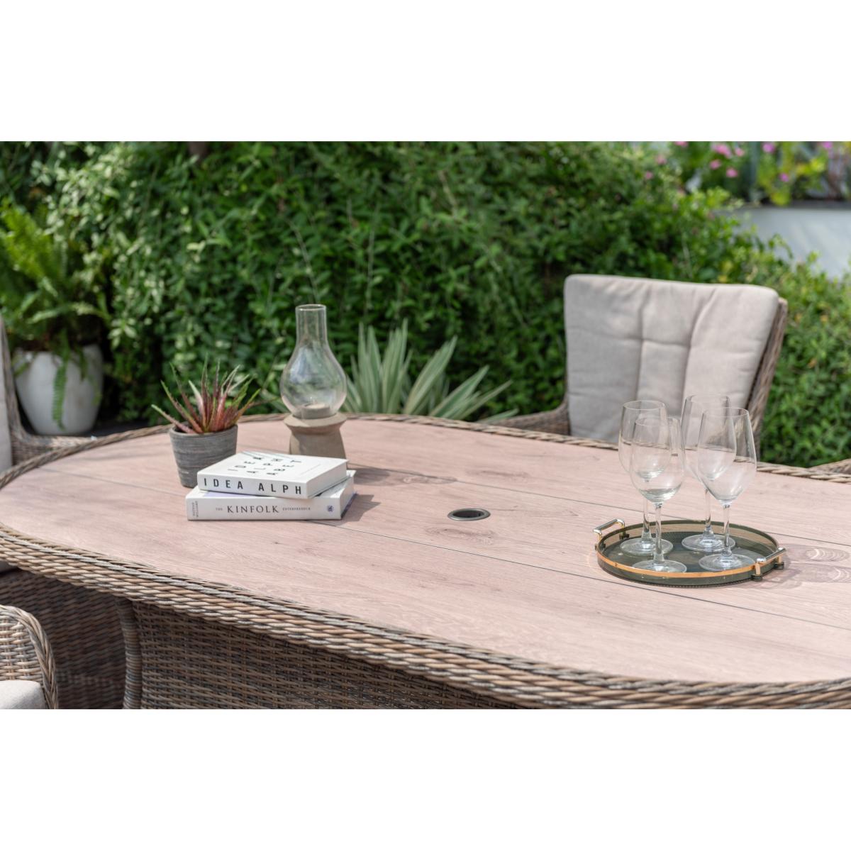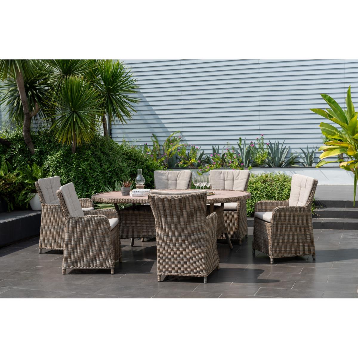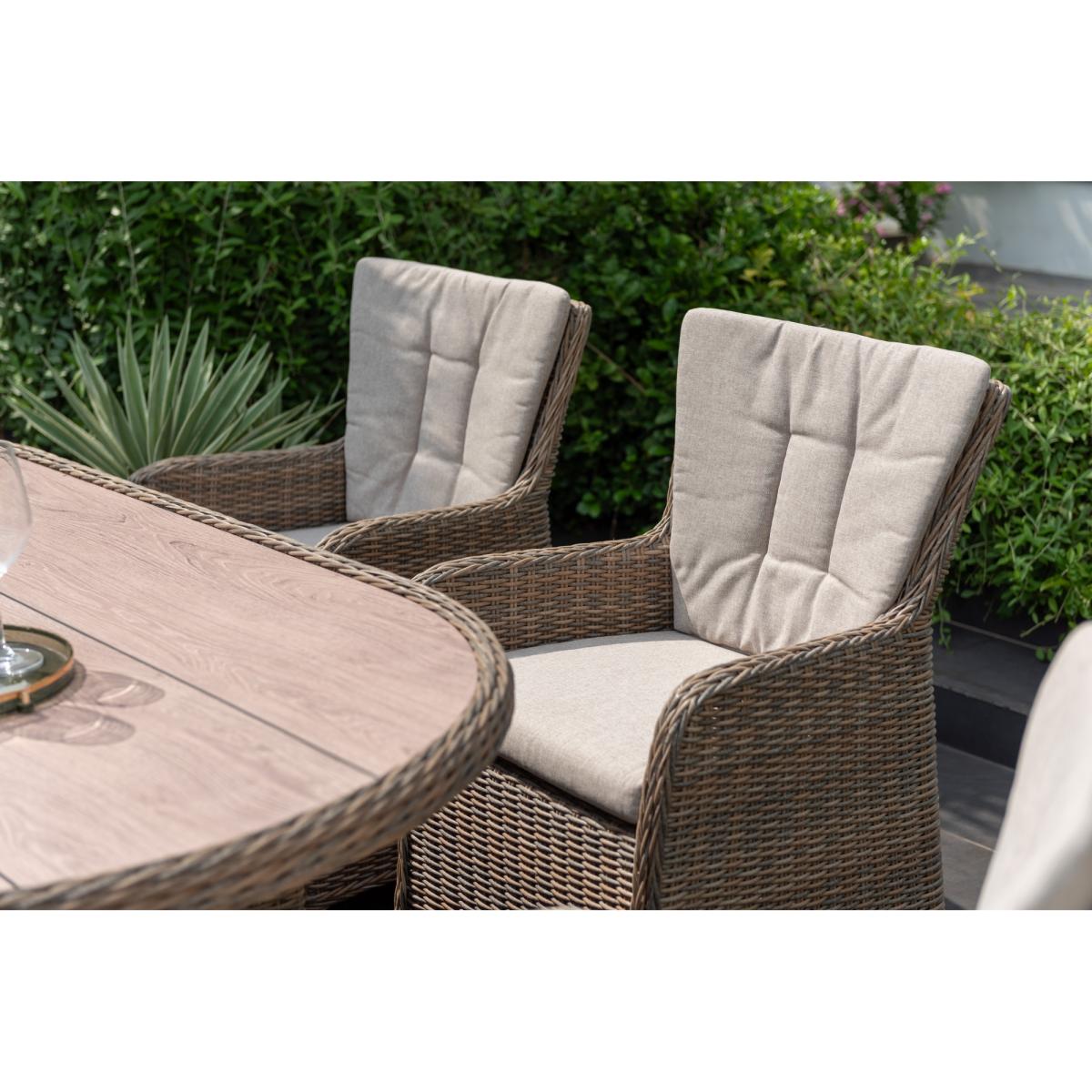 The Martinique 6 Seat Oval Dining Set offers an ideal solution for larger gatherings or family meals. The Martinique Carver Chairs provide enhanced comfort with their soft Olefin cushions, ensuring a comfortable dining experience. Paired with the Martinique oval table, crafted from durable woven Petan, this set also includes a convenient storage space in the centre. Whether hosting a festive dinner or enjoying a casual meal, this set combines timeless elegance with practical features, making it perfect for any outdoor occasion. KEY FEATURES: Set includes: 6 x Martinique carver chairs, 1 x Martinique oval table Synthetic rattan weave UV and frost-resistant Can be left outside all year round (except cushions). Aluminium frames Easy to clean: clean with a non-abrasive sponge and detergent-free soapy cleanser and rinse thoroughly. We recommend storing the cushions in a dry, ventilated space when not in use. If storing cushions or fabric inside, allow to dry completely before storing. 5 year manufacturer's warranty DIMENSIONS: Chairs: Height: 94cm Width: 62cm Depth: 65cm Oval Table: Height: 111cm Width: 207cm Depth: 16cm Please note, all screens vary in colour reproduction and whilst every effort has been made to display the colour as accurately as possible it is for guidance only. Scatter cushions and accessories pictured are for demonstration purposes only and are not included.