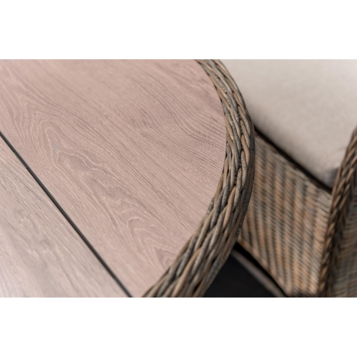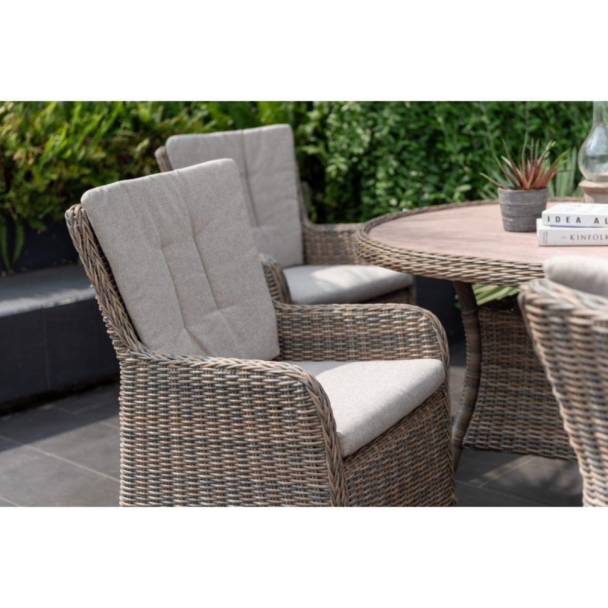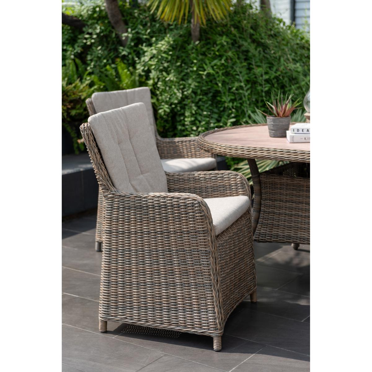 The Martinique 6 Seat Oval Dining Set offers an ideal solution for larger gatherings or family meals. The Martinique Carver Chairs provide enhanced comfort with their soft Olefin cushions, ensuring a comfortable dining experience. Paired with the Martinique oval table, crafted from durable woven Petan, this set also includes a convenient storage space in the centre. Whether hosting a festive dinner or enjoying a casual meal, this set combines timeless elegance with practical features, making it perfect for any outdoor occasion. KEY FEATURES: Set includes: 6 x Martinique carver chairs, 1 x Martinique oval table Synthetic rattan weave UV and frost-resistant Can be left outside all year round (except cushions). Aluminium frames Easy to clean: clean with a non-abrasive sponge and detergent-free soapy cleanser and rinse thoroughly. We recommend storing the cushions in a dry, ventilated space when not in use. If storing cushions or fabric inside, allow to dry completely before storing. 5 year manufacturer's warranty DIMENSIONS: Chairs: Height: 94cm Width: 62cm Depth: 65cm Oval Table: Height: 111cm Width: 207cm Depth: 16cm Please note, all screens vary in colour reproduction and whilst every effort has been made to display the colour as accurately as possible it is for guidance only. Scatter cushions and accessories pictured are for demonstration purposes only and are not included.