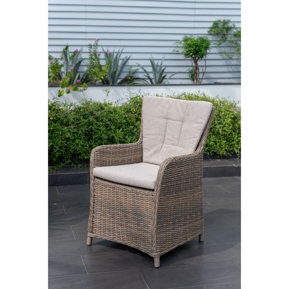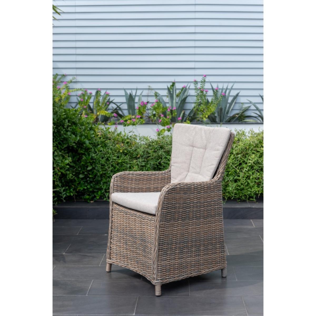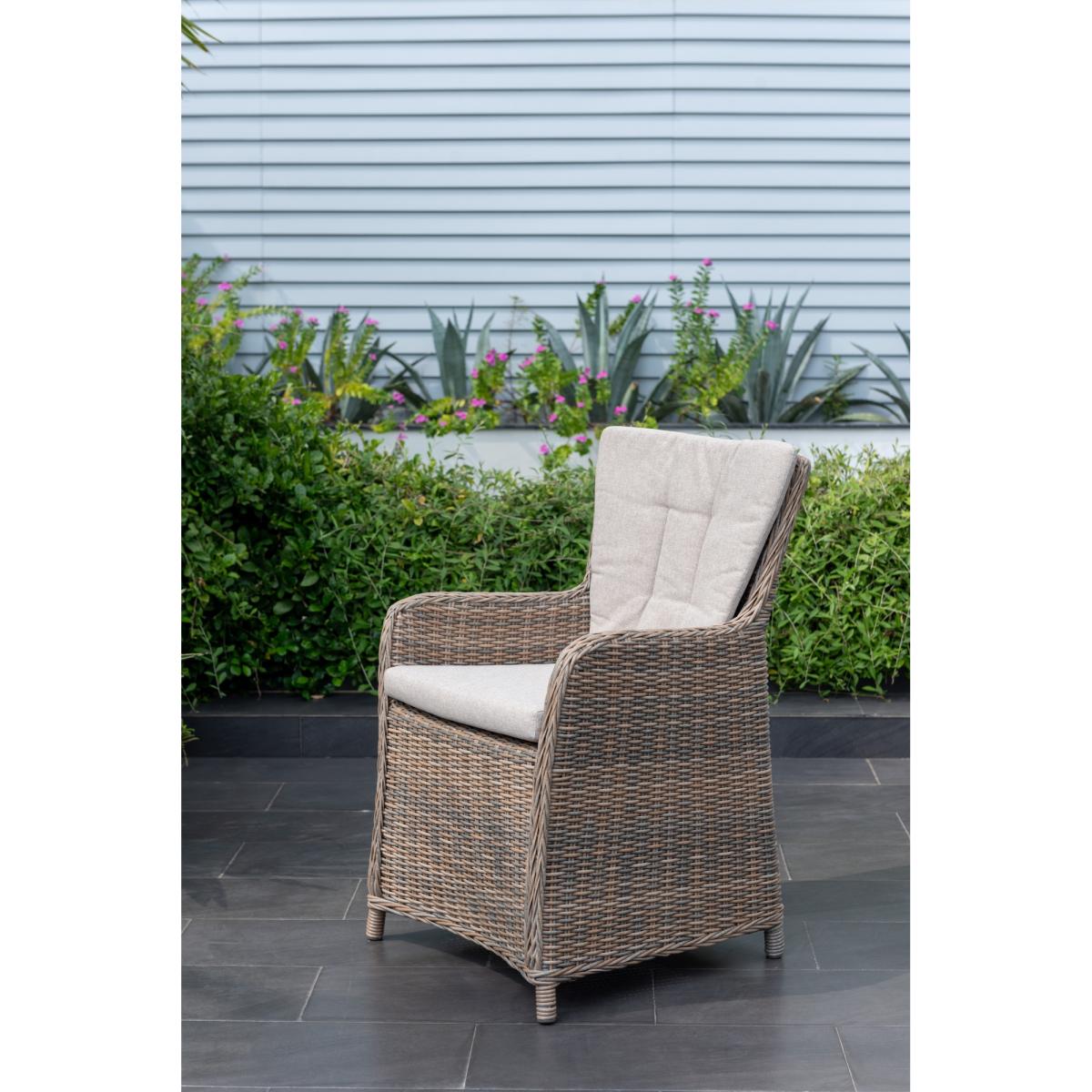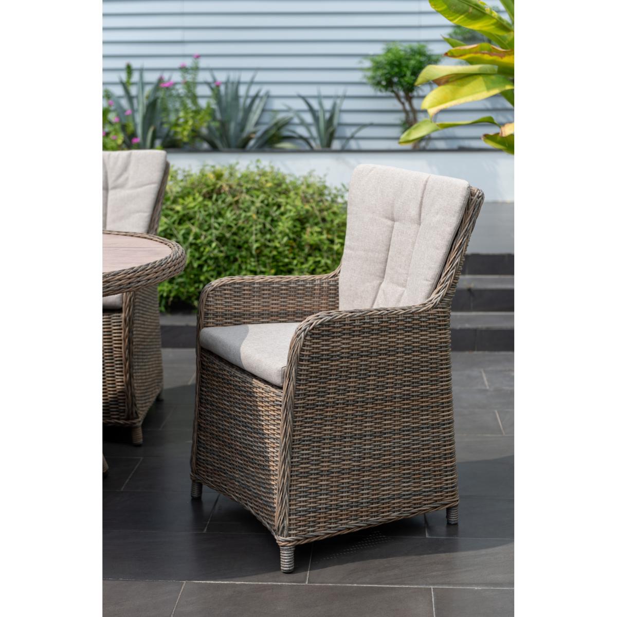 The Martinique 6 Seat Oval Dining Set offers an ideal solution for larger gatherings or family meals. The Martinique Carver Chairs provide enhanced comfort with their soft Olefin cushions, ensuring a comfortable dining experience. Paired with the Martinique oval table, crafted from durable woven Petan, this set also includes a convenient storage space in the centre. Whether hosting a festive dinner or enjoying a casual meal, this set combines timeless elegance with practical features, making it perfect for any outdoor occasion. KEY FEATURES: Set includes: 6 x Martinique carver chairs, 1 x Martinique oval table Synthetic rattan weave UV and frost-resistant Can be left outside all year round (except cushions). Aluminium frames Easy to clean: clean with a non-abrasive sponge and detergent-free soapy cleanser and rinse thoroughly. We recommend storing the cushions in a dry, ventilated space when not in use. If storing cushions or fabric inside, allow to dry completely before storing. 5 year manufacturer's warranty DIMENSIONS: Chairs: Height: 94cm Width: 62cm Depth: 65cm Oval Table: Height: 111cm Width: 207cm Depth: 16cm Please note, all screens vary in colour reproduction and whilst every effort has been made to display the colour as accurately as possible it is for guidance only. Scatter cushions and accessories pictured are for demonstration purposes only and are not included.