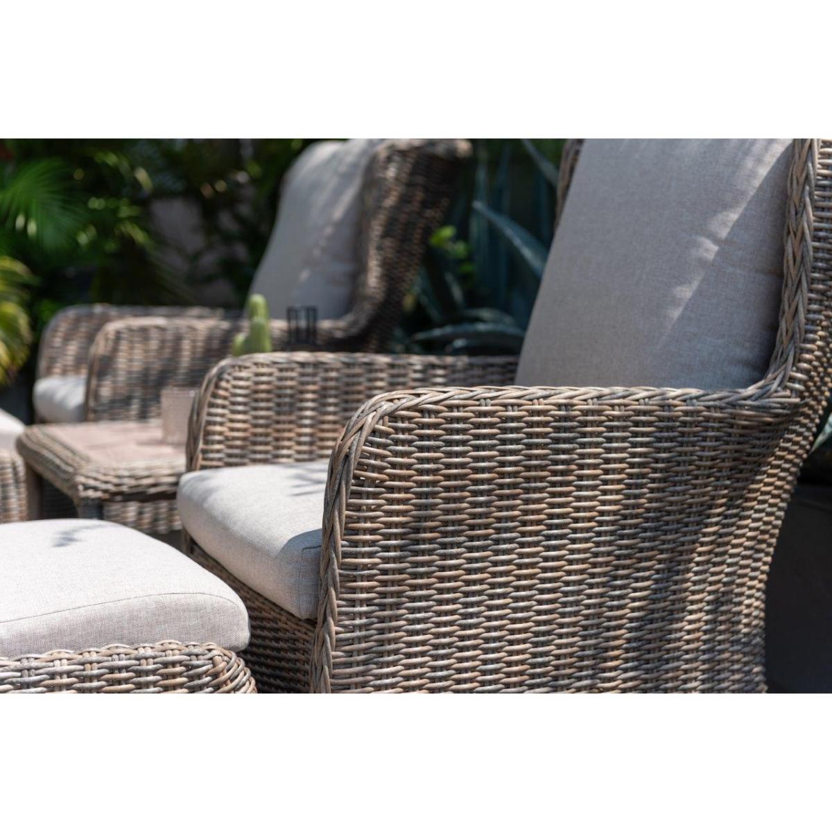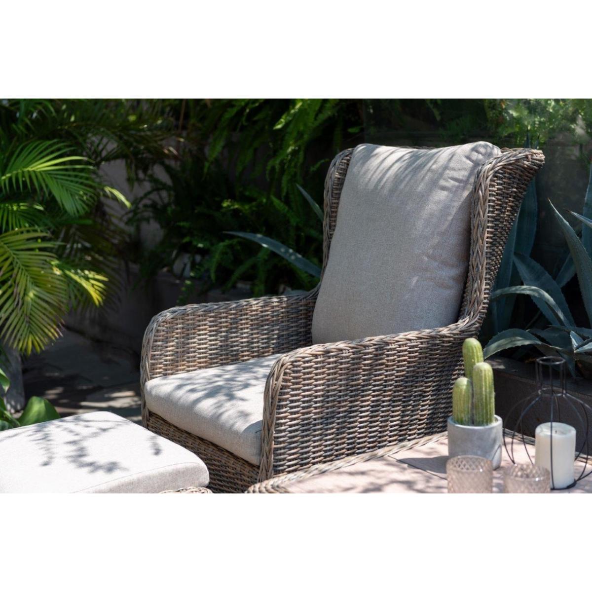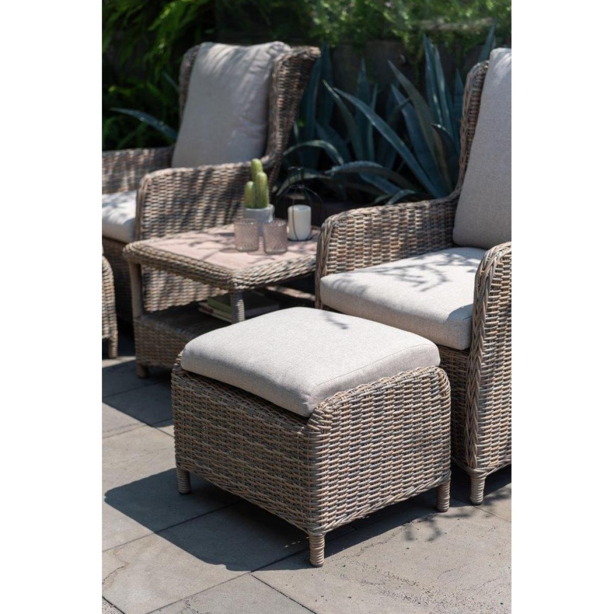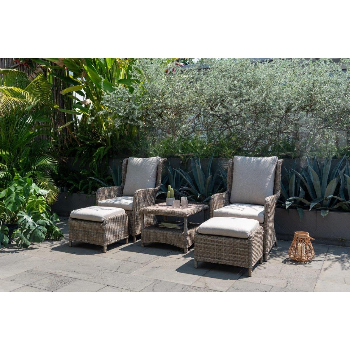 The Martinique Companion Set redefines outdoor relaxation with its blend of luxury and functionality. The deluxe chairs feature a laid-back seating position and integrated footrests, offering the perfect spot to unwind in style. Designed with a beautifully woven Petan frame in the sophisticated Woodsmoke colour and complemented by plush Olefin cushions, these chairs provide exceptional comfort and weather resistance. The matching Martinique Square Side Table completes the set, offering a stylish and practical surface with the same elegant Petan design. Ideal for any patio, this set creates a cohesive and inviting space for outdoor lounging. KEY FEATURES: Set includes: 2 x Martinique Carver Chairs, 2 x Martinique Ottoman's, 1 x Martinique Side Square Table Synthetic rattan weave UV and frost-resistant Can be left outside all year round (except cushions). Aluminium frames Easy to clean: clean with a non-abrasive sponge and detergent-free soapy cleanser and rinse thoroughly. We recommend storing the cushions in a dry, ventilated space when not in use. If storing cushions or fabric inside, allow to dry completely before storing. 5 year manufacturer's warranty DIMENSIONS: Martinique carver chair: Height: 94cm Width: 62cm Depth: 65cm Martinique Ottoman: Height: 44cm Width: 56cm Depth: 39cm Martinique Side Square Table: Height: 44cm Width: 60cm Depth: 60cm Please note, all screens vary in colour reproduction and whilst every effort has been made to display the colour as accurately as possible it is for guidance only. Scatter cushions and accessories pictured are for demonstration purposes only and are not included.