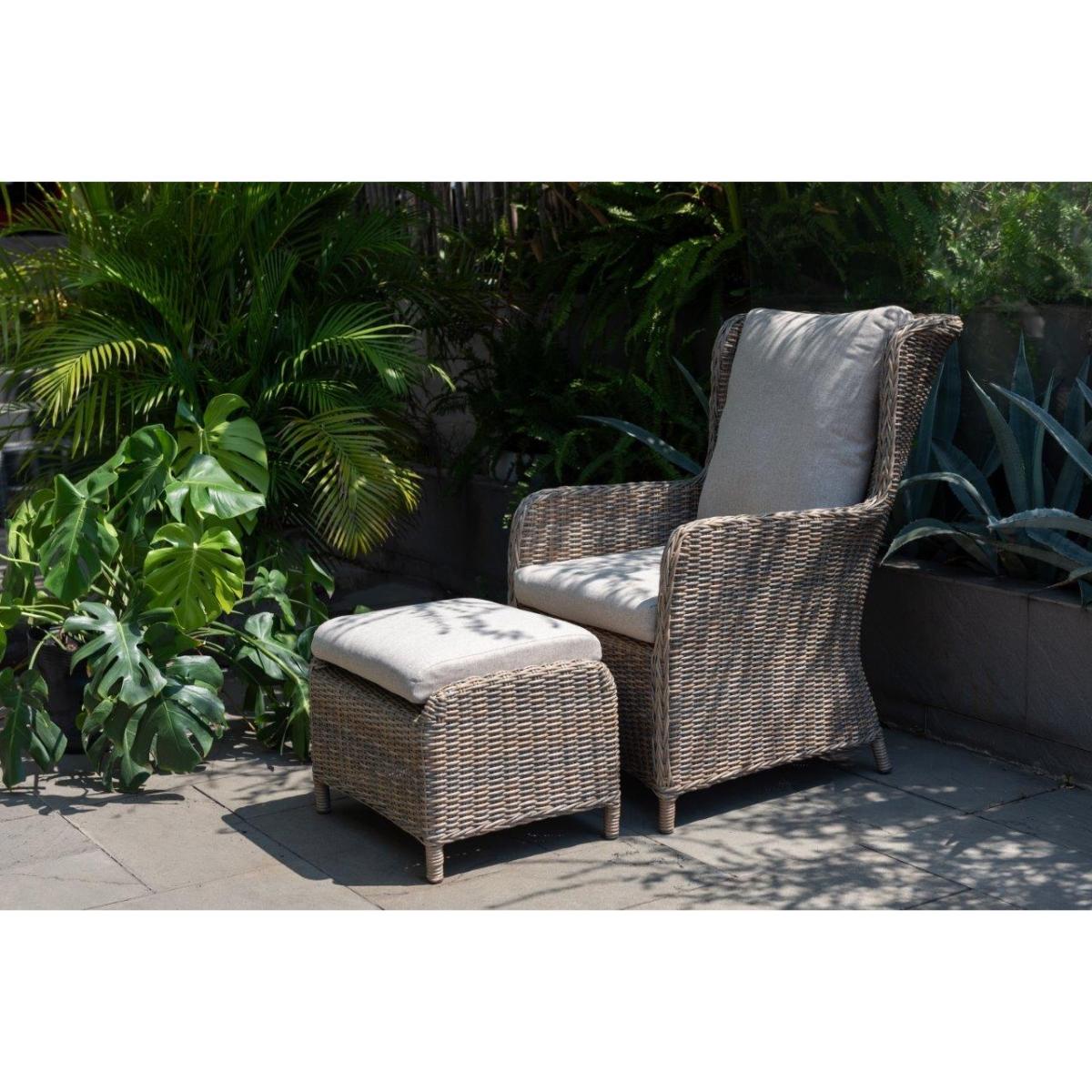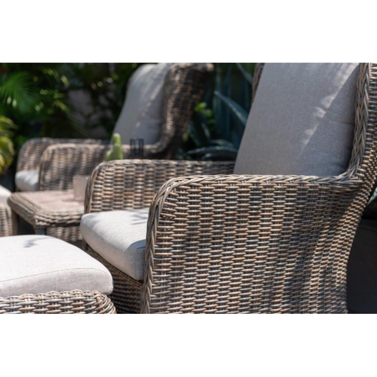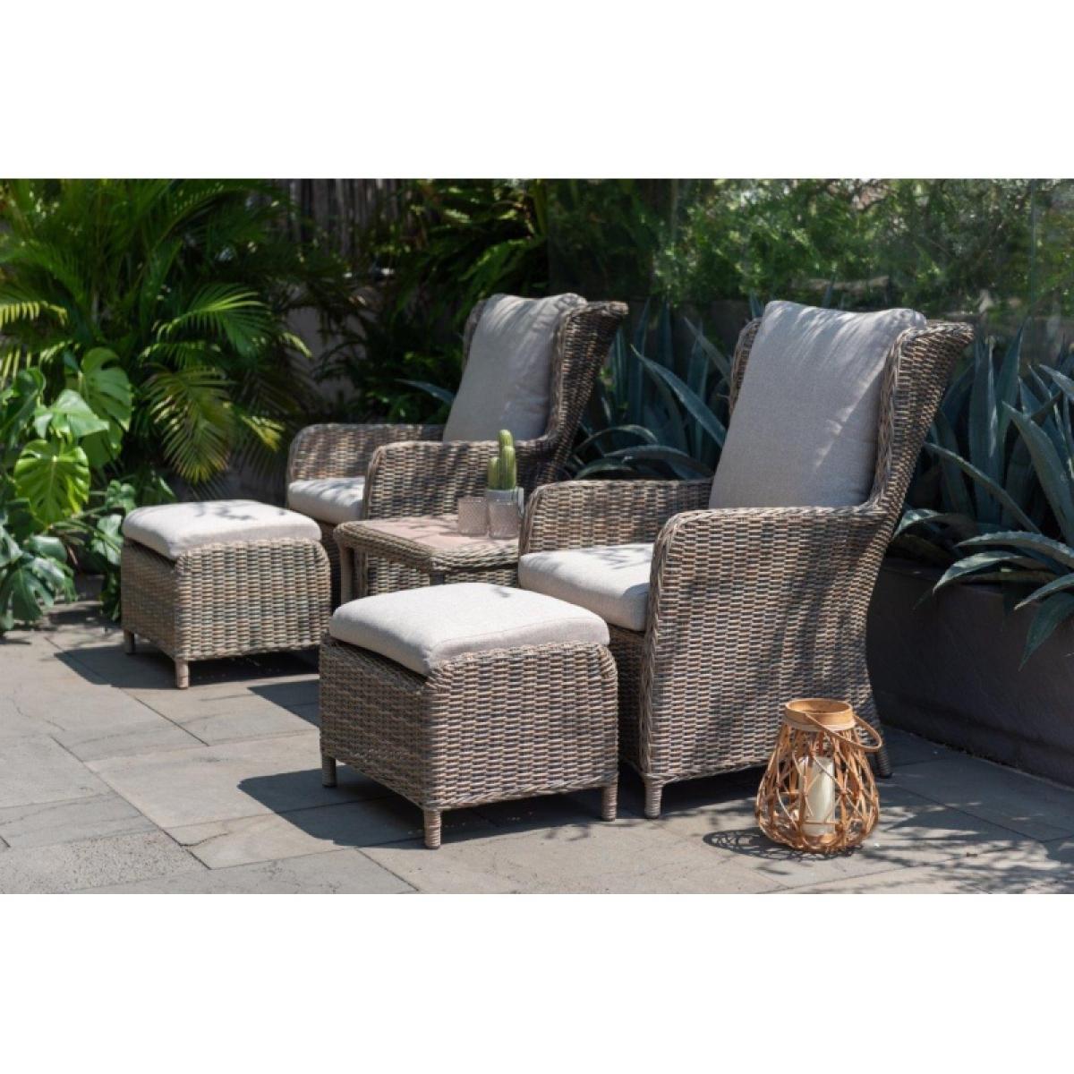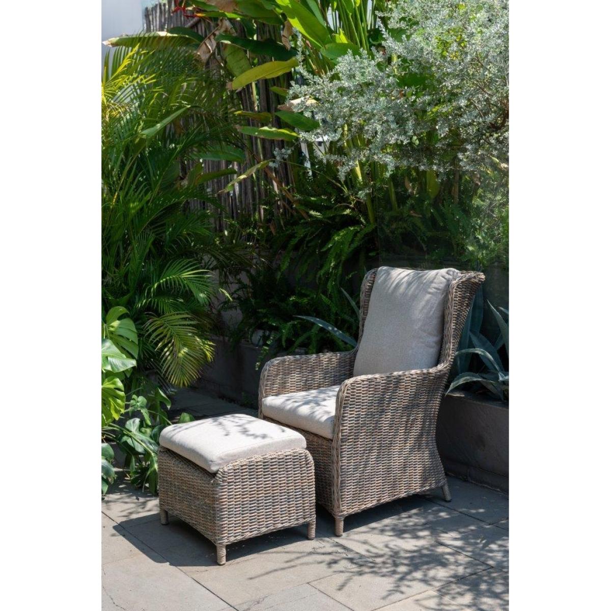 The Martinique Companion Set redefines outdoor relaxation with its blend of luxury and functionality. The deluxe chairs feature a laid-back seating position and integrated footrests, offering the perfect spot to unwind in style. Designed with a beautifully woven Petan frame in the sophisticated Woodsmoke colour and complemented by plush Olefin cushions, these chairs provide exceptional comfort and weather resistance. The matching Martinique Square Side Table completes the set, offering a stylish and practical surface with the same elegant Petan design. Ideal for any patio, this set creates a cohesive and inviting space for outdoor lounging. KEY FEATURES: Set includes: 2 x Martinique Carver Chairs, 2 x Martinique Ottoman's, 1 x Martinique Side Square Table Synthetic rattan weave UV and frost-resistant Can be left outside all year round (except cushions). Aluminium frames Easy to clean: clean with a non-abrasive sponge and detergent-free soapy cleanser and rinse thoroughly. We recommend storing the cushions in a dry, ventilated space when not in use. If storing cushions or fabric inside, allow to dry completely before storing. 5 year manufacturer's warranty DIMENSIONS: Martinique carver chair: Height: 94cm Width: 62cm Depth: 65cm Martinique Ottoman: Height: 44cm Width: 56cm Depth: 39cm Martinique Side Square Table: Height: 44cm Width: 60cm Depth: 60cm Please note, all screens vary in colour reproduction and whilst every effort has been made to display the colour as accurately as possible it is for guidance only. Scatter cushions and accessories pictured are for demonstration purposes only and are not included.