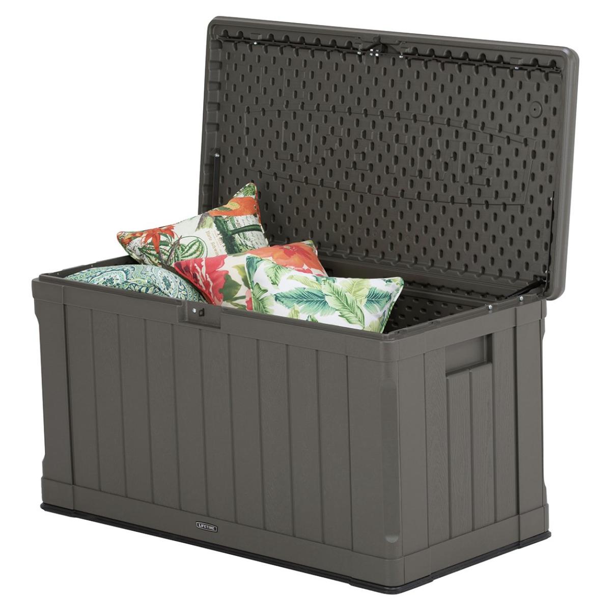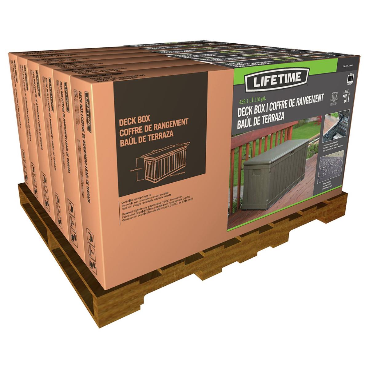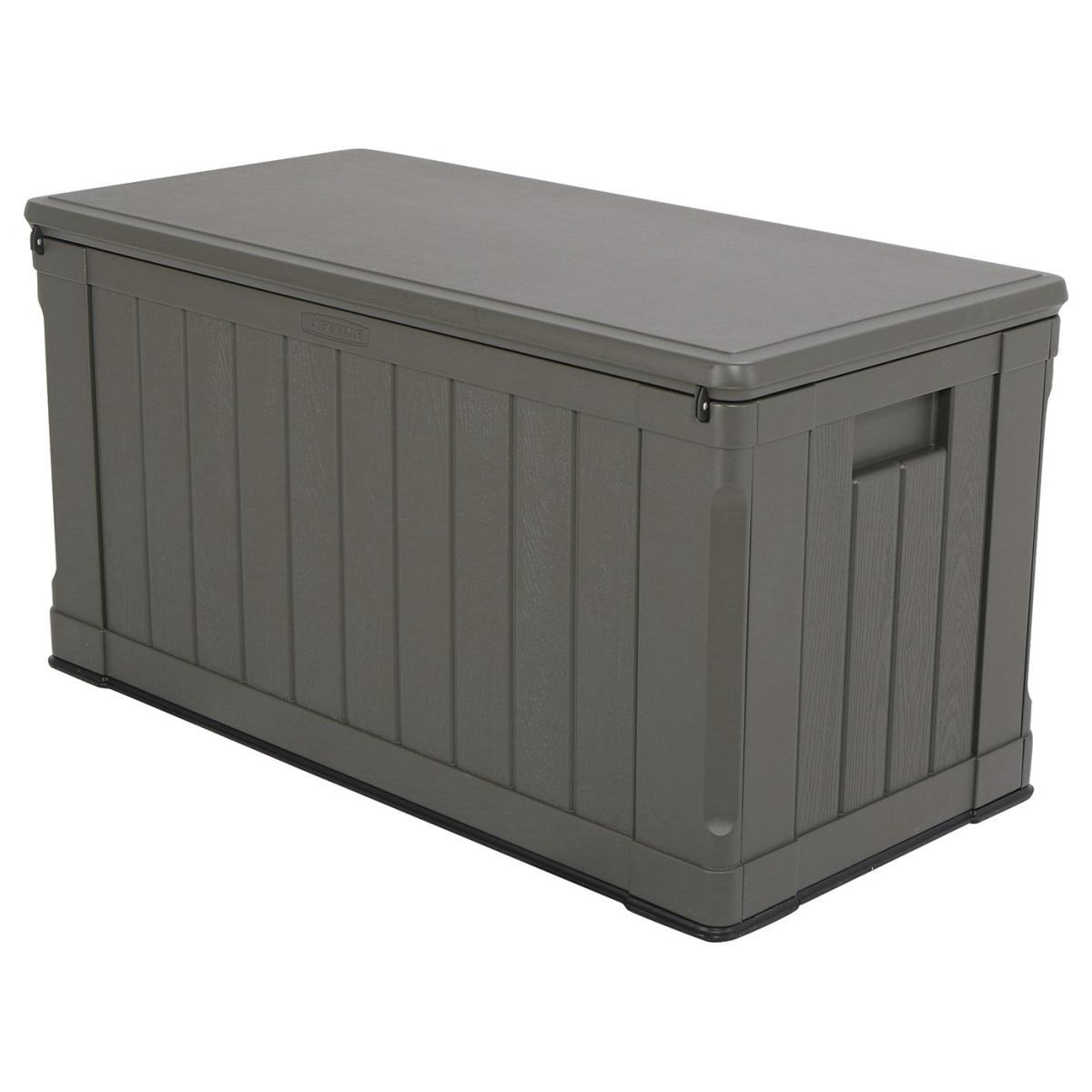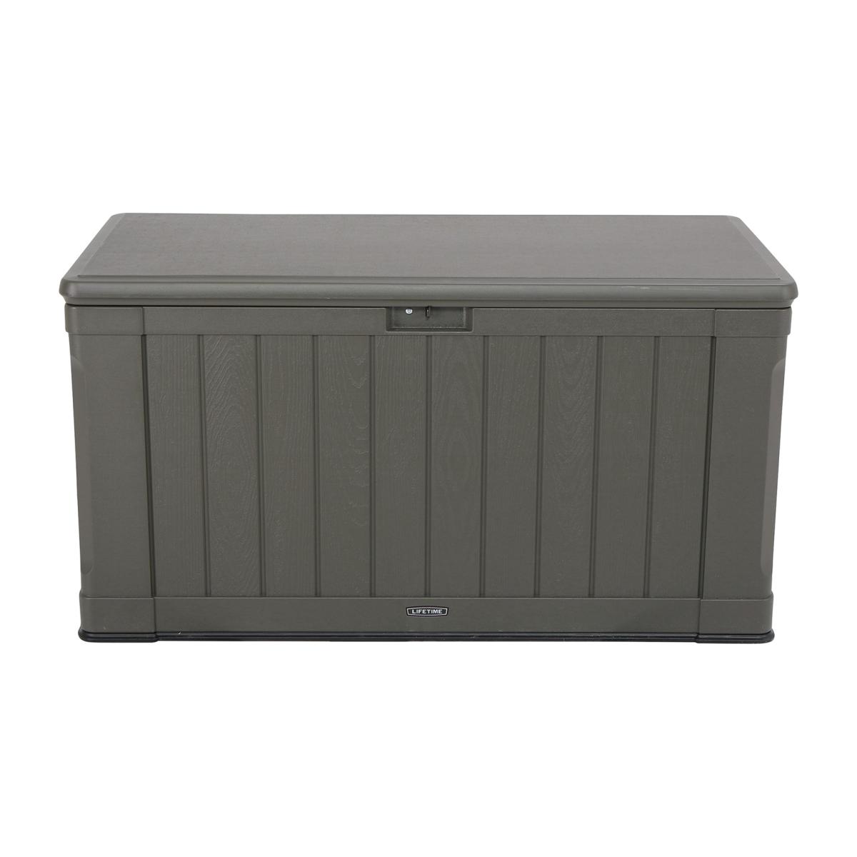 Need a more convenient place to store items around your yard? Lifetime's Deck Boxes are the perfect way to expand your storage and get better access to items you use regularly around your yard. If you have gardening tools, lawn equipment, yard games, or even outdoor seat cushions, the Deck Box makes them easy to store. The lid is lockable (not included) to provide even greater security and has a controlled spring-hinge for easy opening and closing. The Deck Box blends durability, convenience and style to create a versatile storage solution. Controlled Spring-Hinge Lid Opens Greater than 90 – Won't Slam Shut. Weather-resistant Build to Withstand the Elements. Rigid Dual-Wall High-Density Polyethylene (HDPE) Construction. Made of plastic. Capacity 439.11. L. Lockable. External size H67.2, W64, D127.9cm. Internal size H64, W57.4, D121.1cm. Weight 20.5kg. 2 person self-assembly. Kerbside delivery only. Manufacturer's 10 year guarantee.