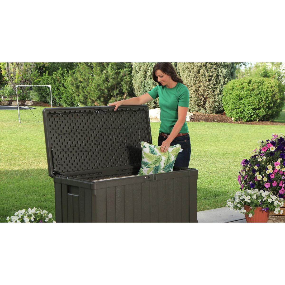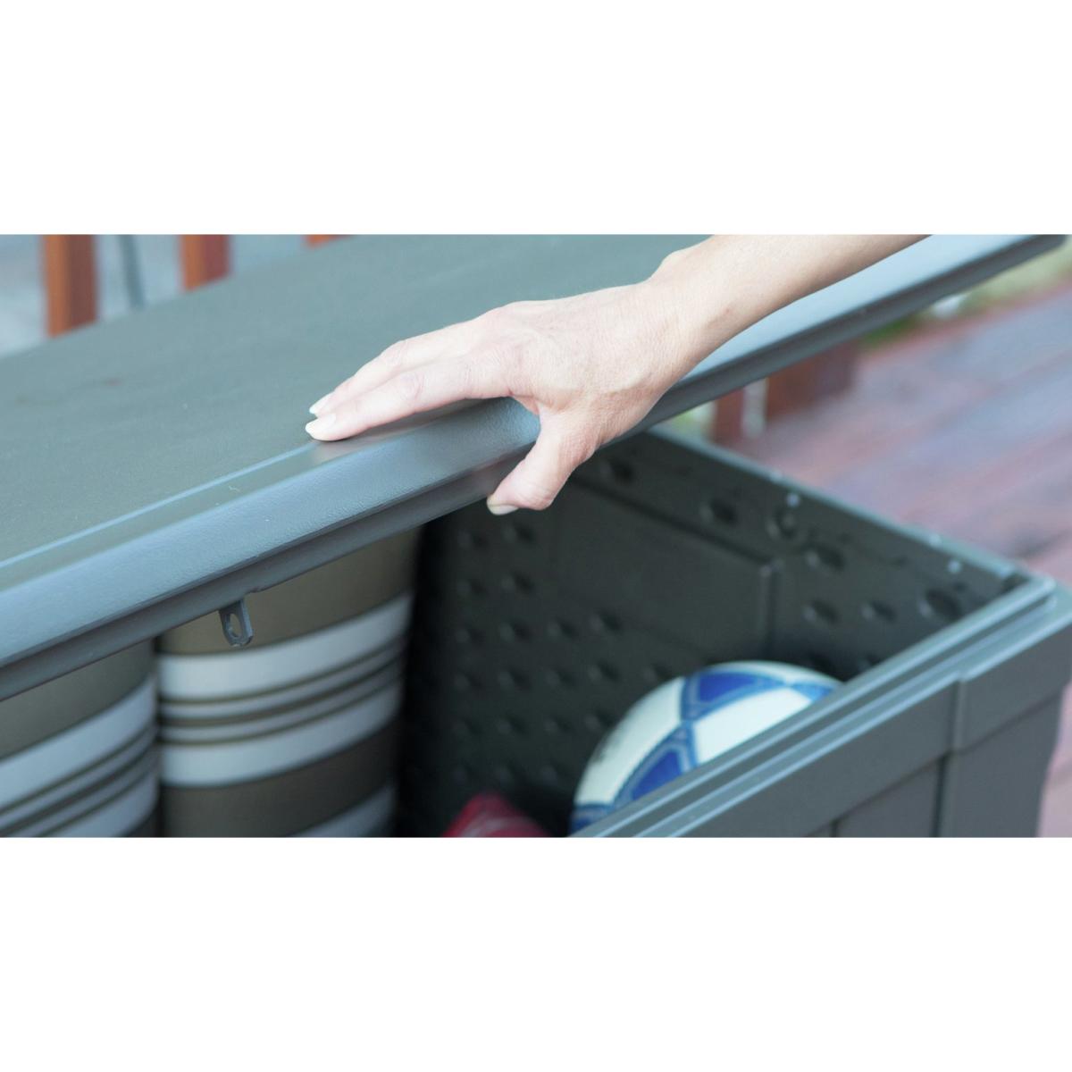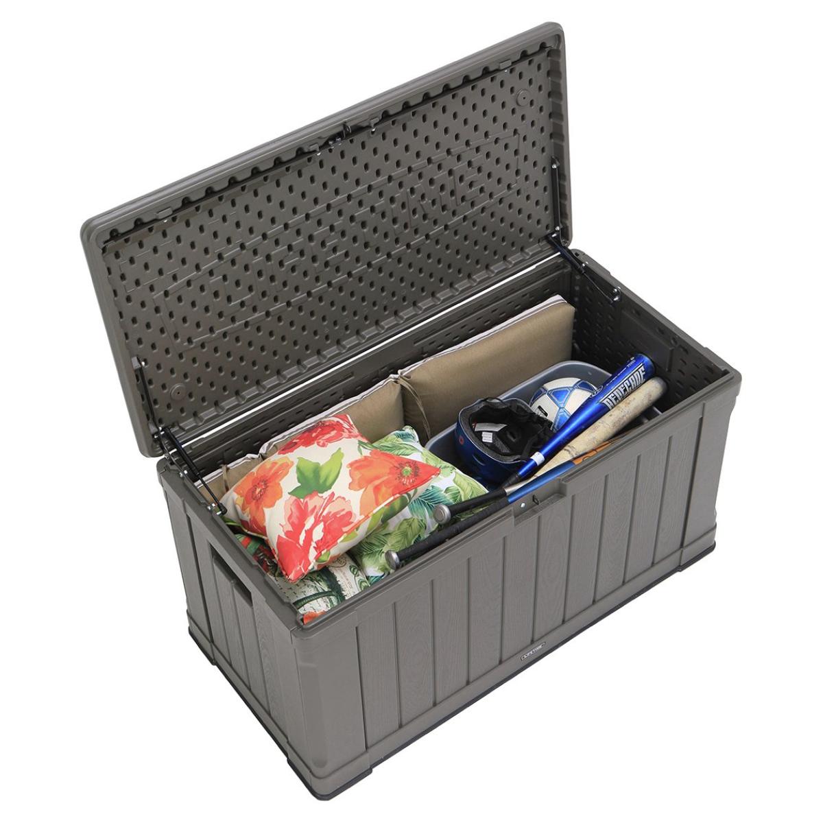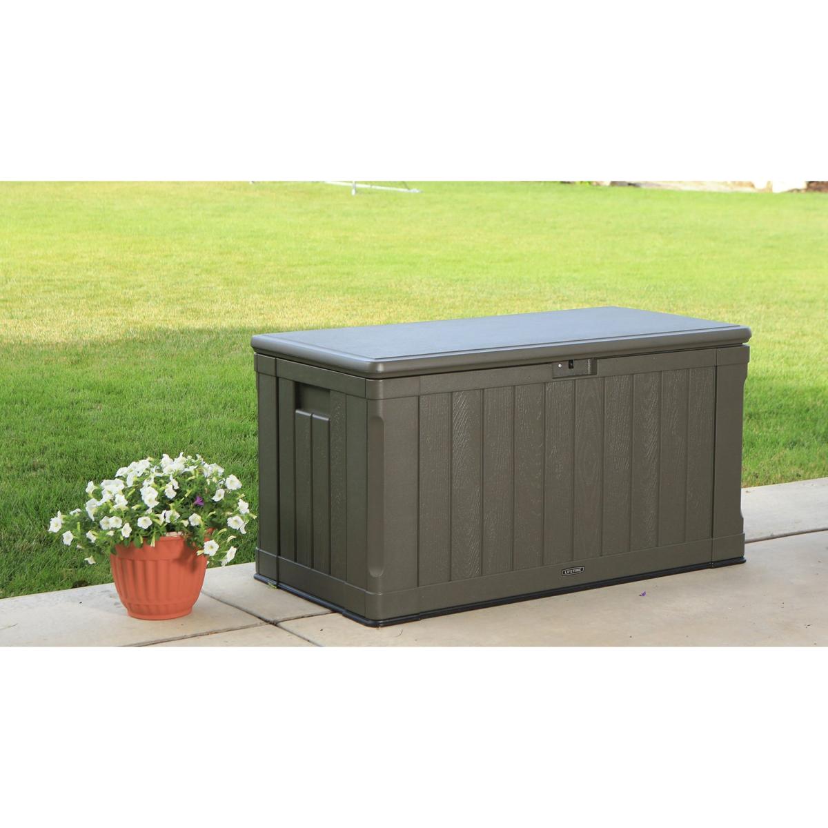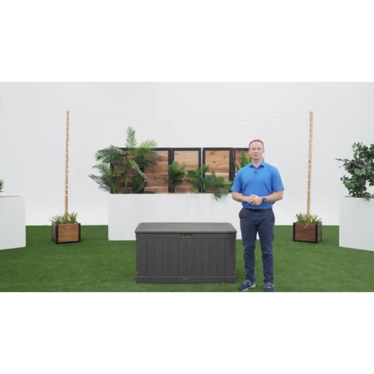 Need a more convenient place to store items around your yard? Lifetime's Deck Boxes are the perfect way to expand your storage and get better access to items you use regularly around your yard. If you have gardening tools, lawn equipment, yard games, or even outdoor seat cushions, the Deck Box makes them easy to store. The lid is lockable (not included) to provide even greater security and has a controlled spring-hinge for easy opening and closing. The Deck Box blends durability, convenience and style to create a versatile storage solution. Controlled Spring-Hinge Lid Opens Greater than 90 – Won't Slam Shut. Weather-resistant Build to Withstand the Elements. Rigid Dual-Wall High-Density Polyethylene (HDPE) Construction. Made of plastic. Capacity 439.11. L. Lockable. External size H67.2, W64, D127.9cm. Internal size H64, W57.4, D121.1cm. Weight 20.5kg. 2 person self-assembly. Kerbside delivery only. Manufacturer's 10 year guarantee.