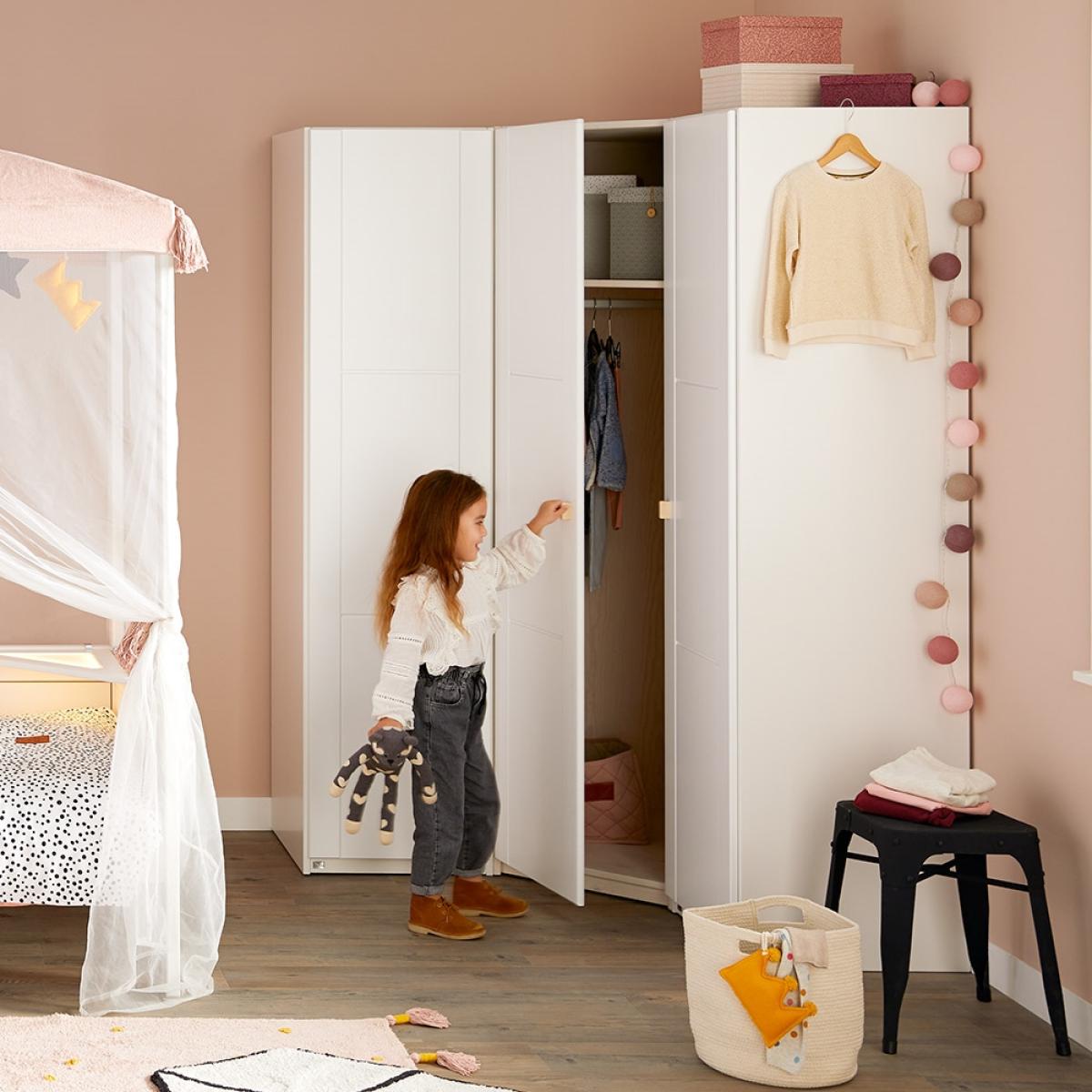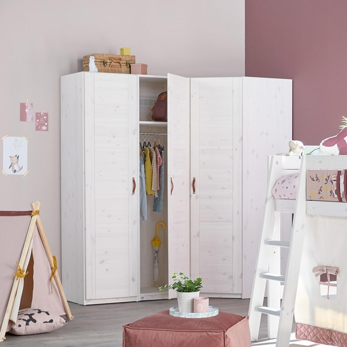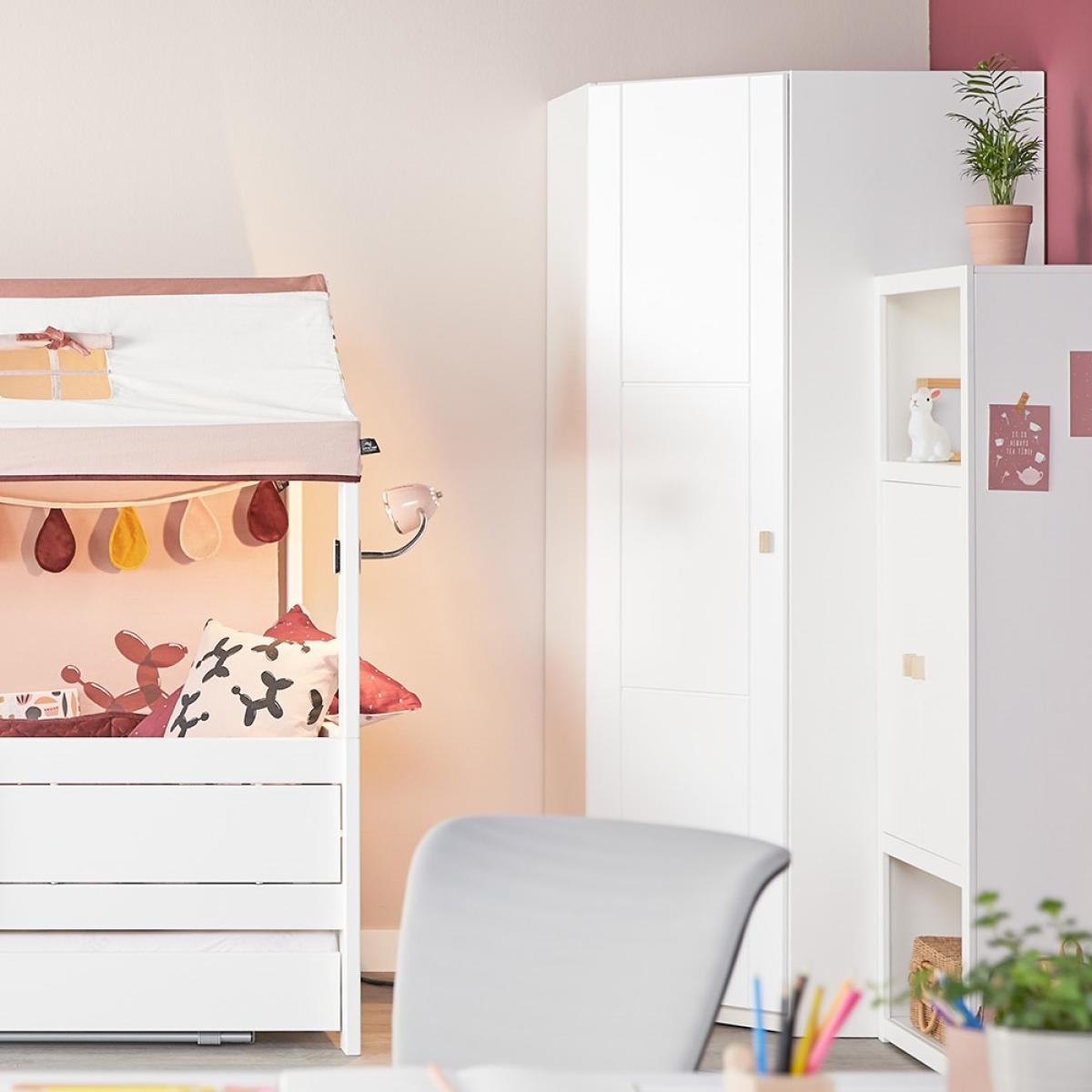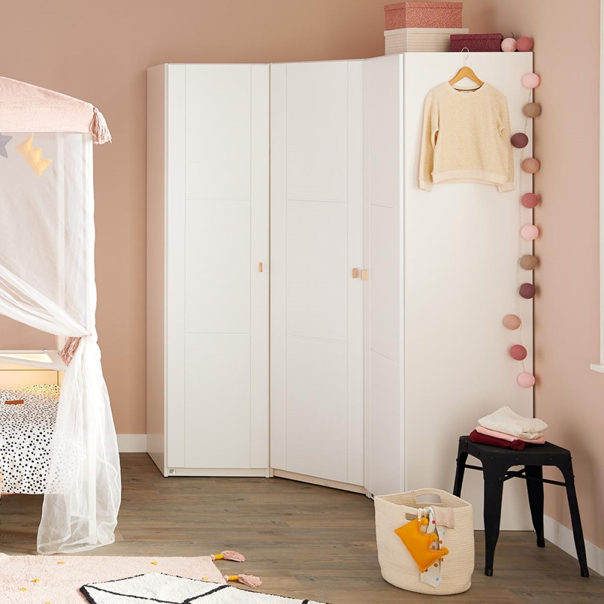 This Customisable Corner Wardrobe from Lifetime is deceptive to the eye but has no shortfall on space. Thanks to its clever dimensions it utilises corners to their full extent whilst not taking up any more room than a conventional wardrobe; but when you look inside it features a hanging rail, storage shelves at side and an overhead area if you really have that much stuff! Handcrafted in Denmark, solid, high-quality pine (a standard feature with Lifetime) ensures durability, ideal for everyday use in any girls or boys room. With so much storage available in one piece of kids furniture, you can store clothes, shoes, toys and even play hide and seek! With the option to customise the colour, the doors and the handles this is one smart piece of furniture!.
