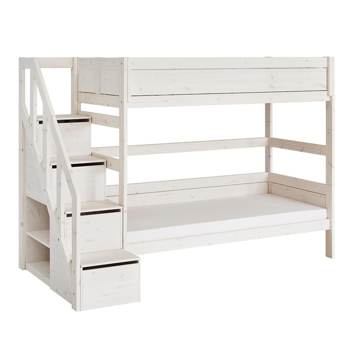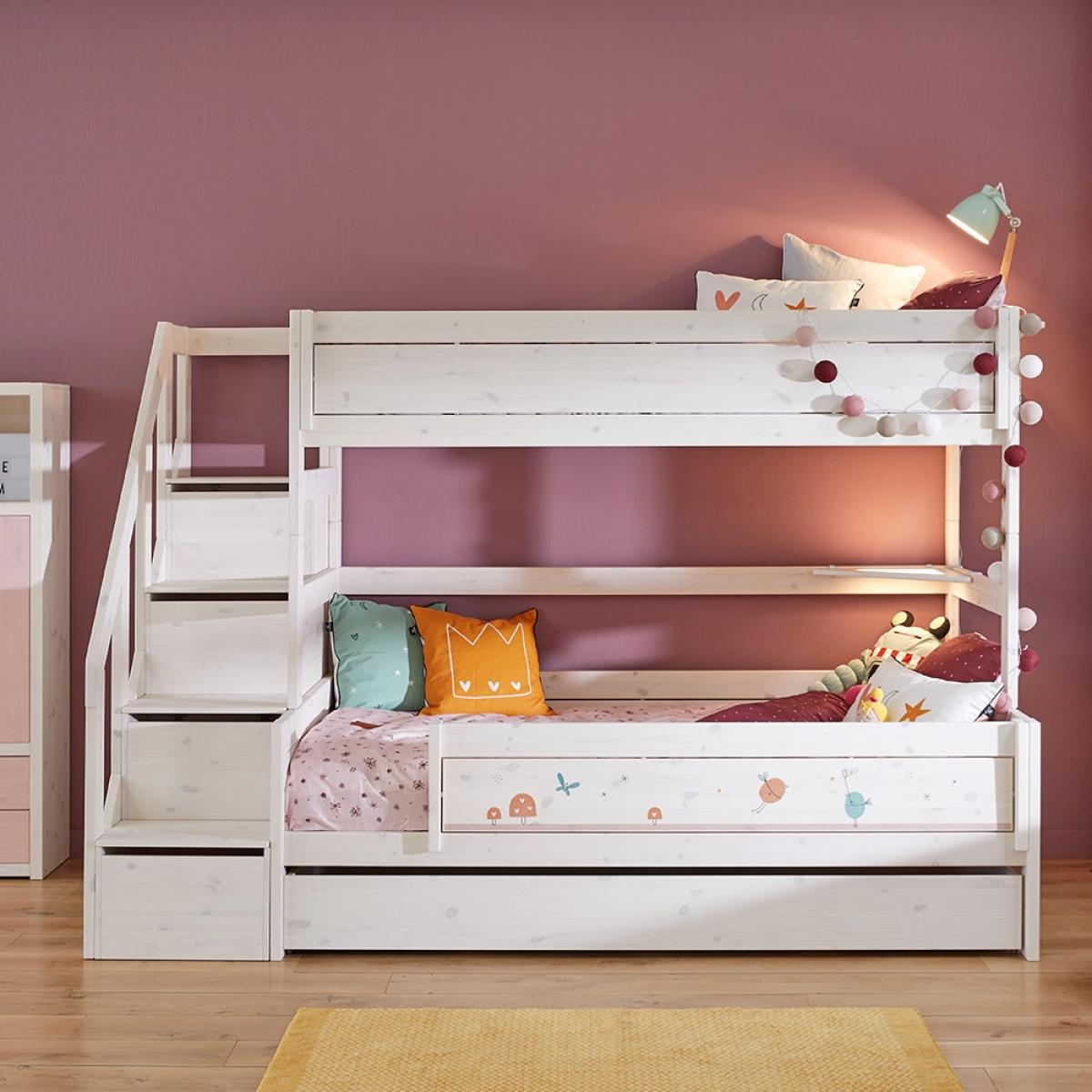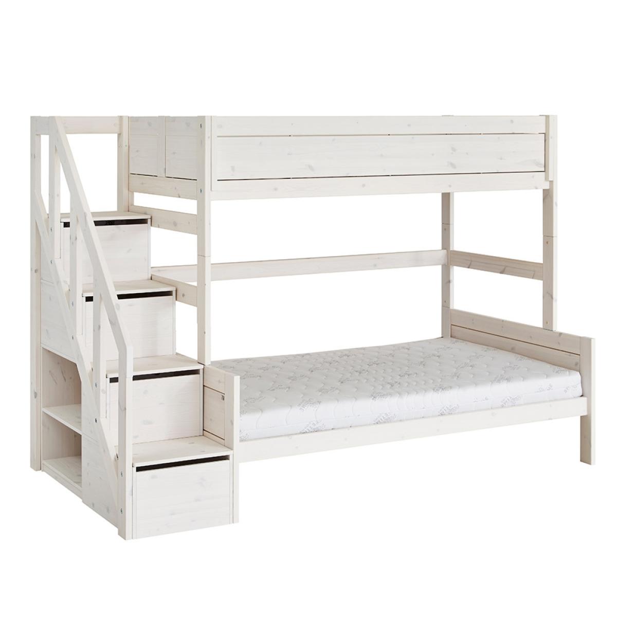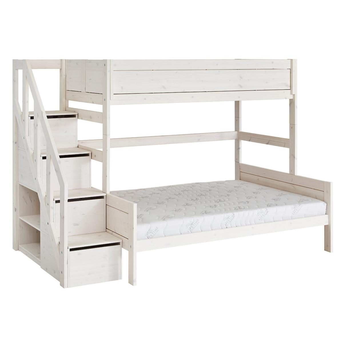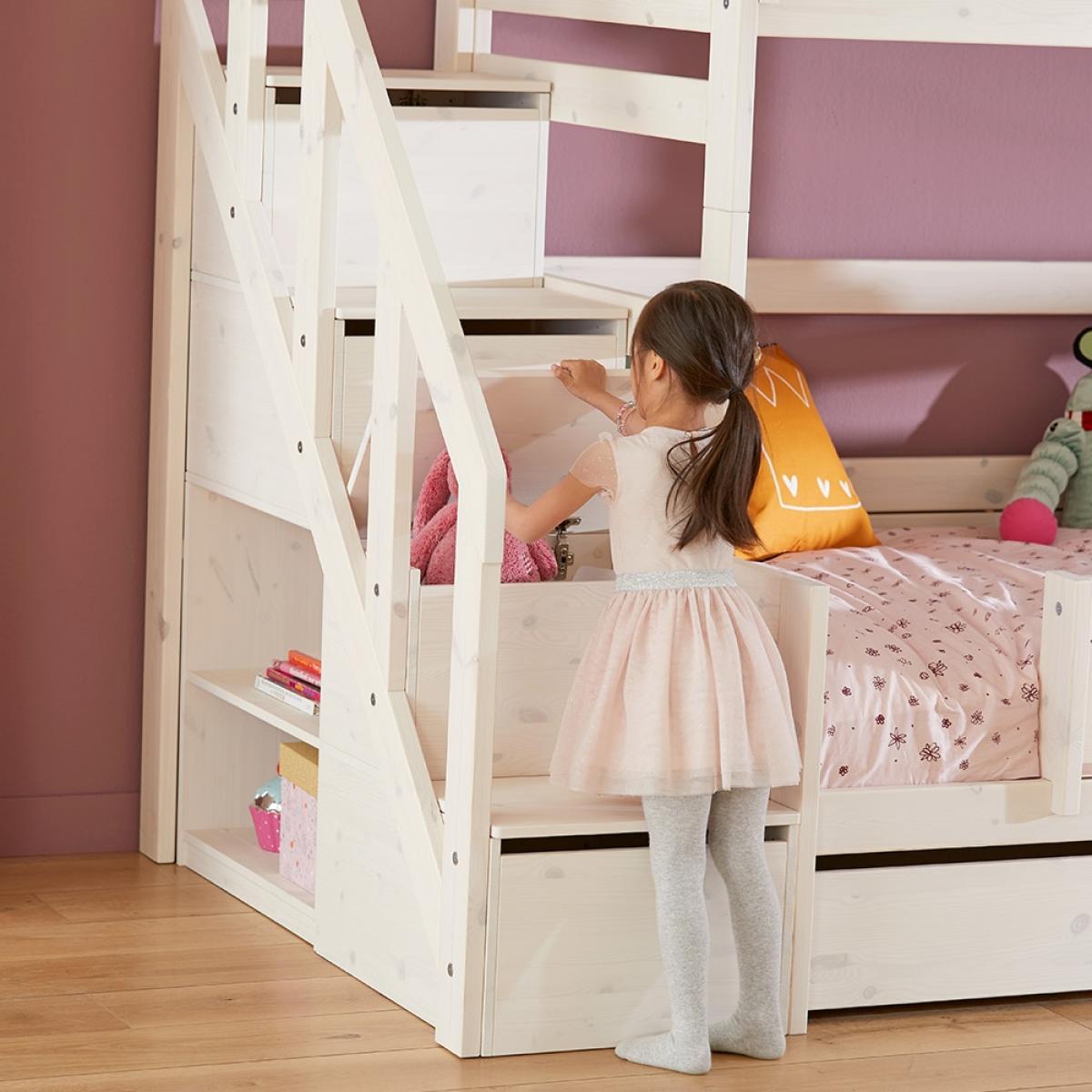 The Family Bunk Bed with Steps from Lifetime is a wonderful piece of furniture that not only looks good but that is functional too! Beautifully manufactured from solid pine and handcrafted in Denmark, it features a stunning whitewash finish plus the front panel can be customised with a range of colours and designs to choose from. With a double mattress bottom bunk and a single mattress top bunk, this bunk bed with steps is ideal for families with a bigger age gap between children. Complete with steps for your youngster to get to the top, not only are they fun but also practical! With storage in each step plus shelving at the side, it's perfect for storing toys and books.