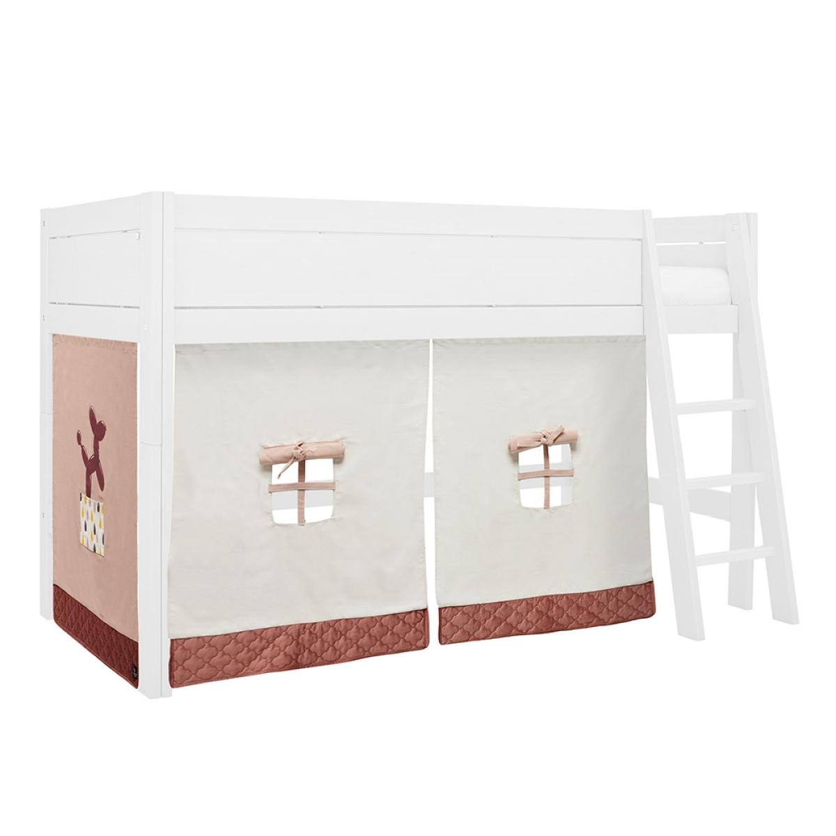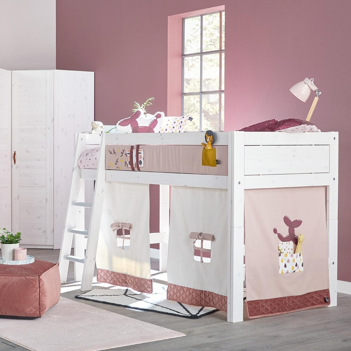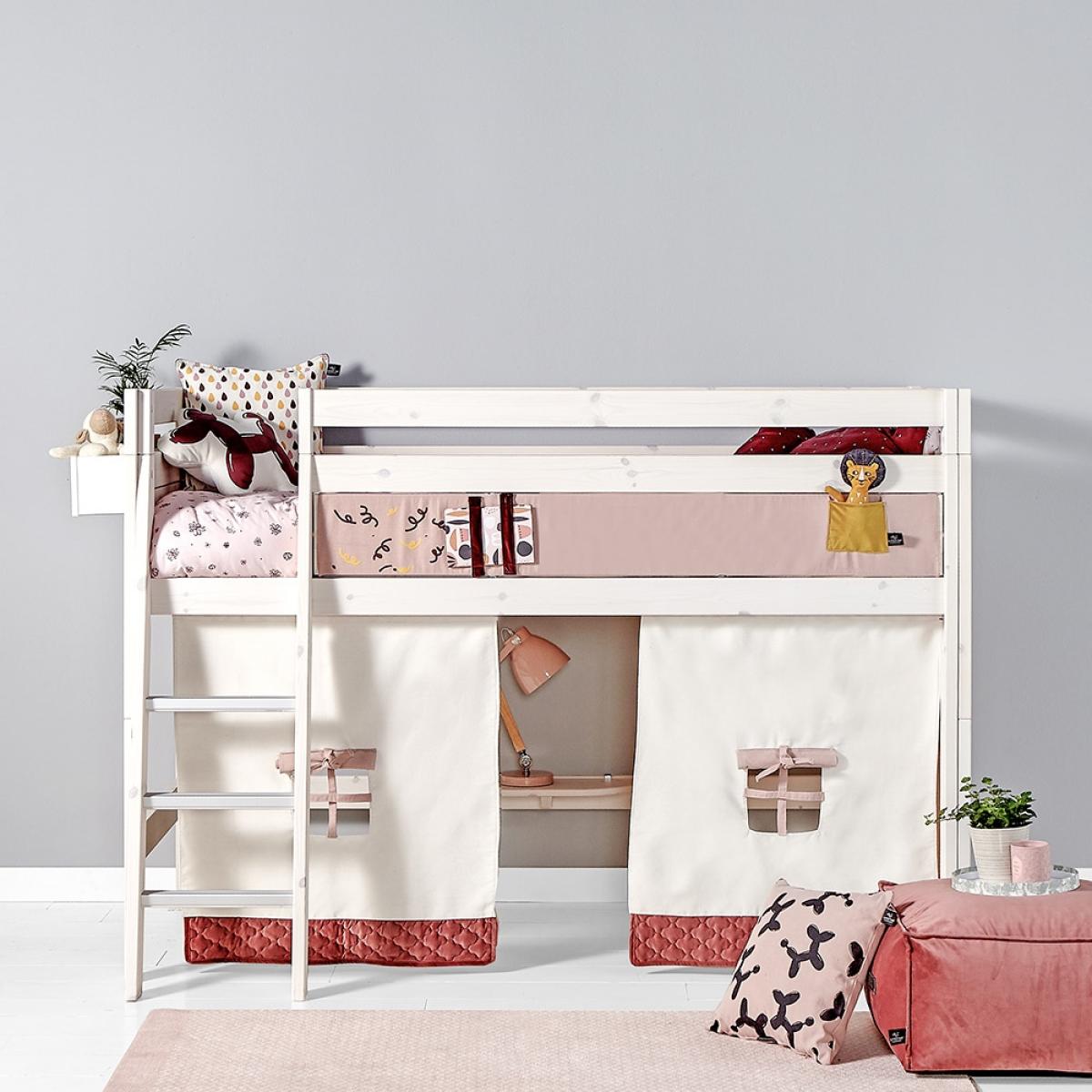 The Funland Kids Mid Sleeper from Lifetime is sure to bring endless hours of fun for your littlun! A wonderful option for smaller bedrooms or just to give your kiddie more room to play. Raised off the ground with space underneath, this semi high bed is perfect for that little bit of extra storage space, plus with the fabric play curtain they can create their very own secret hideaway. But the fun doesn't stop there, oh no! With a fabric cover on the front panel, in the same funland design, there's a pocket to keep their favourite toy close by and two straps for a book or a picture - whatever they like! Manufactured from solid pine and beautifully handcrafted in Denmark this bed not only looks good but will last a lifetime!.