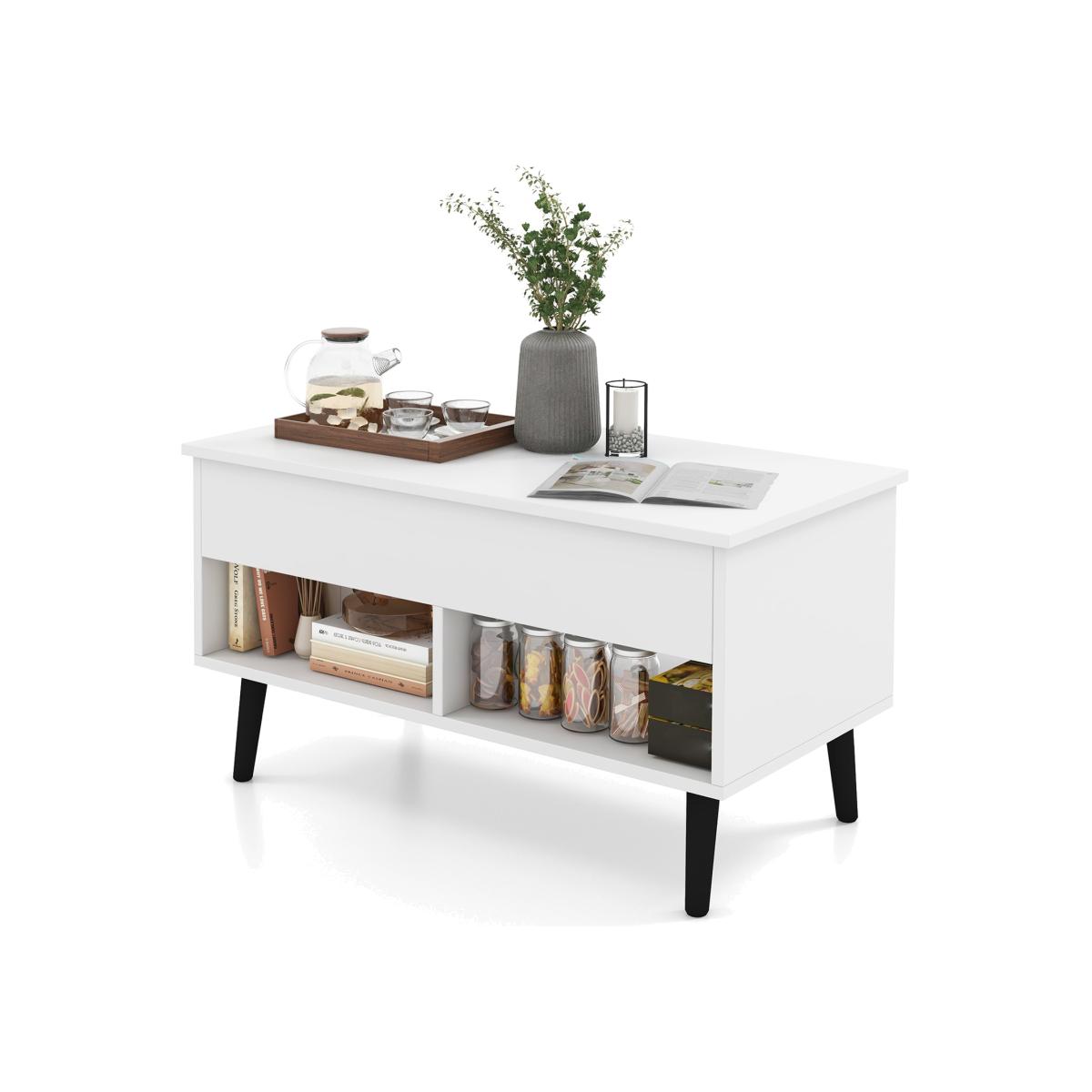 Just enhance the aesthetics of your home with this modern coffee table. Metal spring lift mechanism makes it easier to lift and lower the tabletop, providing a comfortable work table or cocktail table for you. Featuring large hidden compartment and 2 open shelves, the coffee table provides ample storage space for your daily supplies, so as to free up more tabletop space.