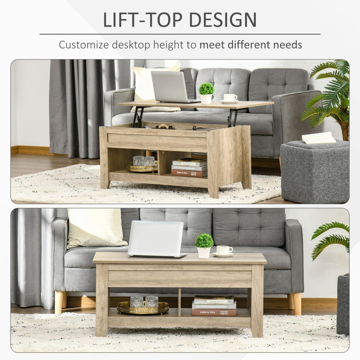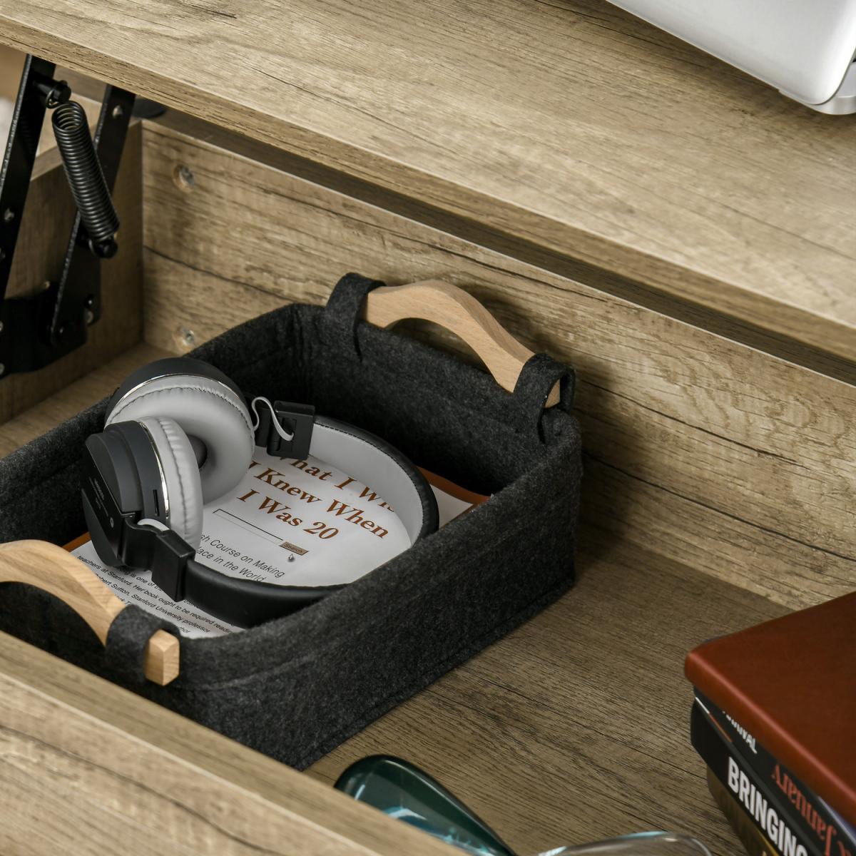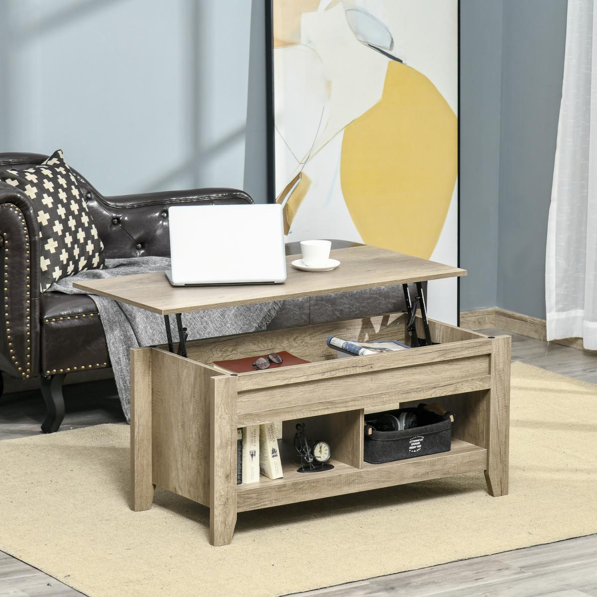 The extending table top lifts up and out to create a convenient floating desk, revealing a hidden storage compartment below. Built from particle board, this living room table is built to withstand long term use. Stylish and functional, this pop up coffee table is perfect in front of a couch or in a home office, helping to provide multiple work surfaces and storage options.