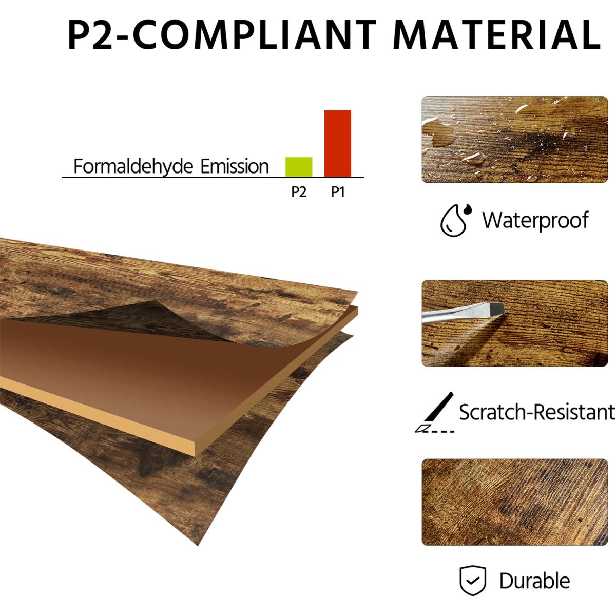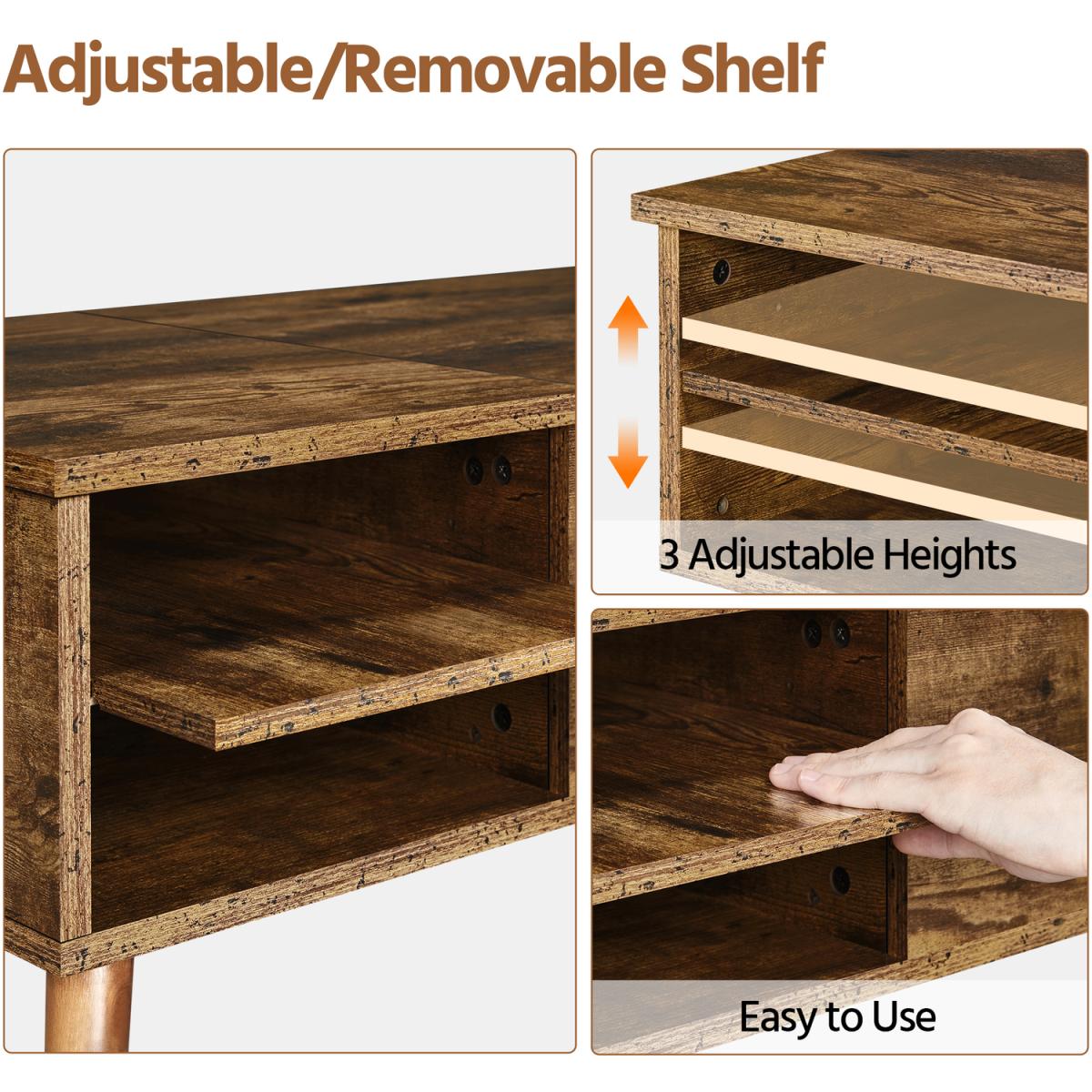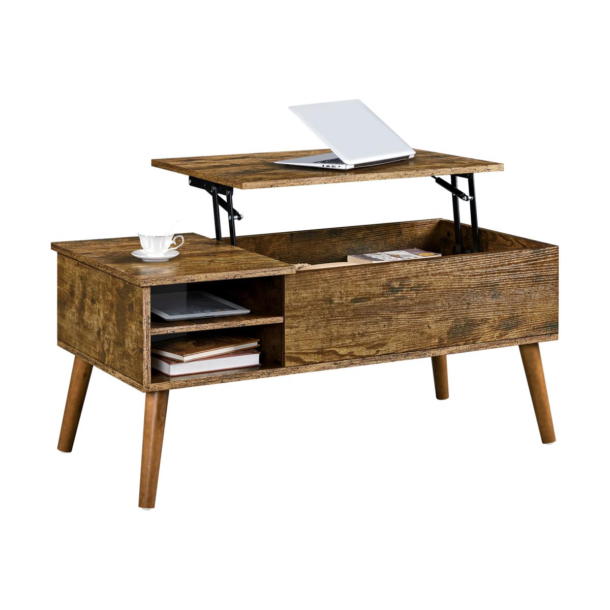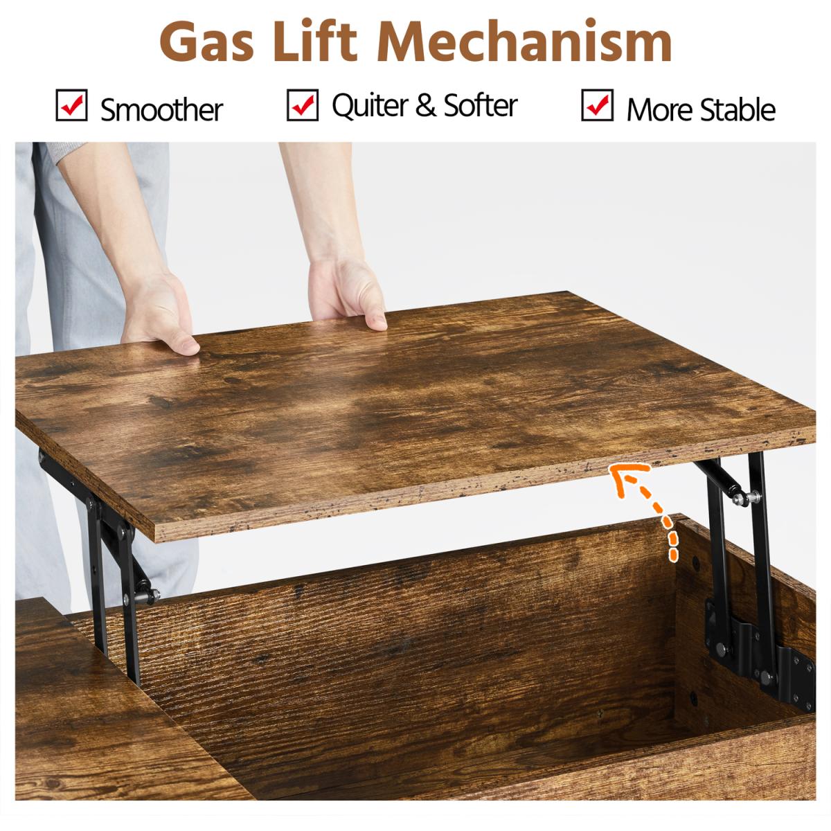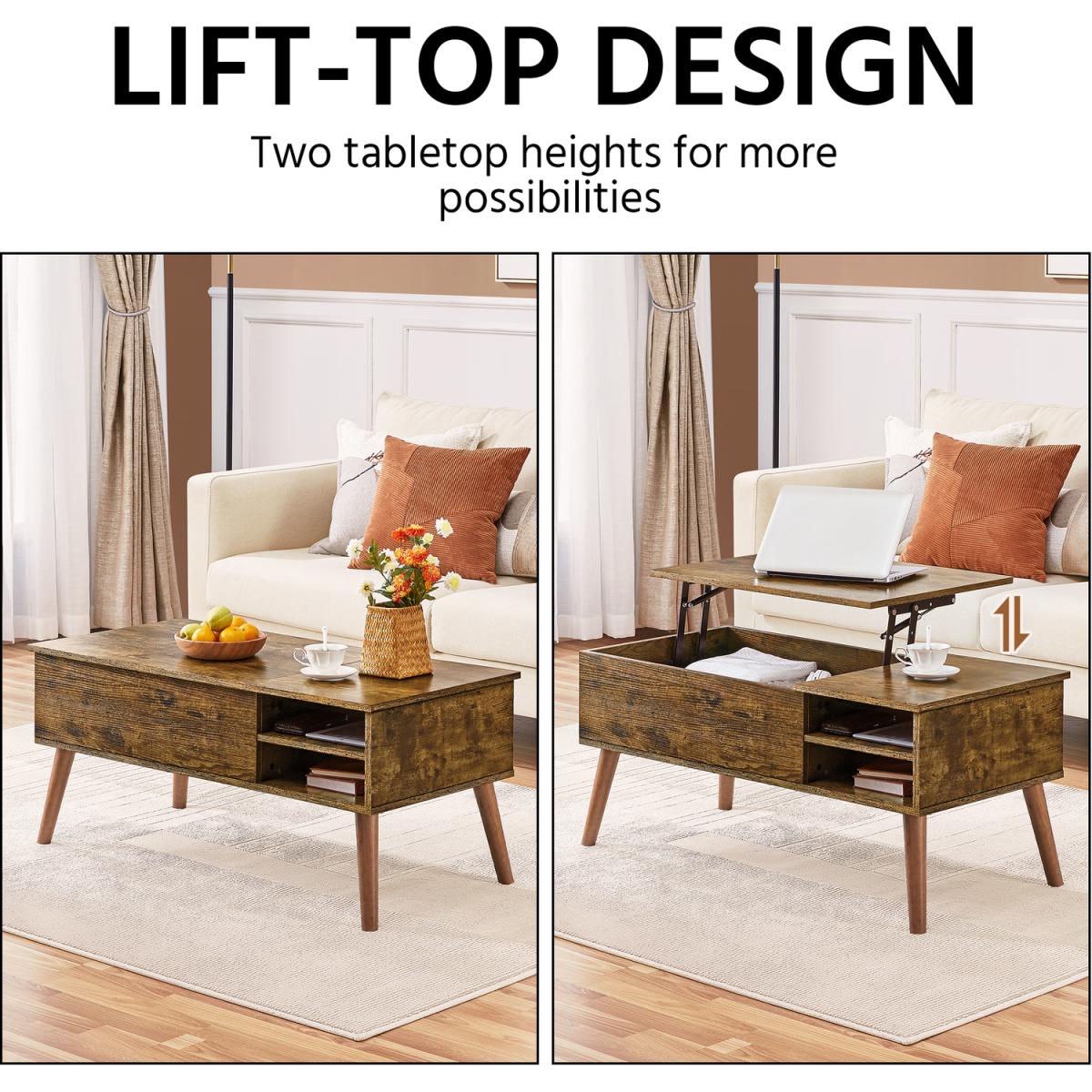 Our 2-in-1 lift-top coffee table illustrates what will happen when style meets with functions. With its streamlined silhouette and subtle woodgrain texture, this rustic coffee table will add a charming touch to your room. The sturdy lifting mechanism helps create a raised surface for you to work comfortably from the couch or eat in front of the TV without leaning forward. Storage-wise, this coffee table features a pop-up top to reveal a hidden storage compartment. Along with the open shelf on the side, it offers you plenty of storage space for keeping your daily-used items within easy access but out of sight, maximizing storage possibilities in a minimal area. More conveniently, the shelf can be adjusted or removed according to the different item sizes, providing great flexibility in organizing. Crafted from a blend of engineered and solid wood, this lift-top coffee table is stable and durable for years of use. The waterproof and scratch-resistant laminate frees you from heavy clean labor. Refine your room with this beautiful piece of furniture and enjoy superb comfort.