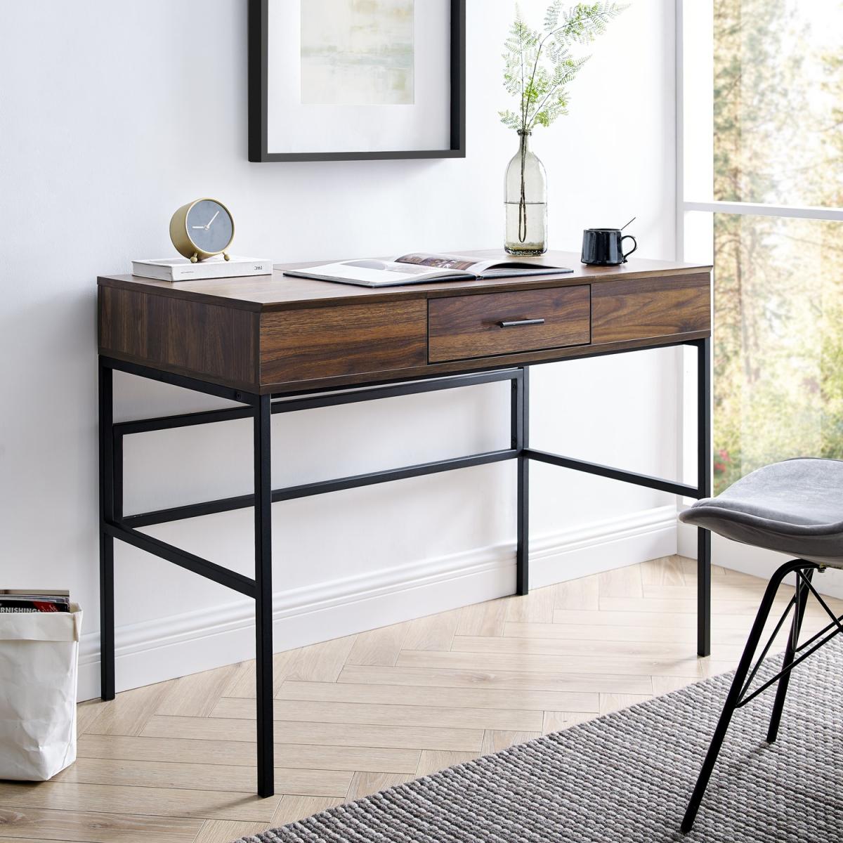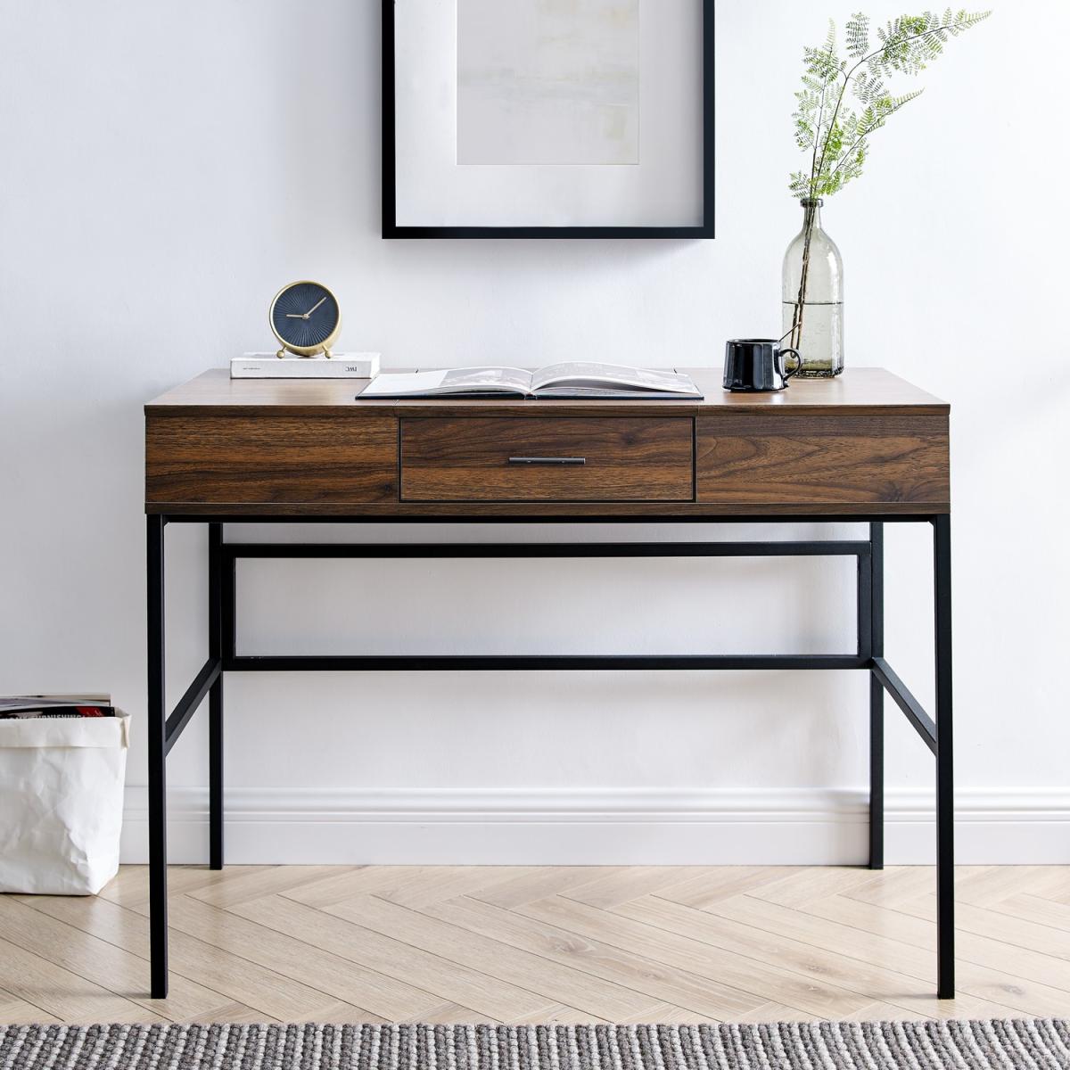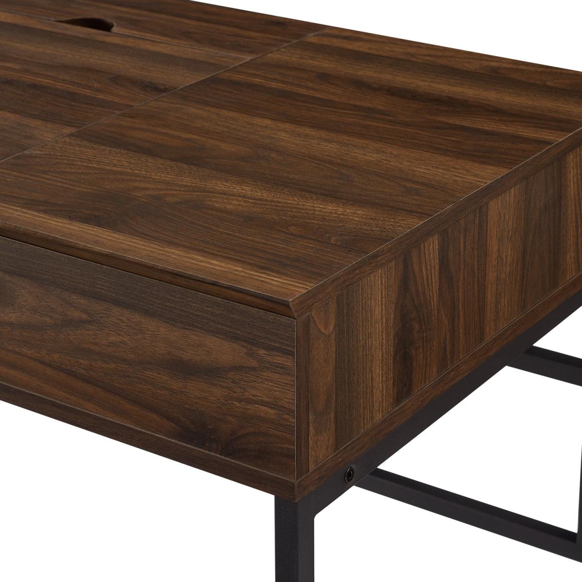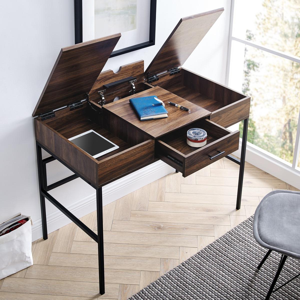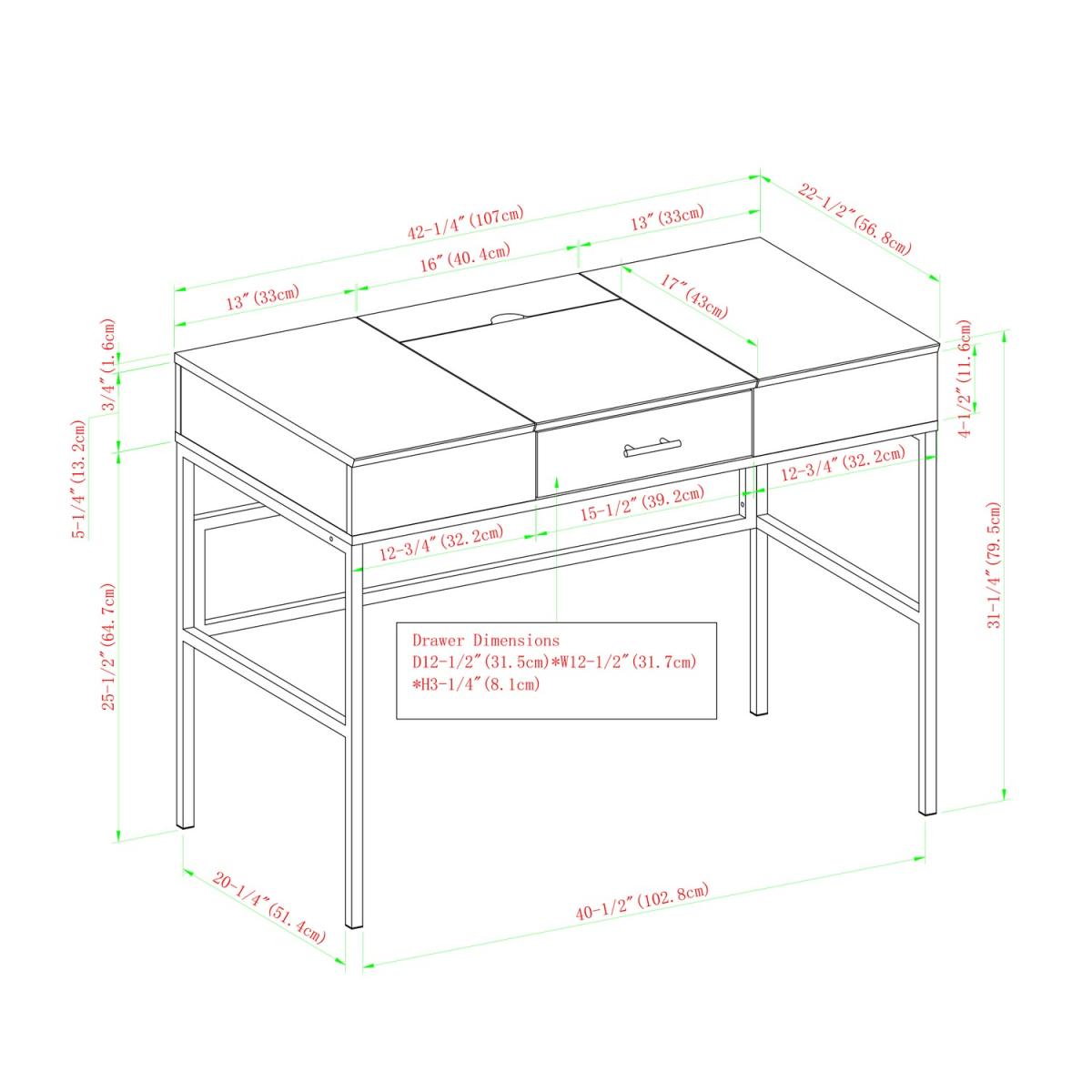 Dimensions H79 x W107 x D58 cm. Finals are coming. Unlock your ultimate study strategies with the 42” lift top storage desk with a tablet holder. It’s an organizer’s dream with a double-sided lifted top and a single drawer on telescoping metal glides. Think of how many sticky notes notebooks and books you could fit in there! Cord management is available to keep your electronics tidy and close by. A tablet holder rests beneath the lifted desk; use it to hold pens notebooks tablets or your phone. A modern streamlined look keeps this writing desk looking clean and humble. You’d never know its transforming capabilities. And with a warp-resistant MDF wood frame and powder-coated steel legs it’s in for the long haul. Features. 1 drawer with smooth telescoping glides2 lift top storage compartments. Pop-up metal electronic holder Cord management Modern writing desk with storage. Ships ready-to-assemble with step-by-step instructions..