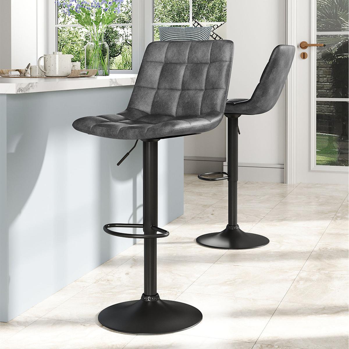 I’m a fan of these swivel bar stools because the height-adjustable gas lift and plush quilted seat give you both comfort and flexibility - ideal for breakfast bars or kitchen islands in modern, industrial or Scandinavian-inspired spaces. The muted grey upholstery works effortlessly against white, timber or slate surfaces, while the slim black base keeps the look light and unobtrusive. For styling, line them up along a pale timber counter and add a row of pendant lights overhead to balance the dark metal. A simple foot-rail cushion can enhance comfort if little ones are using them, and a quick wipe with a damp cloth will keep the faux-leather looking sharp.