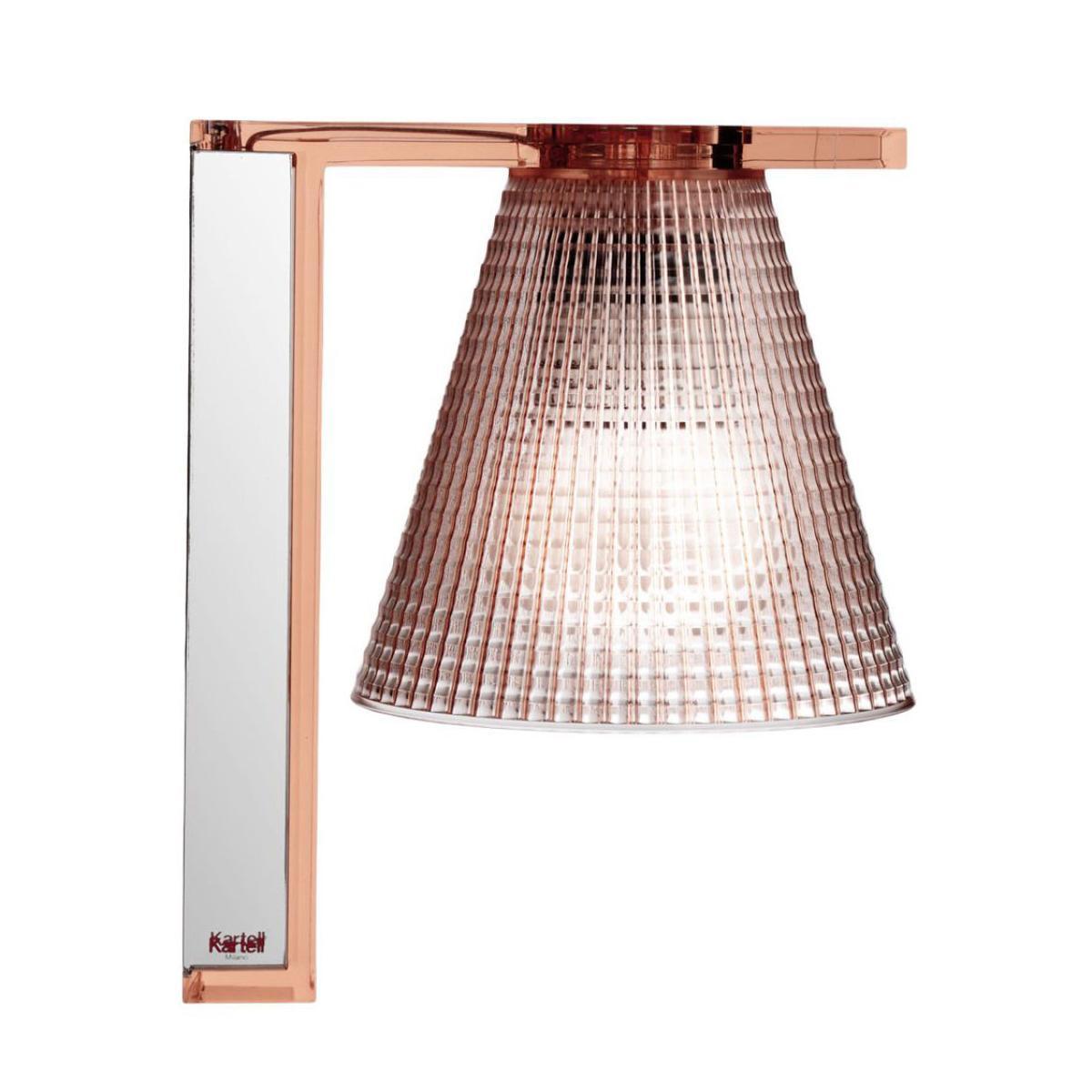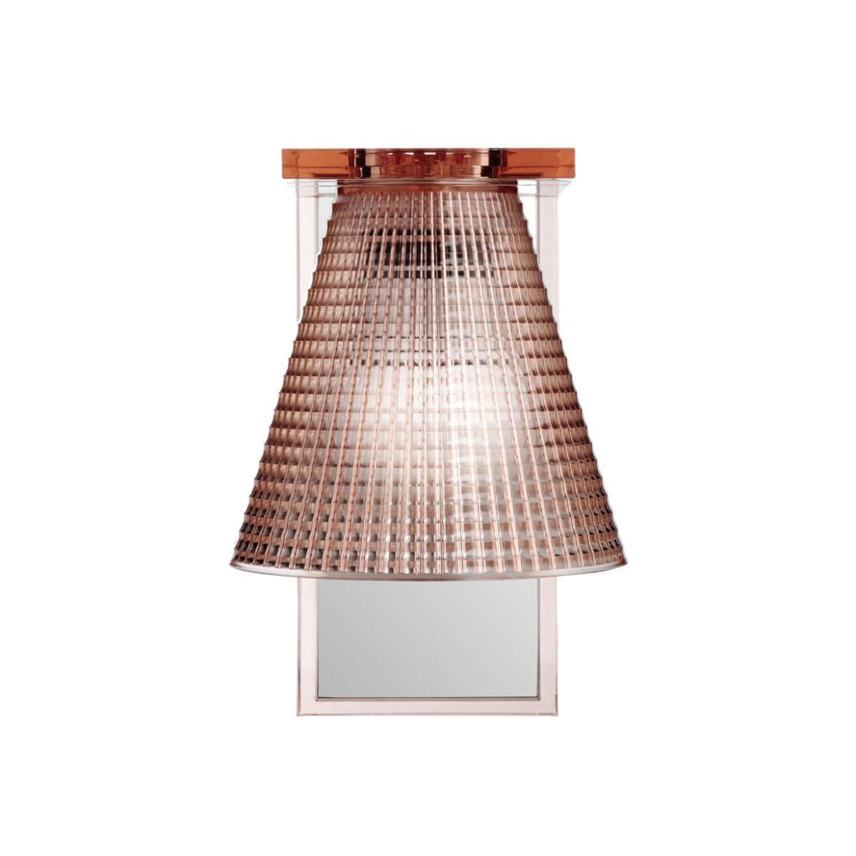 An aerial, essential and graphic design wall light. Light Air plays the assembly of elementary shapes: the conical lampshade is hung from a square lines structure. The wall plate is decorated with a mirror that plays with reflection and depth. The surface of the lampshade is decorated with a grid pattern in relief evoking the crystal hand-made and polished by factories from the early 20th century. The precious and classic appearance of the lampshade contrasts with the modernity of the transparent plastic material.