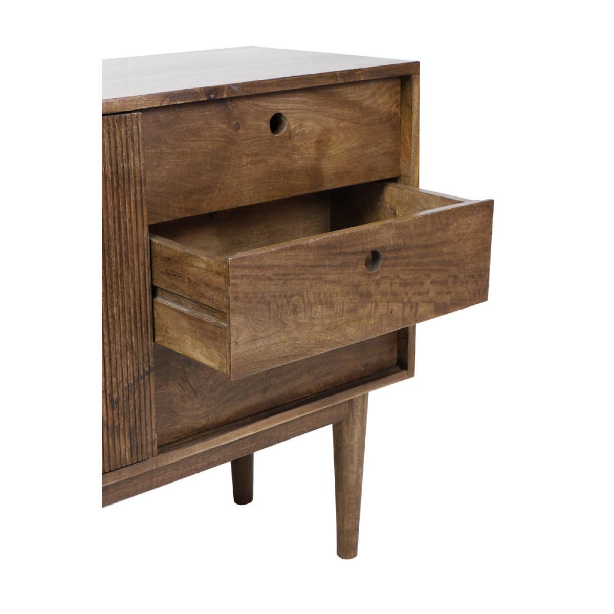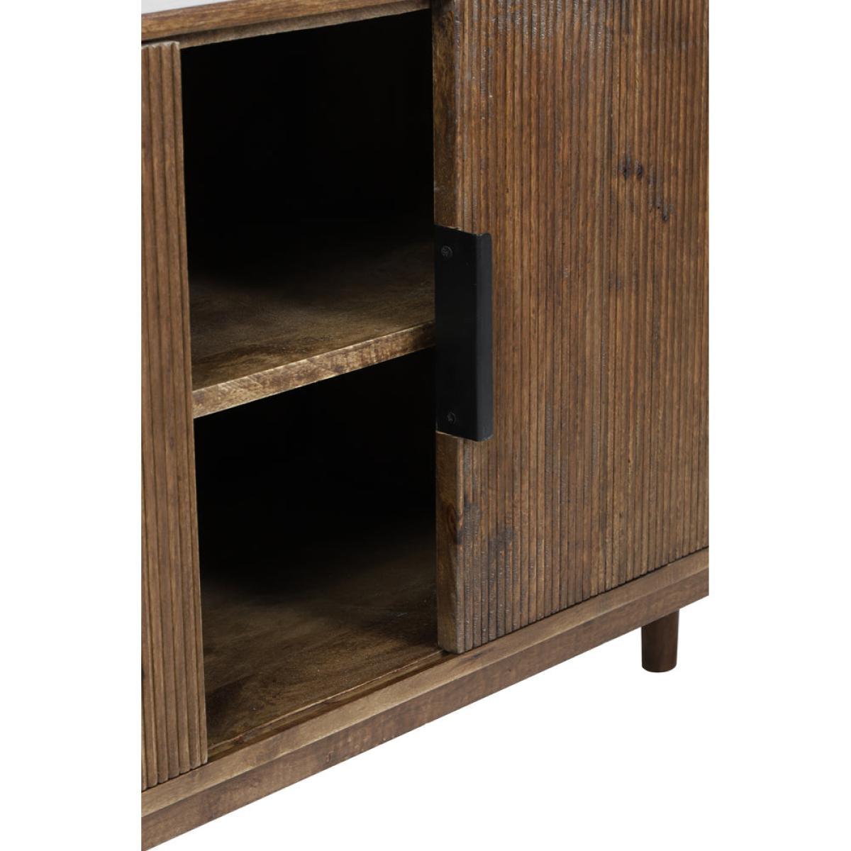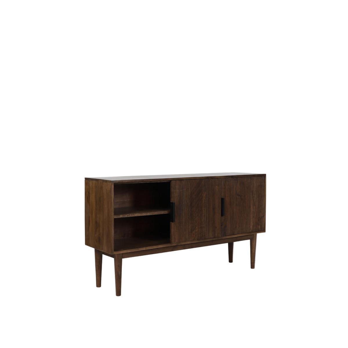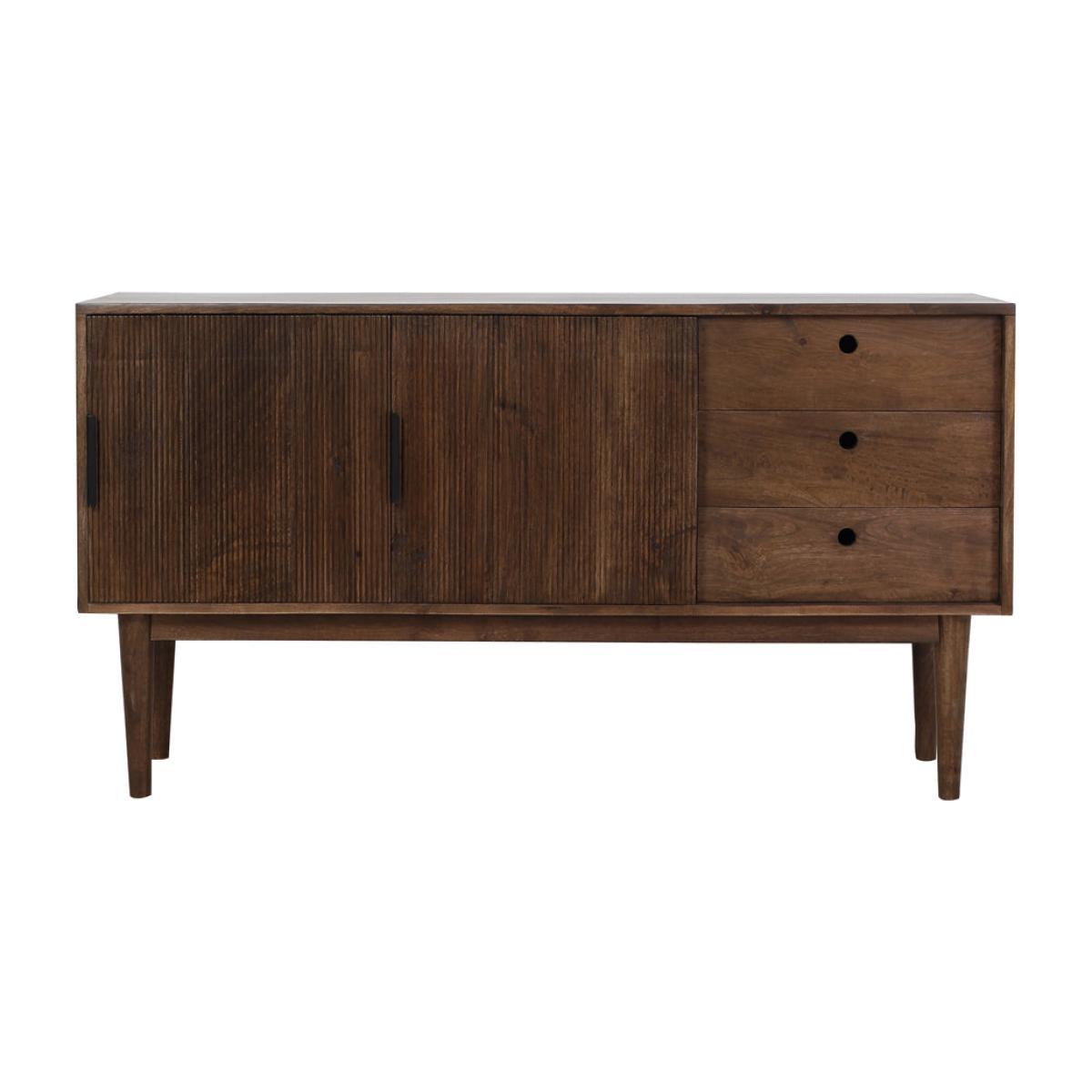 I love this sideboard-style drinks cabinet for its rich dark brown finish and clean-lined design, which makes it versatile enough to slot into both modern and traditional interiors. The natural wood grain adds warmth and texture, making it a practical yet stylish piece for a living room or dining area. It works particularly well in mid-century, Scandinavian, or industrial schemes. For styling, consider keeping it minimal with a few select bottles and glassware on top, and use the inside for organising more extensive liquor collections or accessories. Pairing it with brass or matte black accents can elevate its look, while a simple lamp or greenery can bring a touch of freshness. Overall, it’s a well-balanced piece that combines function with style.
