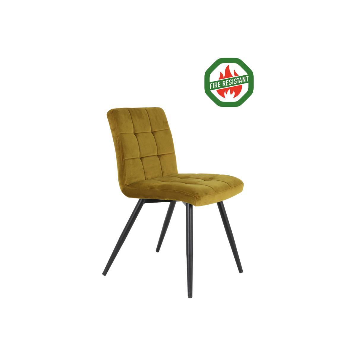 I love this chair for its bold colour combination and modern yet retro vibe. The ochre upholstery adds warmth and a touch of vibrancy, making it a great statement piece in both contemporary and eclectic interiors. It works well in kitchens with a muted or monochrome palette as a pop of colour, or alongside wood tones for a cosy, inviting look. Practical styling tips include pairing it with neutral or patterned tableware to highlight its colour and texture, and balancing it with minimalist or industrial surroundings to let it really stand out. The black legs introduce a sleek contrast that grounds the design, making it versatile enough to slot into various dining room styles while offering a comfortable seating option with added durability thanks to its fire-resistant fabric.