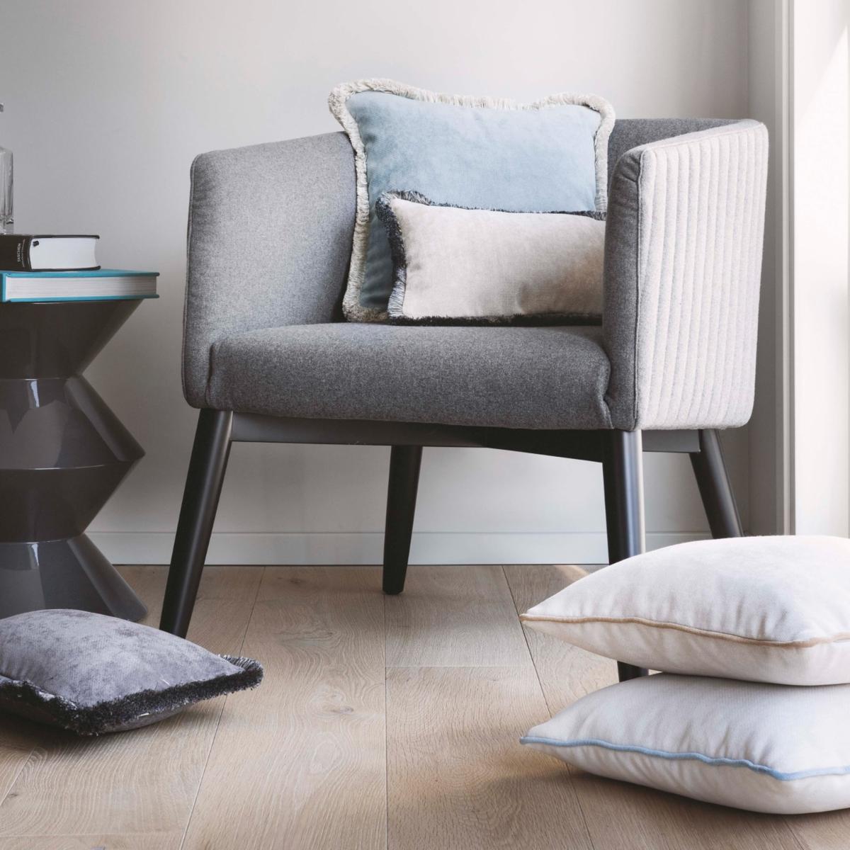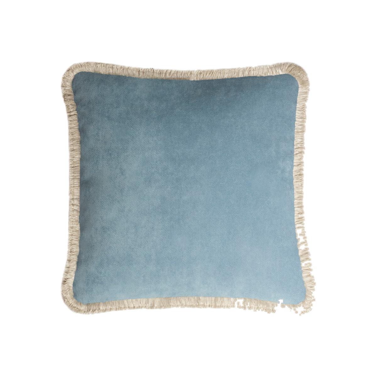 This elegant cushion from the Happy Pillow Collection is a romantic accent piece, that will make a glamorous statement in any interior decor. The antique-light blue hue of its removable velvet cover combines with the bold border of dirty white cotton trimming outlining its square silhouette. Padded with soft polyester fiber, this cushion is a mesmerizing example of Lo Decor's excellent quality standards. Removable and washable pillow cases with a stuffing. Light blue with dirty white fringe 40X40cm