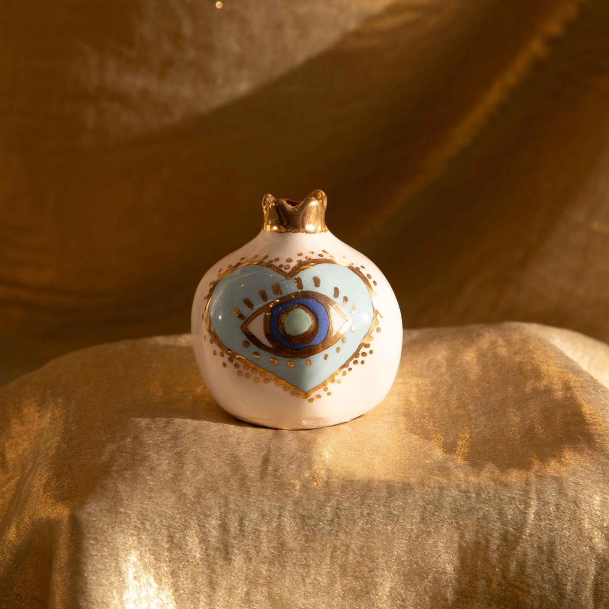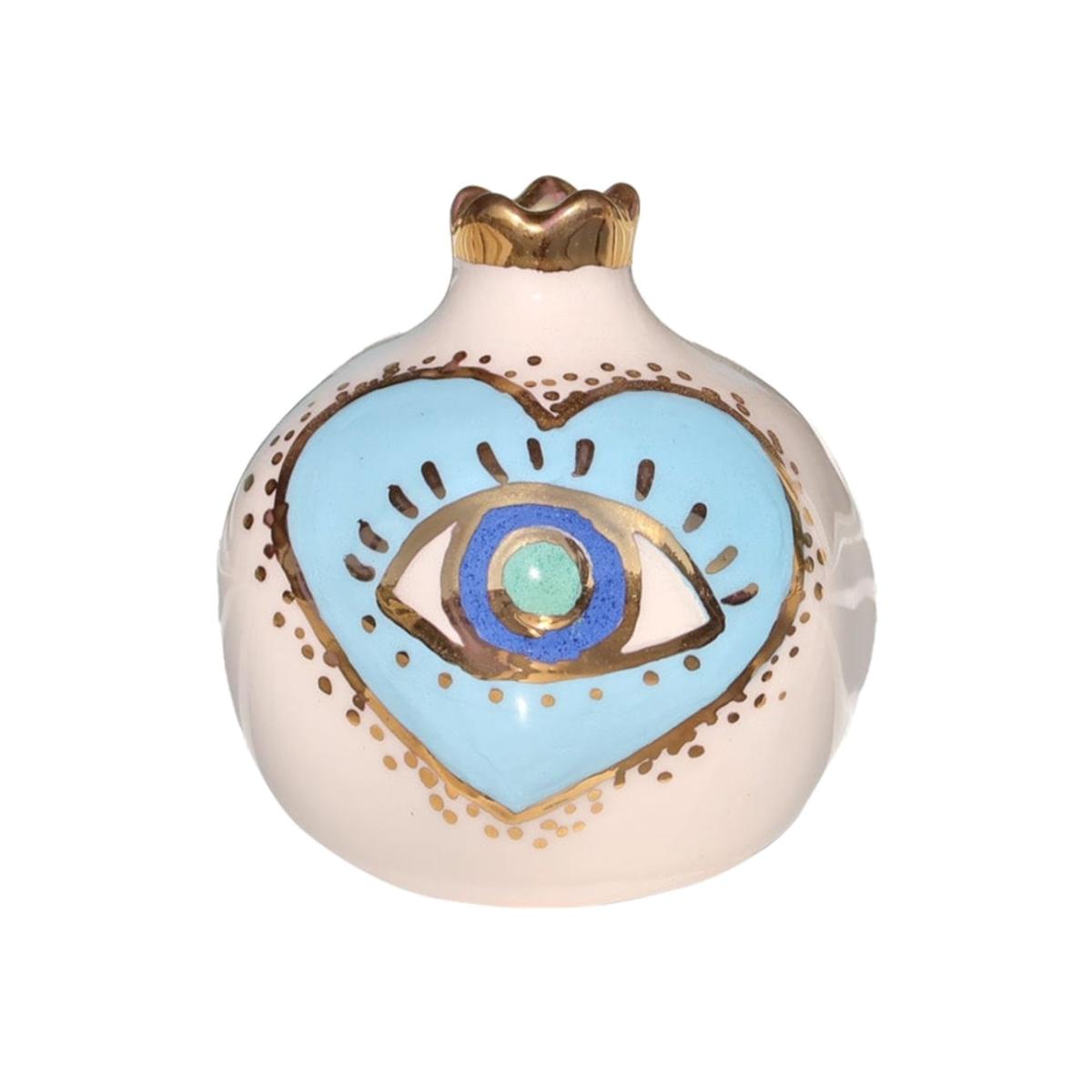 I love this Light Blue Heart Pomegranate. Its playful yet elegant design makes it a versatile piece for various interiors. It works particularly well in eclectic or bohemian spaces, where it can serve as a focal point on a bookshelf or side table. For styling tips, try pairing it with natural textures like wood or woven items to highlight its artisan feel, or place it alongside other colourful accents for a lively display. Its eye-catching eye motif adds a hint of quirky personality-so it’s perfect for spaces where you want to introduce a unique, artistic touch without overwhelming the decor.