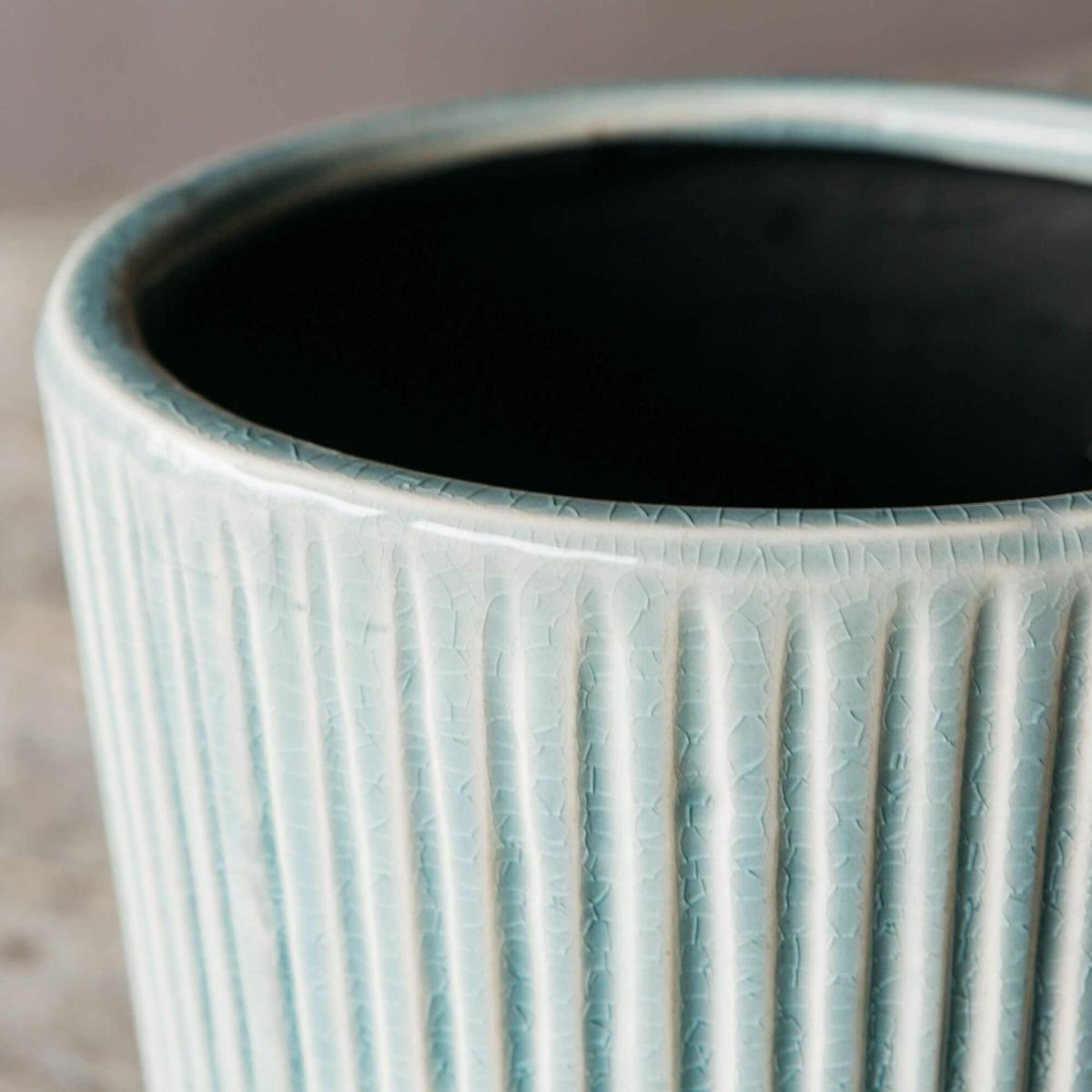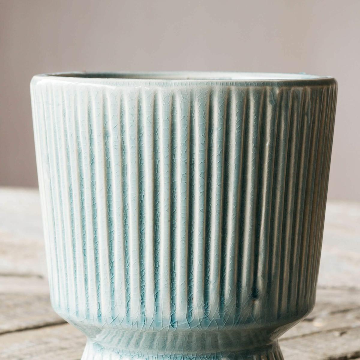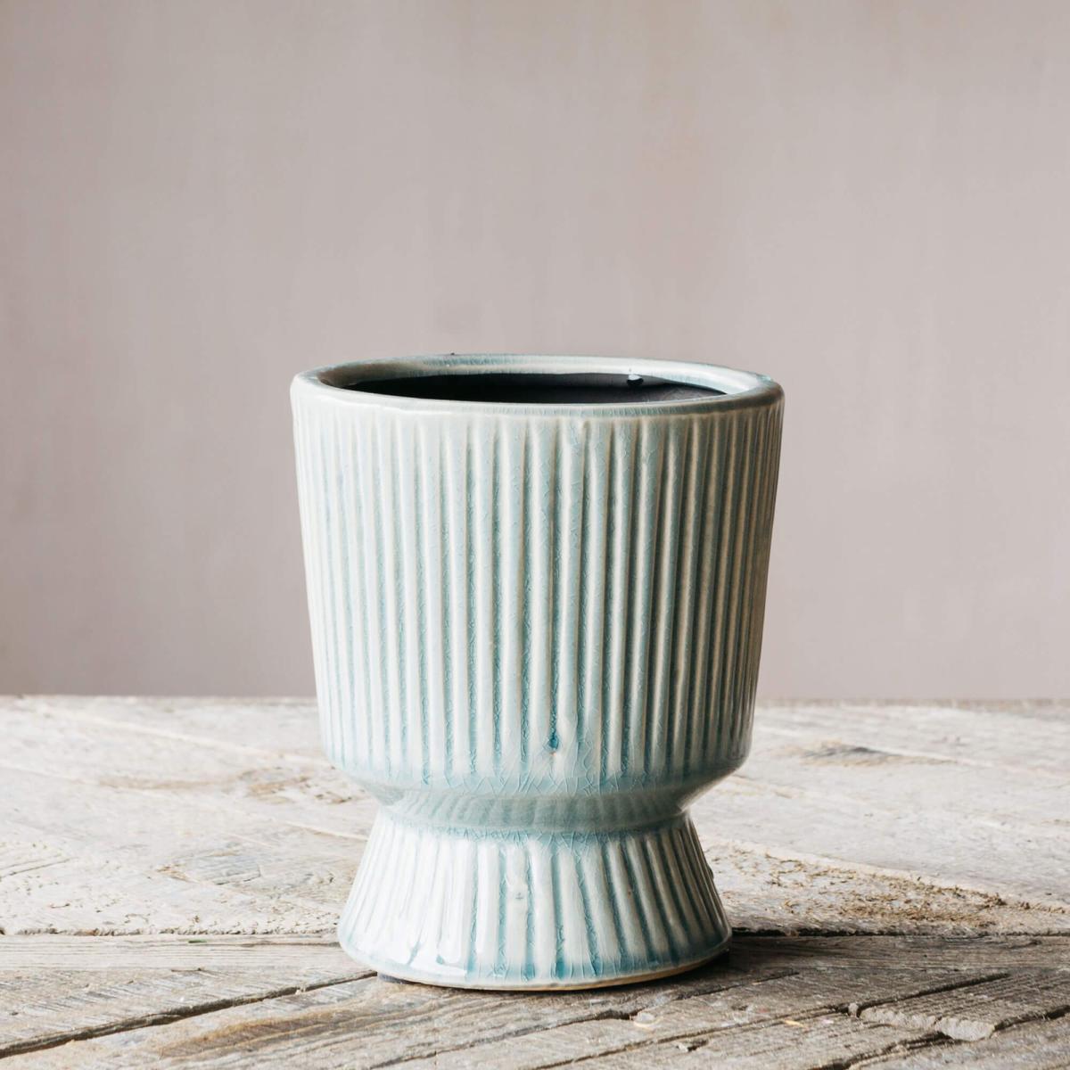 A ribbed design with a pale blue glaze, fill with your favourite overflowing foliage.