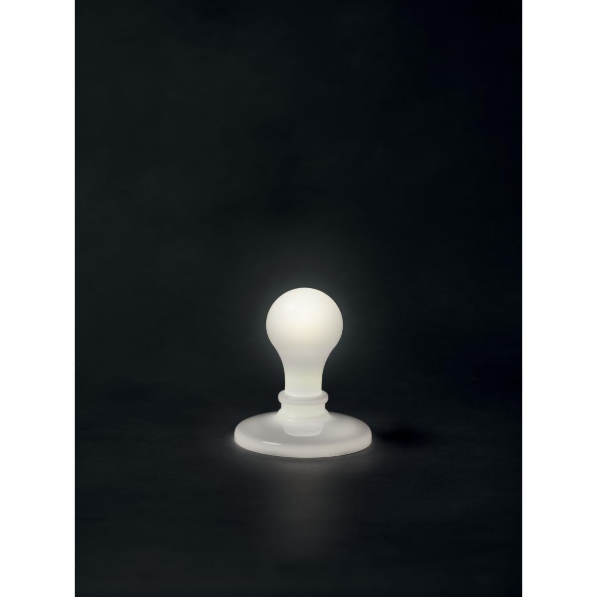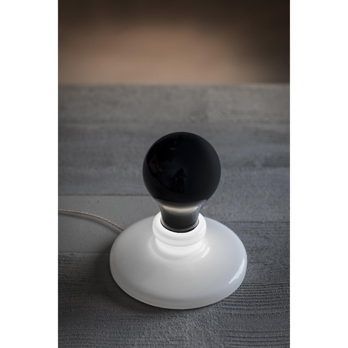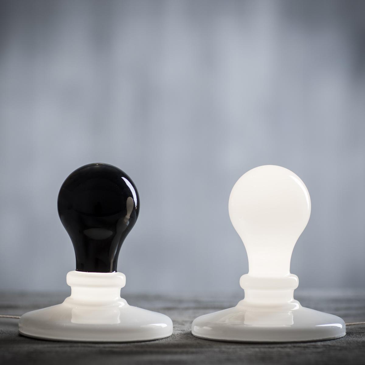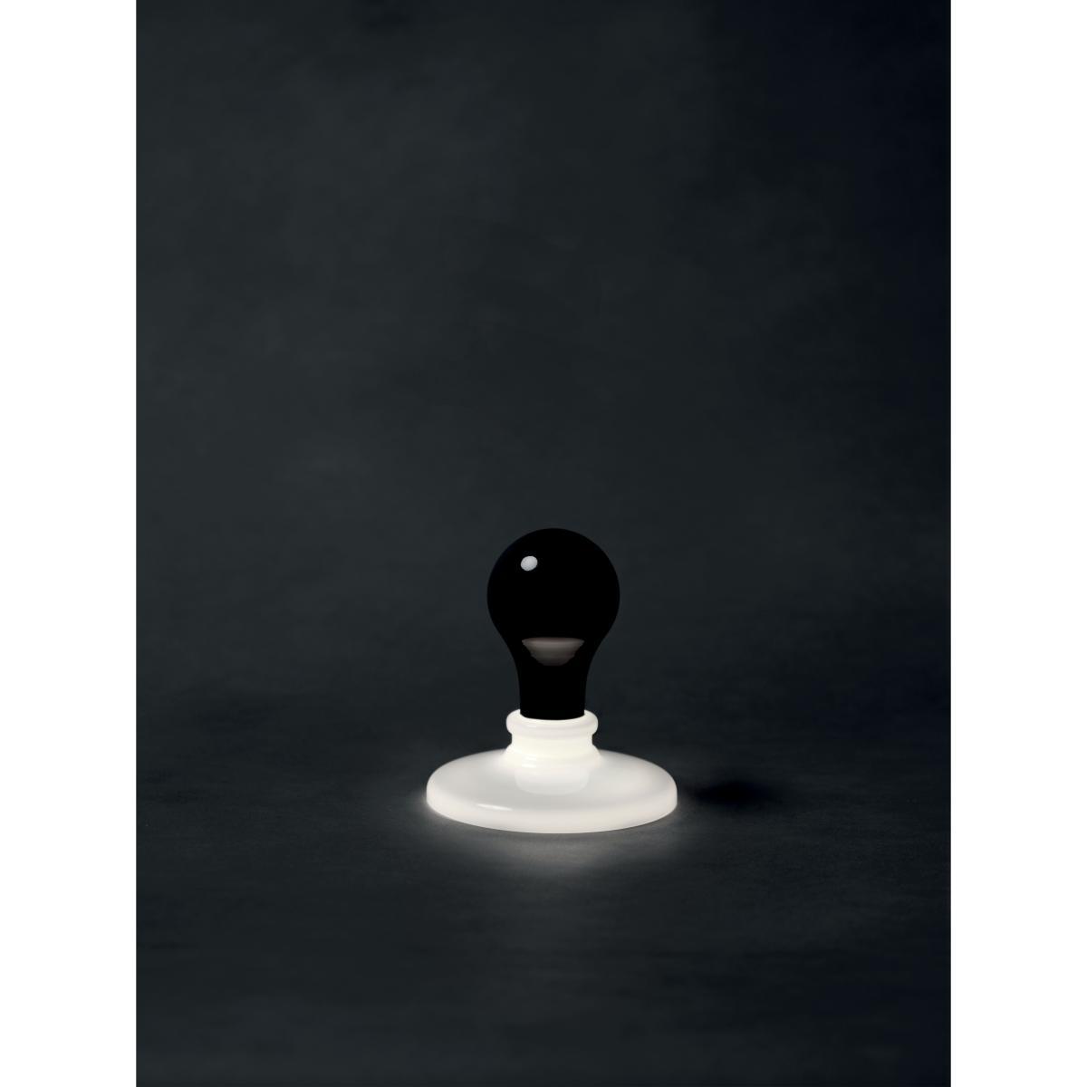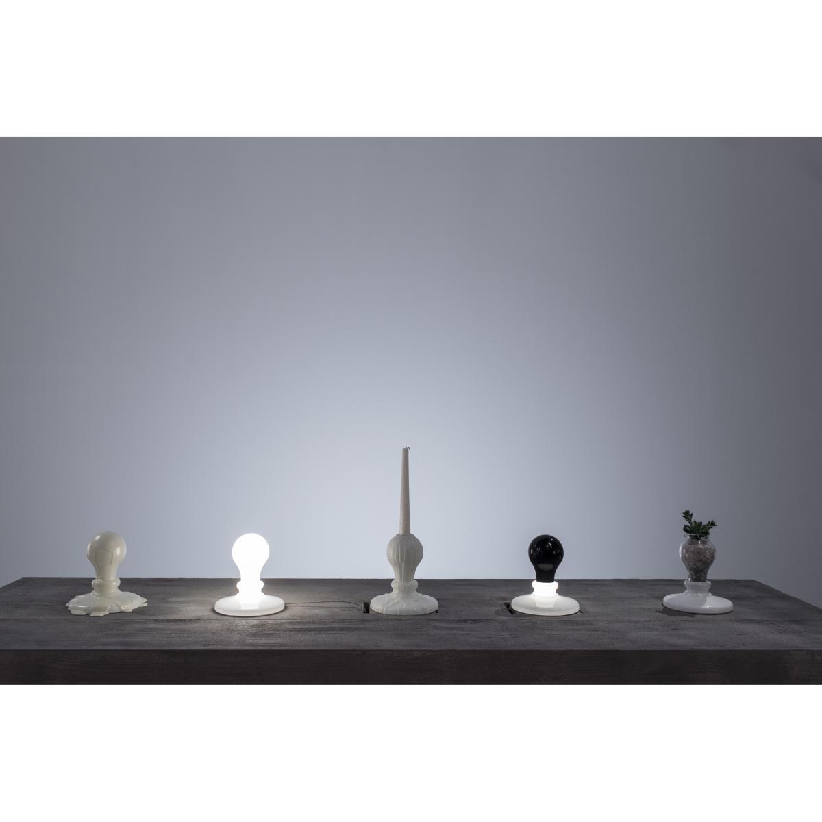A sculptor turned architect, American James Wines is also a distinguished professor and philosopher of architecture. A leading figure in environmental design and organic architecture, James Wines has received numerous awards and been the subject of several exhibitions (MoMA and Withney Museum in New York, Victoria & Albert Museum in London, etc). Despite its historical importance, the work of James Wines remains relatively unknown in France. Intentionally provocative, his offbeat humour should not, however, cause us to forget the seriousness of his work, which raises ecological or philosophical issues. This lamp is part of the "Light Bulb Series" project initiated by James Wines in 1991. The artist reflects on the light bulb as an archetype, typically recognisable by its pear shape, which results in a series of surprising objects that blur the line between art and design. The classic shape of the incandescent bulb was initially dictated by the function and technology available at its creation. This form remained constant for decades during which the shape became etched in the collective memory. Technical developments, and in particular LED technology, now make it possible to produce bulbs of all shapes, signifying the end of the globe bulb. But this shape is so ingrained in our culture that it remains omnipresent. James Wines addresses these considerations through the main themes that have always guided his architectural research: inversion, dissolution, nature and all the states of "architectural defect" which allow us to rethink reality by making borders and time disappear. Composed of a few carefully selected pieces produced in limited, numbered edition, the “Light Bulb Series” collection includes different versions of the bulb as an icon. This collection invites us to think of a world of the possible where we can always imagine different ways of producing light. These creations explore subconscious expectations and reactions to everyday objects and experiences, and invite art to where it is least expected. Made of blown glass (with a circular base of lacquered aluminium), Light Bulb lamps faithfully reproduce the shape of a classic incandescent bulb, with a glass globe encased in a socket. These glass bulbs, simply placed on metal discs, evoke old candle holders. This set consists of two models: Black Light (black bulb) and White Light (white bulb). The Black Light model offers an inversion of the functions and parts of the traditional lamp. Here, it’s the lamp holder (the translucent glass socket) that emits light, while the bulb's globe remains black and opaque. The White Light model represents for James Wines: “the matrix, the basic icon still intact, an object that has become the archetype of illumination. ”.