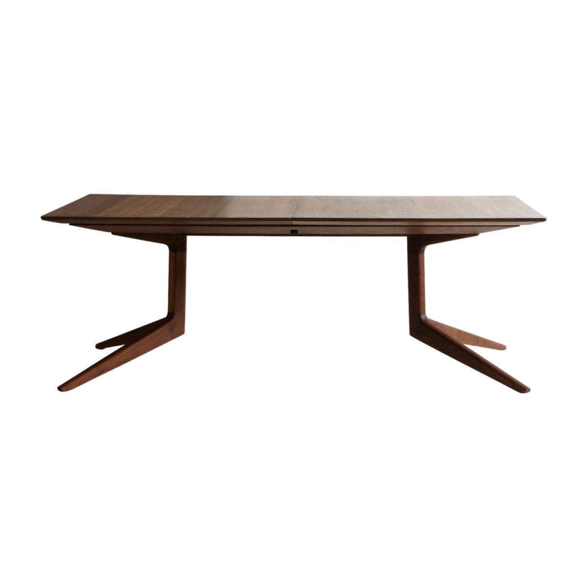 Crafted from rich American walnut wood and finished in Danish oil, the Light Extending Table is designed by Matthew Hilton and has a clean, sculptural silhouette. Created by artisan furniture craftsmen, the table has an angular form, enhanced by its distinctive legs that provide additional leg room while lending understated opulence to an interior. When no longer required, the table's two extending components can be conveniently stowed in its interior fabric-lined compartment. Perfect for enhancing a contemporary dining space, the Light Extending Table comfortably seats 12-14 dinner guests when extended, making it the ideal option for spontaneous dinner parties while also being the perfect size for everyday family dining.