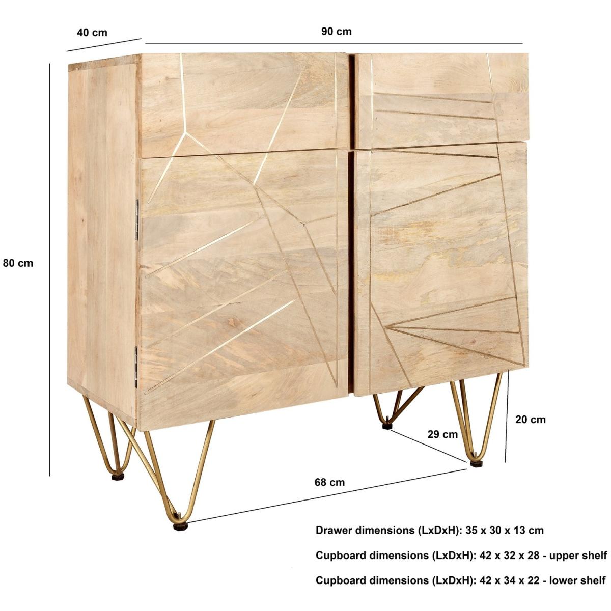 The elegance of this 2 door sideboard is really something to see. Along with being an extremely versatile piece of handmade furniture its style and quality stand out in any room it's situated. Handmade from solid Mango wood and reclaimed metal this stunning sideboard with 2 doors shows the natural features and grain of the wood complimented by a feature inlay of gold embossed metal to the front. All drawers have a chamfered edge, so no handles are necessarily giving a sleek symmetrical look. The legs are metal, finished with a gold coating to complete the look. There are so many ways to use the internal storage with 2 good sized drawers and 2 cupboards with shelves which can be removed if a larger space is required. Matching items are available in this range to provide a stylish look and feel to your home.
