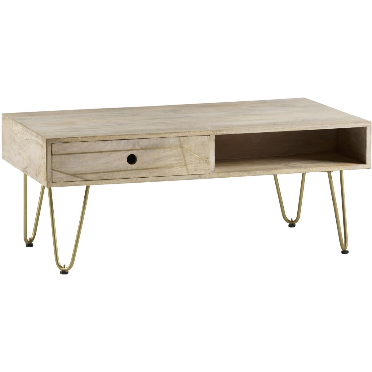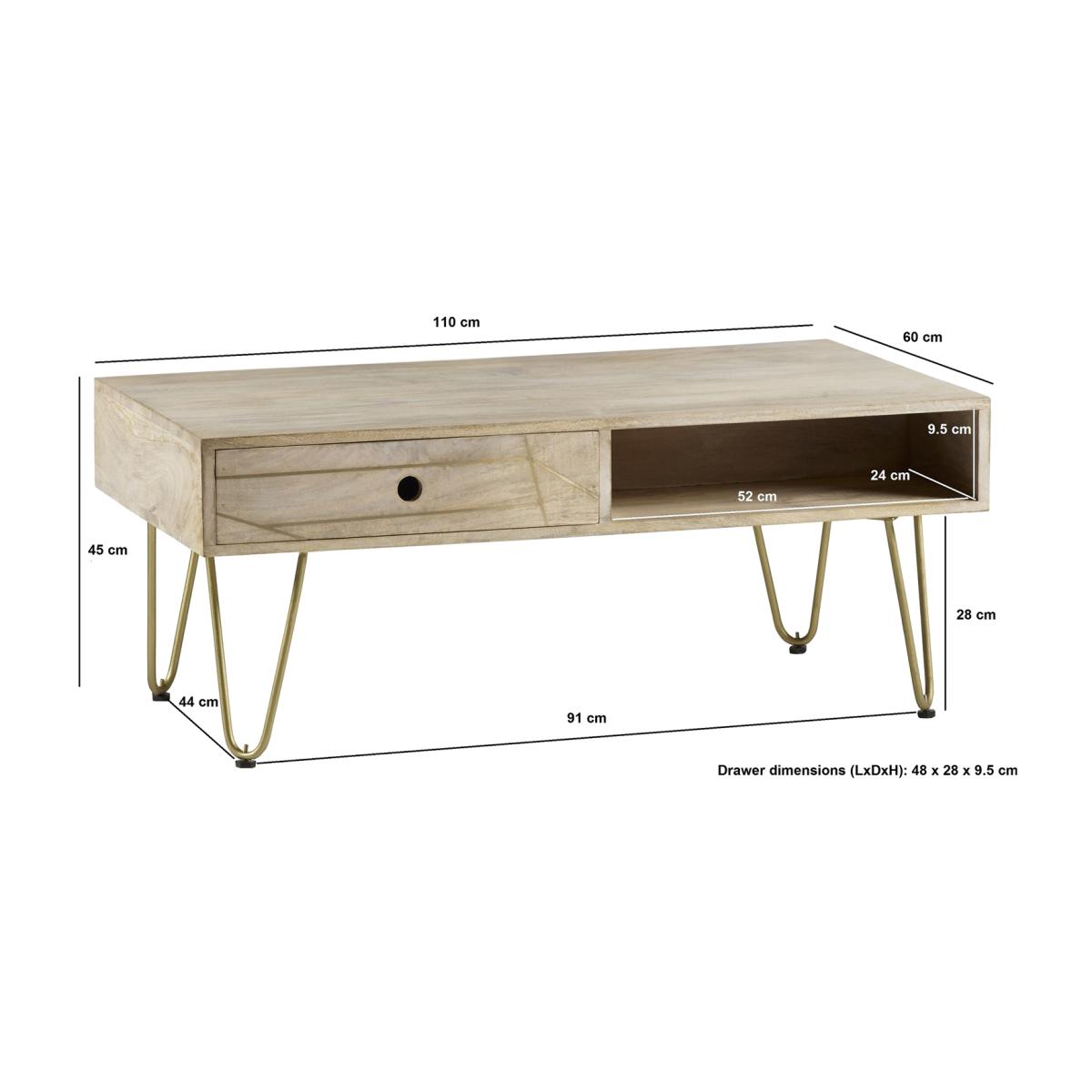 Handmade from solid Mango wood and reclaimed metal this stunning coffee table with drawer allows the natural grain of the wood to show whilst adding a feature inlay of gold embossed metal to the top. It is an extremely versatile piece of furniture that will fit into any surrounding decor and is sure to be a topic of conversation with any visiting guests. This coffee tabletop offers ample space to serve coffee, afternoon tea or evening cocktails. The sleek design has a smooth finish with a quality feel and boasts a spacious drawer providing good storage for magazines, TV remotes etc to declutter your room. Please view the matching items in this range to complete your ideal space to relax.