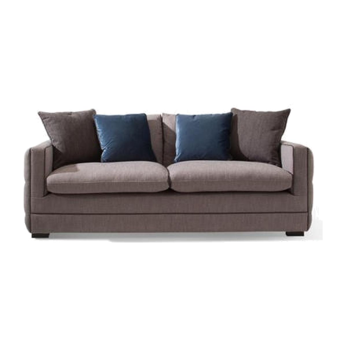 I really like this light grey three-seater because of its versatile, neutral tone which makes it a great foundation for various interior styles. The deep button arms add a touch of classic sophistication, while the colour works well in both contemporary and traditional spaces. It pairs effortlessly with colour pops such as the blue cushions shown here, or can be kept minimal with a monochrome palette for a sleek look. Practical styling tips include adding textured throws or patterned cushions to add visual interest, and balancing it with surrounding furniture in warmer woods or metals to prevent it from feeling too cold or stark. This sofa’s clean lines and understated elegance make it a flexible piece that can anchor your living room effortlessly.