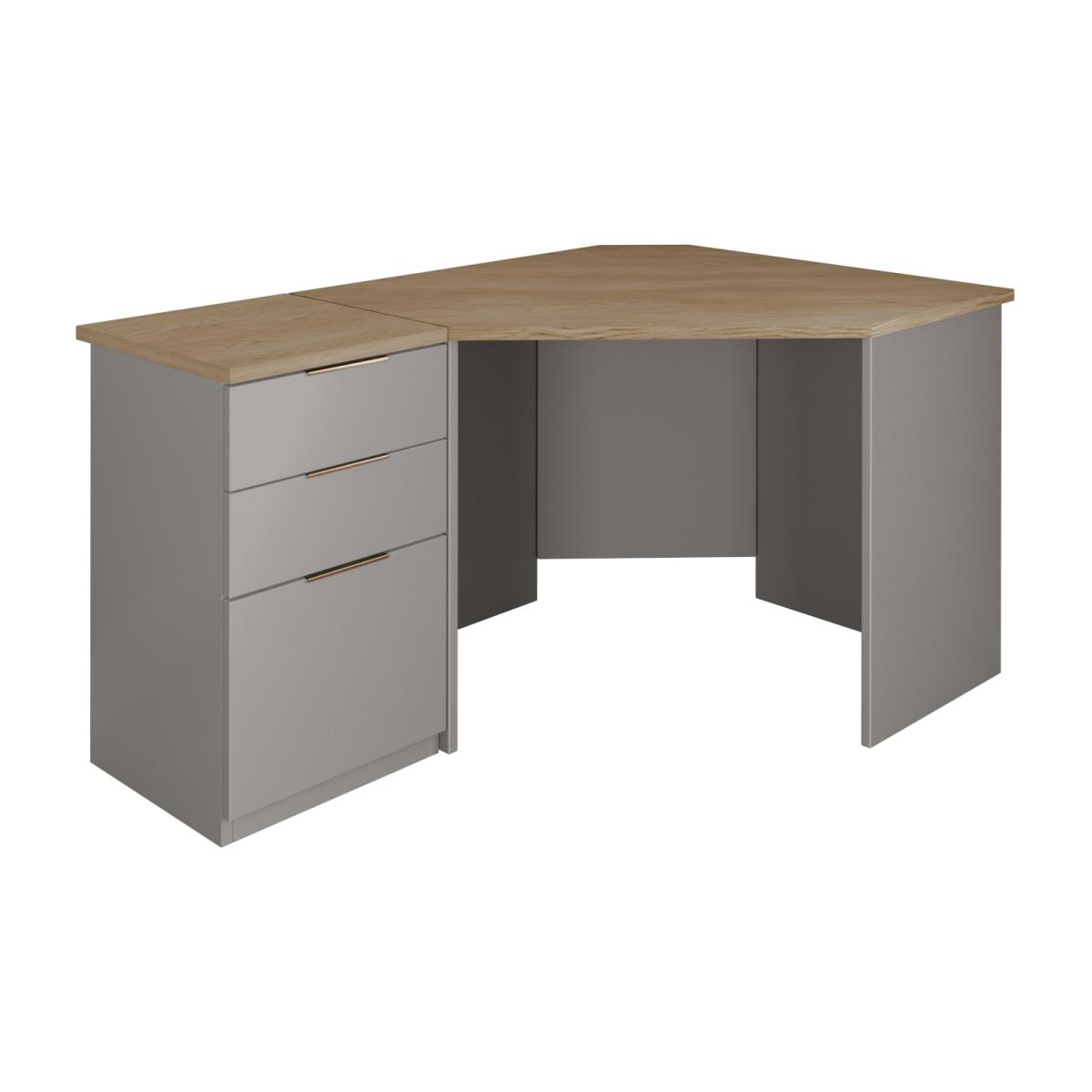 Dimensions:H76 x W136 x D100 cm A ready to assemble corner desk and filing cabinet set for the home office. Packageprovidespractical storage and makes fora great working space. Features: Finished in a stylish light grey painted effect with light oak effect tops Manufactured in a robust, easy-clean, surface resistant material 25mm thick tops with durable edging and 18mm thick back panels for rigidity Adjustable foot levellers allow for uneven floors Easy assembly