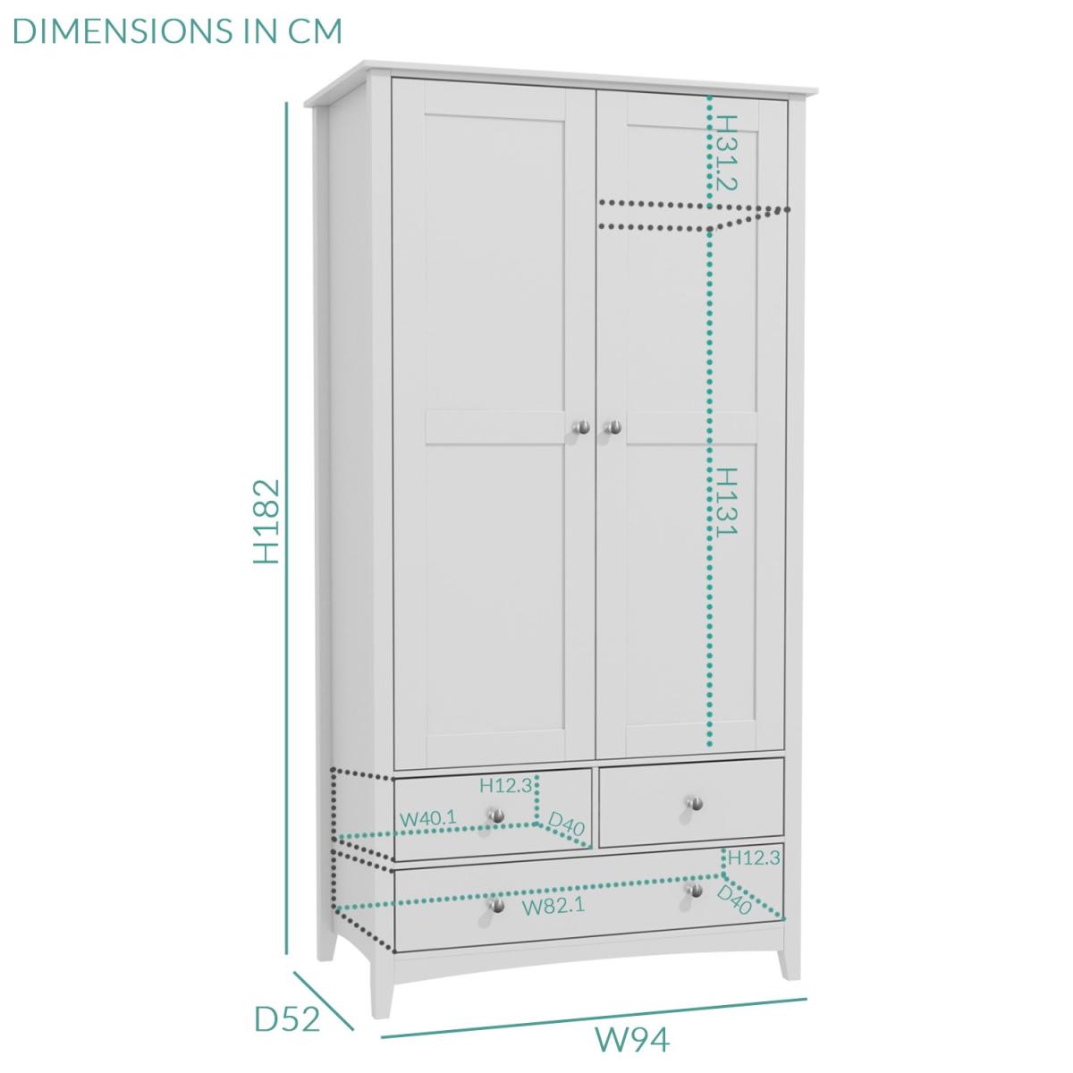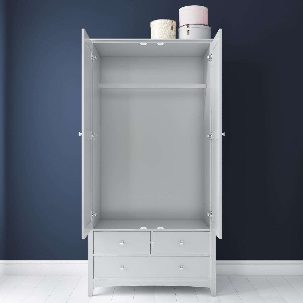 Features we love Light grey lacquered finish brightens up any room1 full width drawer to store your folded items2 drawers to keep your smaller delicate essentials. Shiny chrome drawer handles add a nice touch to the simple styling All about me. A girl can never have enough clothes but they can be sure of plenty storage with this super spacious wardrobe. Inside you'll find a top shelf and single hanging rail for you to pick out your favourite items quickly and crease free ready to wear straight away! The wardrobe also features two useful drawers for your smaller items and a full width drawer to store larger things like jumpers and joggers. It's beautifully finished with a neutral light grey painted lacquer that'll blend seamlessly with any setting. The Wardrobe is also raised from the floor so that it is easy to get underneath and clean. The wardrobe is part of the Finch collection contemporary Shaker style furniture for the bedroom. All pieces are made from solid MDF and pine construction that looks great and will last for years to come. Essential info H182cm x W94cm x D52cm. Part of the Finch Collection. Self-assembly required. Number of drawers 3. Colour light grey lacquer finish. Made from a solid MDF and pine construction1 year warranty.