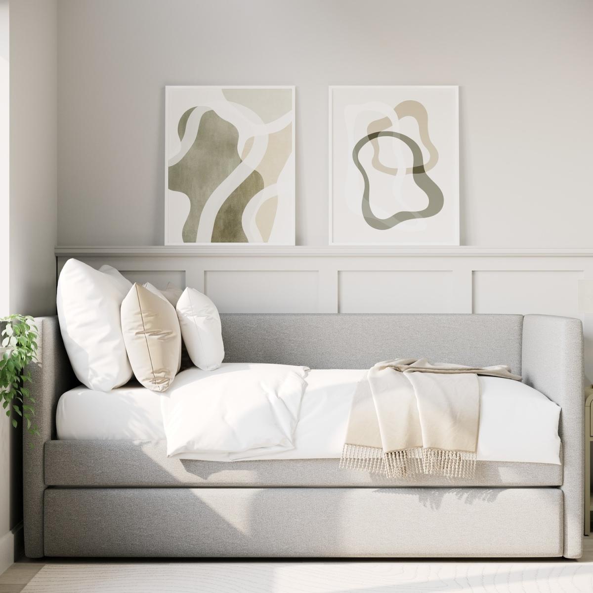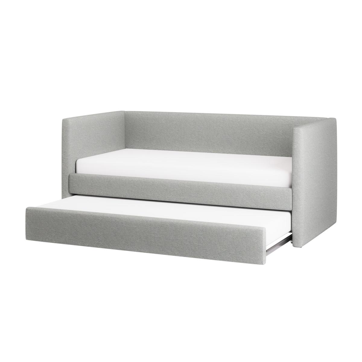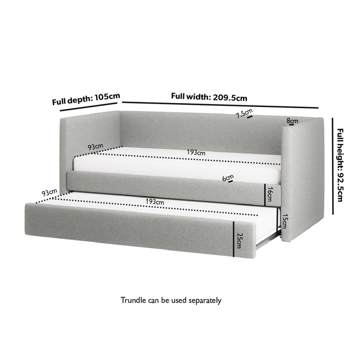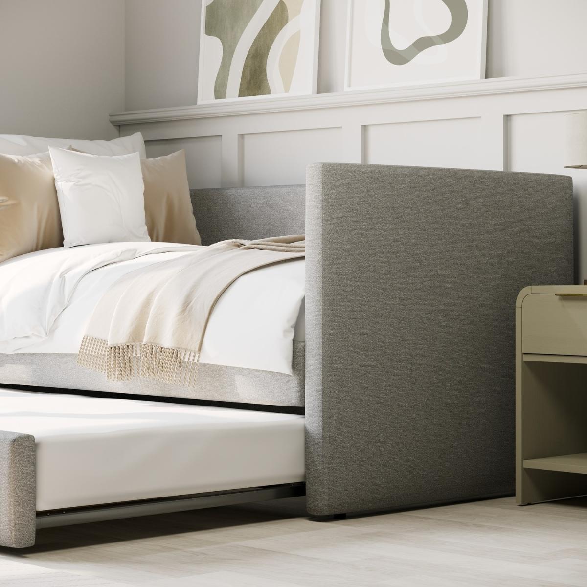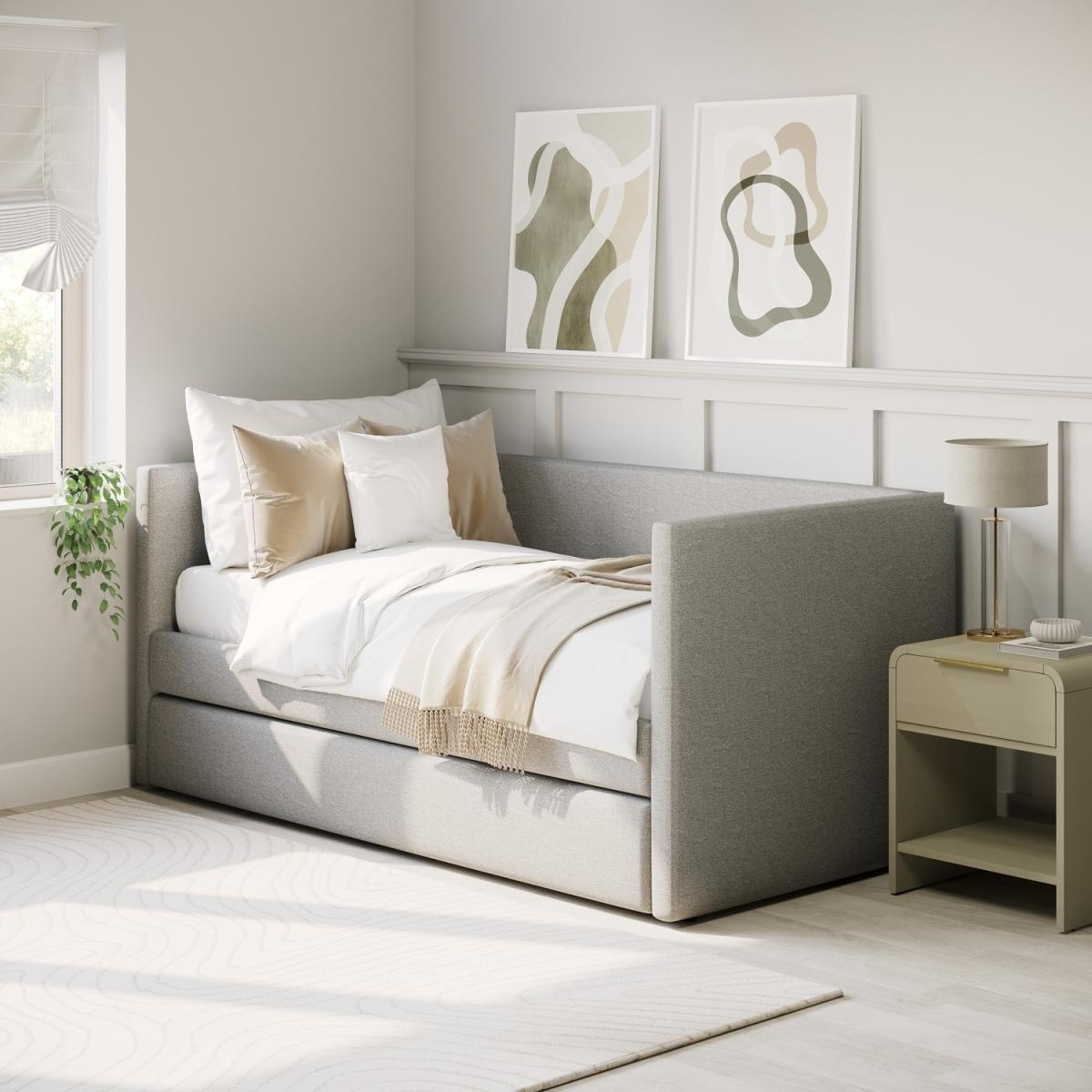 With its sleek, minimalist design and soft textured light grey fabric, this day bed adds modern elegance to any space. Provides comfortable seating by day and transforms into two cosy sleeping spaces by night. Designed for restful sleep, this bed offers better support and comfort than a traditional sofa. The pull-out trundle maximises space while ensuring comfort, making it ideal for small apartments, guest rooms, or multipurpose spaces. Crafted from high-quality materials, it's built to last ensuring long-term reliability. The Amie Day Bed with Trundle is the perfect blend of style and practicality, making it a great addition to any home. Upholstered in soft-touch light grey fabric, it adds warmth to your space. During the day, it’s a comfy spot to relax, and at night, it easily transforms into two cosy sleeping spaces. The smooth pull-out trundle provides extra room for guests, making it a perfect choice for small rooms, guest areas, or multifunctional spaces.