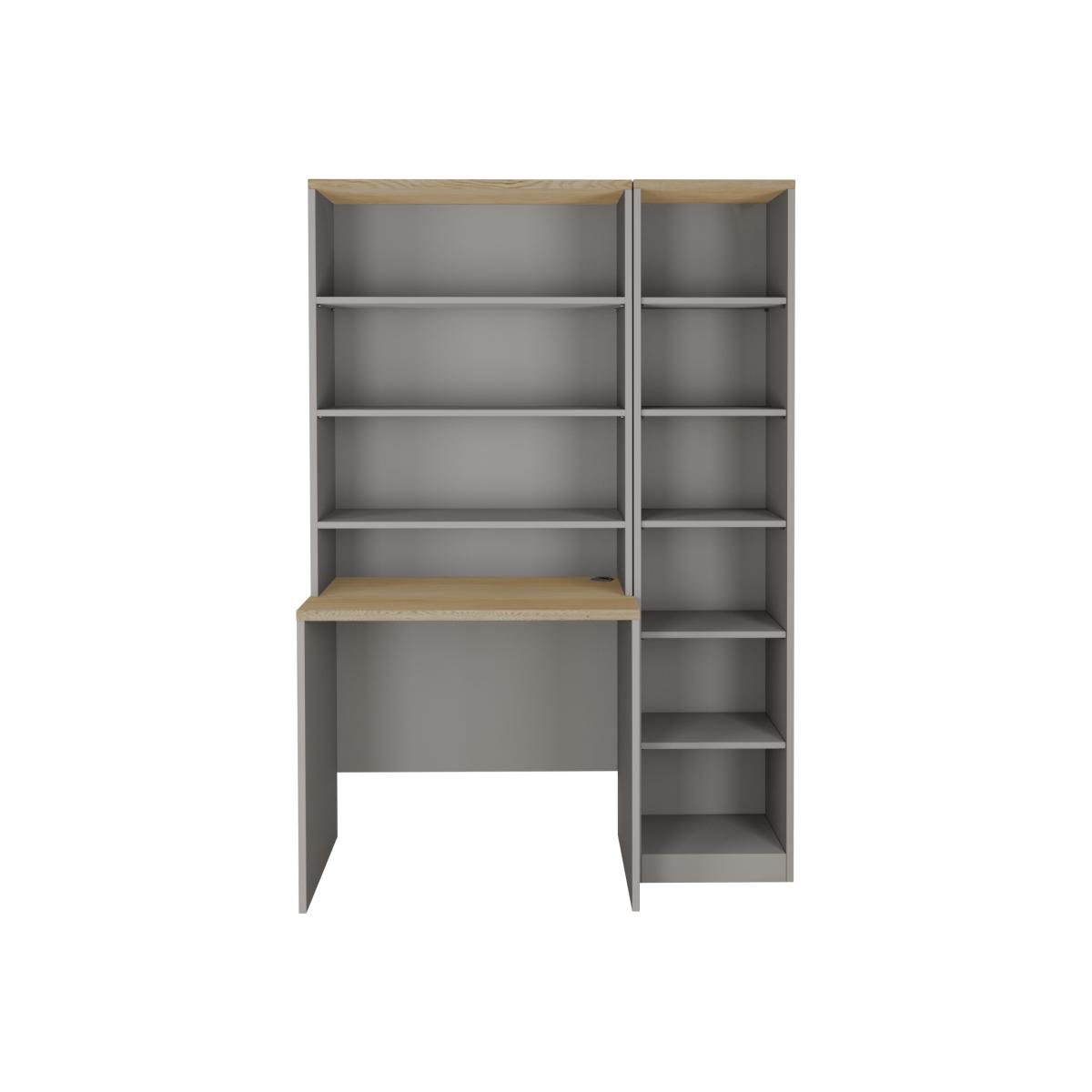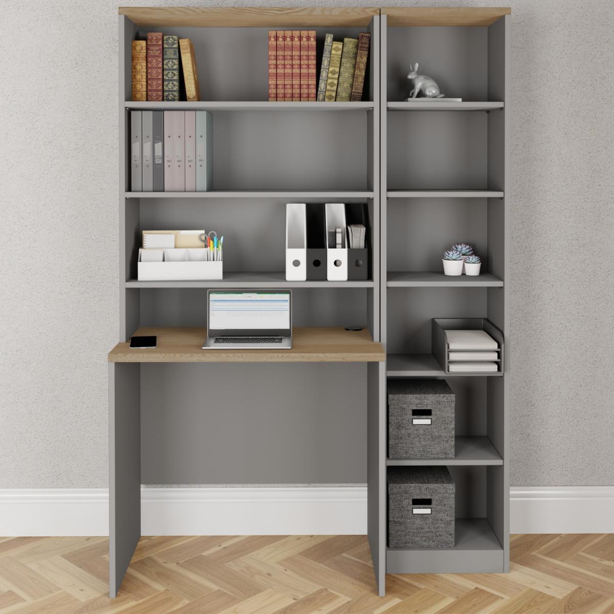 Dimensions:H185 x W120 x D46 cm A ready to assemble desk and 2 bookcases set for the home office. Package provides practical storage and creates a great working space. Features: Finished in a stylish light grey painted effect with light oak effect tops Manufactured in a robust, easy-clean, surface resistant material 25mm thick tops with durable edging and 18mm thick back panels for rigidity Adjustable foot levellers allow for uneven floors Easy assembly