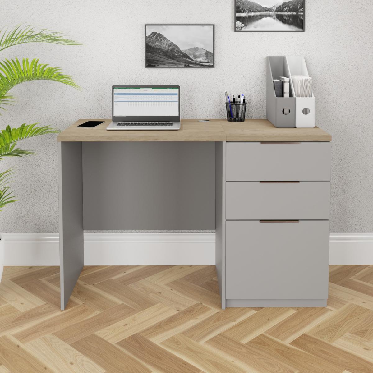 Dimensions:H76 x W106 x D46 cm A ready to assemble desk and filing cabinet set for the home office. Package provides practical storage and creates a great working space. Features: Finished in a stylish light grey painted effect with light oak effect tops Manufactured in a robust, easy-clean, surface resistant material 25mm thick tops with durable edging and 18mm thick back panels for rigidity Adjustable foot levellers allow for uneven floors Easy assembly