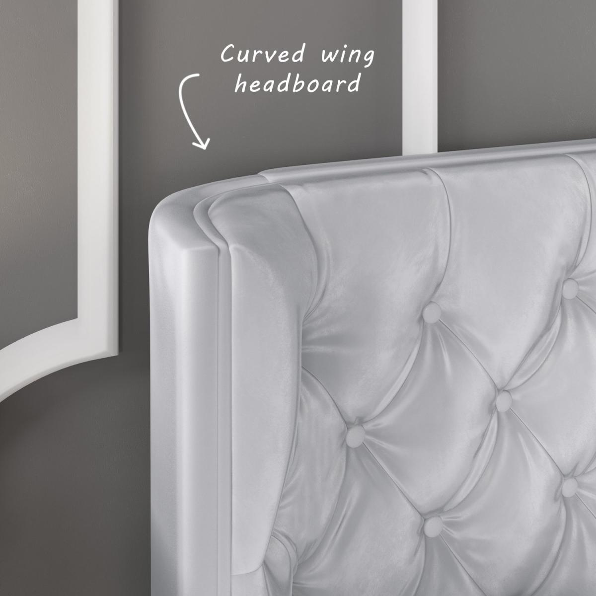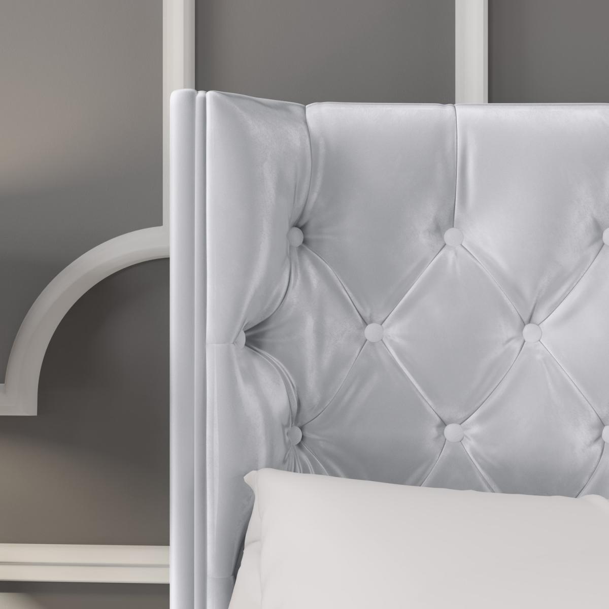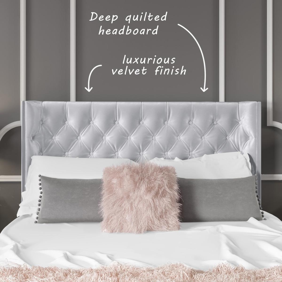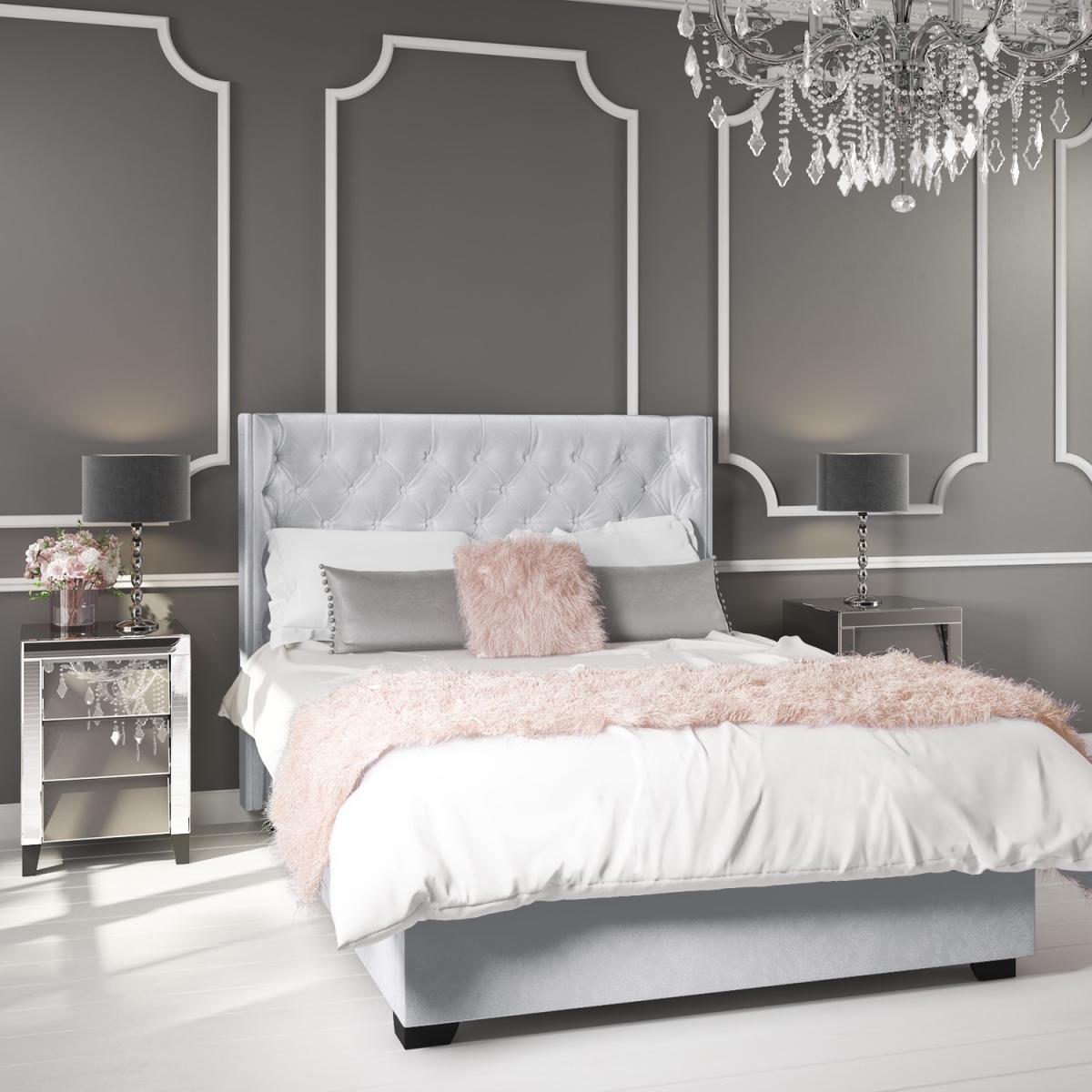 This sumptuously upholstered ottoman double bed combines style and storage to help you make the most your space. It features an elegantly curved winged headboard that gentle sweeps around the head of the mattress to create a cosy and inviting feel to your bedroom. The fully upholstered headboard comes with traditional buttoning detailing that not only gives the bed a luxurious look it also adds comfort, making it great for propping yourself up in bed and relaxing in front of the TV or getting cosy with a good book. When it comes to storage, you're spoilt for space! The sprung slatted frame can be easily raised to reveal the entire space beneath the mattress to discreetly store away absolutely anything from spare towels and bedding to an unsightly suitcase. Accessing your stored items is effortless as this front opening storage space has a gas lift mechanism for all the heavy lifting. The bed is made with a durable wooden frame, padded and then upholstered with silver grey velvet. It has a wooden slat, sprung frame for great mattress support and central bar legs for added support and durability. Unlike some other ottomans, this Milania bed features a solid base that allows you to store more without damaging your flooring or carpet. It's more hardwearing than fabric based beds too, so you can enjoy added peace of mind that it will last you for years to come.
