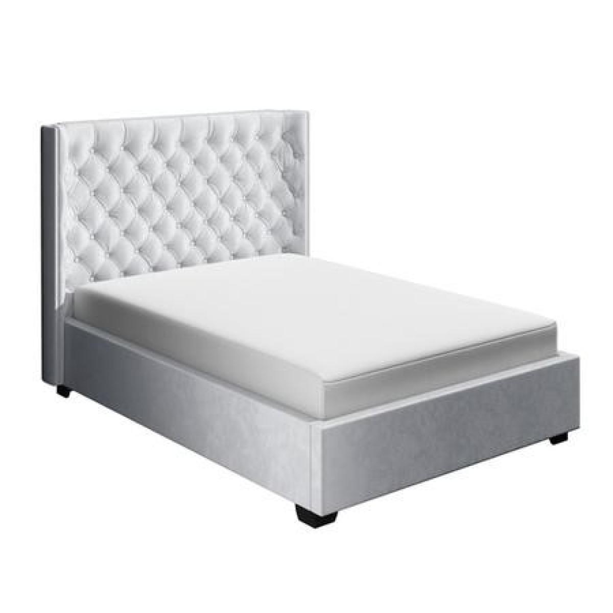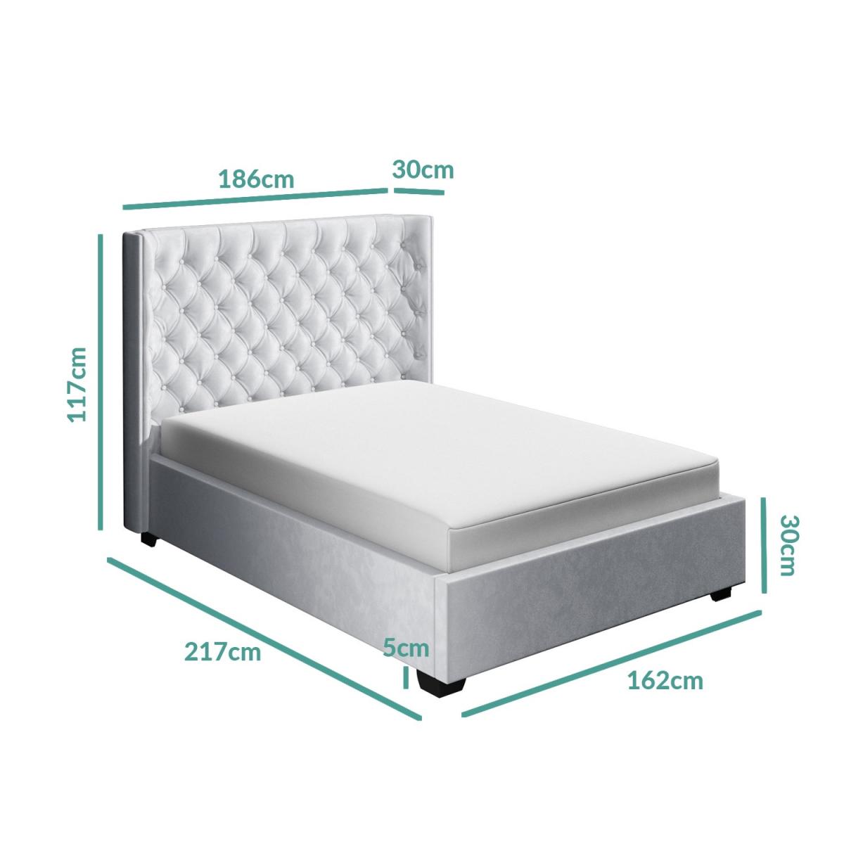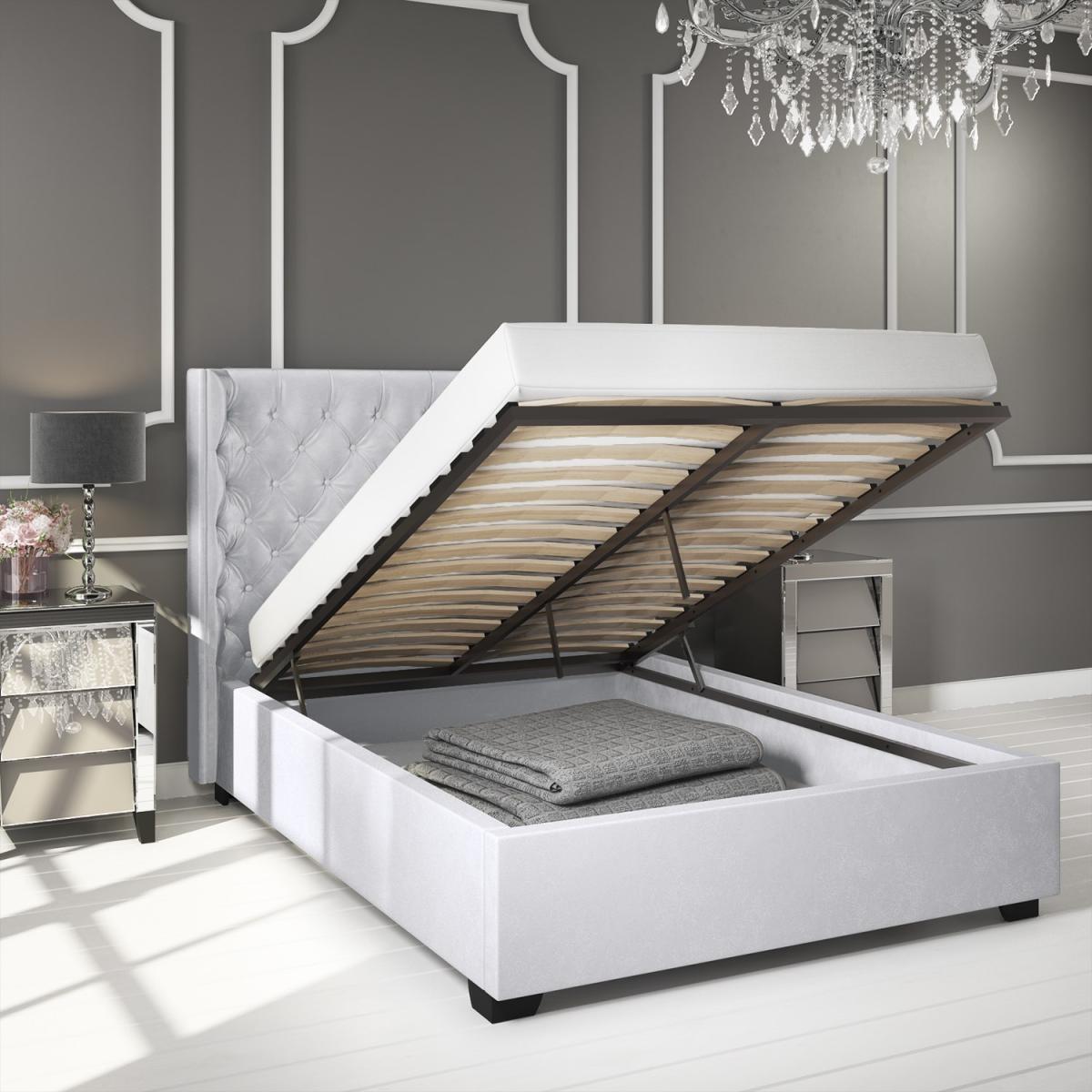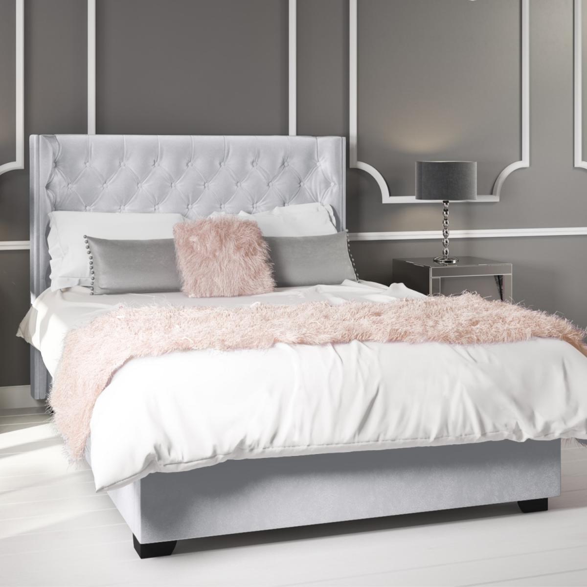Features we love The curved winged headboard adds an instant touch of glamour and grandeur to your bedroom. The plush velvet upholstery and deep buttoning detailing is both comfortable and stylish Easy access front opening storage space with gas lift mechanism. Plenty of storage space the entire area beneath the mattress can be used. Its solid base helps to protect your flooring also helping to protect your items from dust Grey finish makes it easy to coordinate with other bedroom furnishings and décor styles. The tall deep button quilted headboard is great for comfortably propping yourself up All about me. This sumptuously upholstered ottoman King bed combines style and storage to help you make the most your space. It features an elegantly curved winged headboard that gentle sweeps around the head of the mattress to create a cosy and inviting feel to your bedroom. The fully upholstered headboard comes with traditional buttoning detailing that not only gives the bed a luxurious look it also adds comfort making it great for propping yourself up in bed and relaxing in front of the TV or getting cosy with a good book. When it comes to storage you're spoilt for space! The sprung slatted frame can be easily raised to reveal the entire space beneath the mattress to discreetly store away absolutely anything from spare towels and bedding to an unsightly suitcase. Accessing your stored items is effortless as this front opening storage space has a gas lift mechanism for all the heavy lifting. The bed is made with a durable wooden frame padded and then upholstered with silver grey velvet. It has a wooden slat sprung frame for great mattress support and central bar legs for added support and durability. Unlike some other ottomans this Milania bed features a solid base that allows you to store more without damaging your flooring or carpet. It's more hardwearing than fabric based beds too so you can enjoy added peace of mind that it will last you for years to come. Need to know. Size. Standard UK King (5ft) Dimensions. H117 x W186 x D217 cm Storage Dimensions. W152 x D202 x H20 cm Headboard. H117 x W186 cm x D30cm Base. Solid Material. Metal and; wood frame Finish. Silver grey velvet. More info. Easy to open gas lift front opening ottoman storage. Tall statement curved wingback headboard with stud quilting. Wooden slatted bed base with central leg support. Durable wooden storage base. Fits a standard UK King size mattress (5ft)Mattress not included.